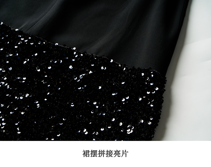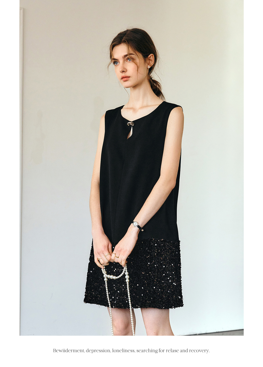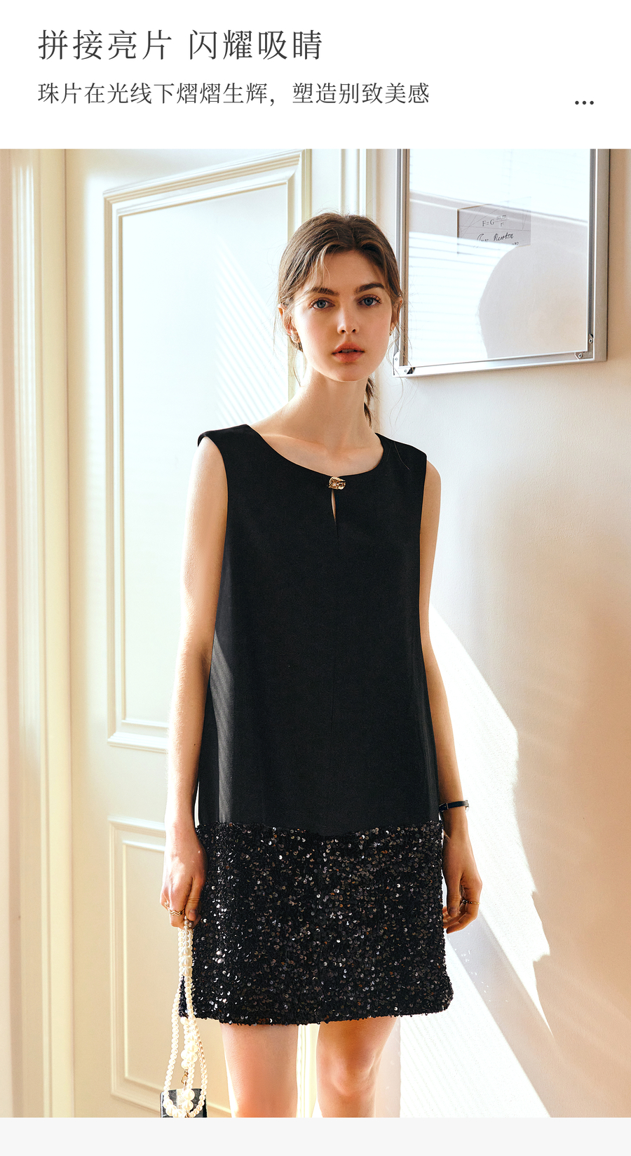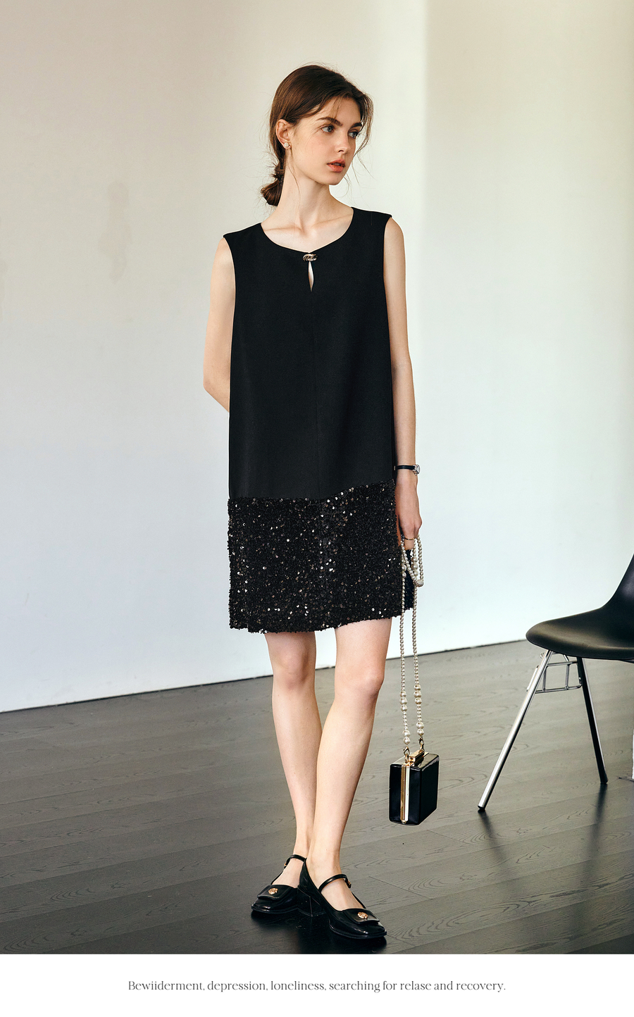 OLrain欧芮儿法式黑色连衣裙女春季2025年新款无袖拼接亮片短裙