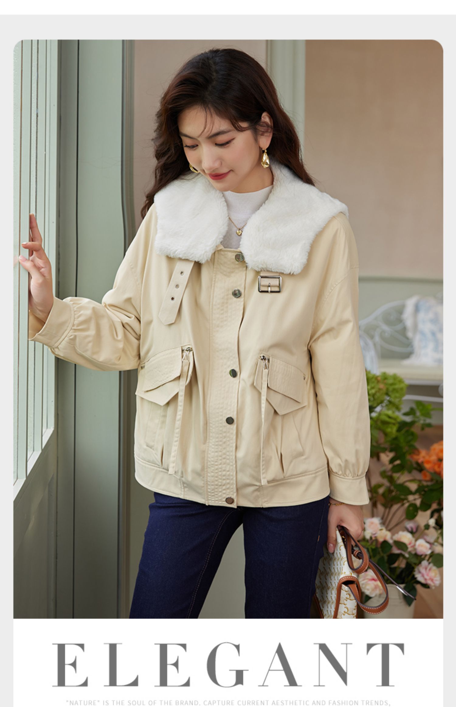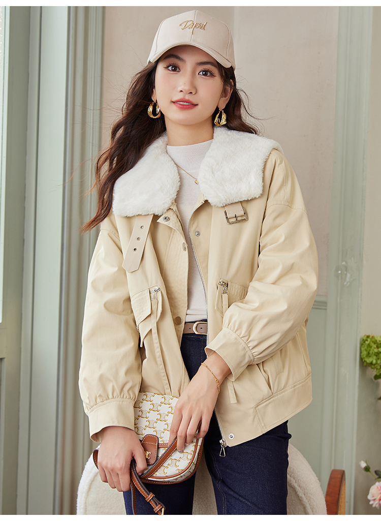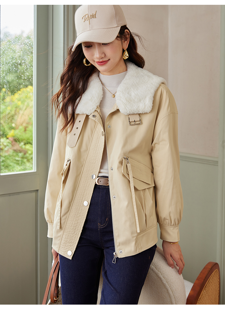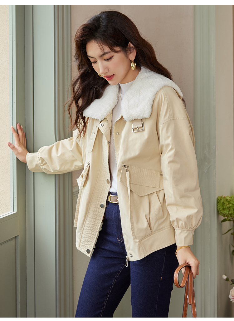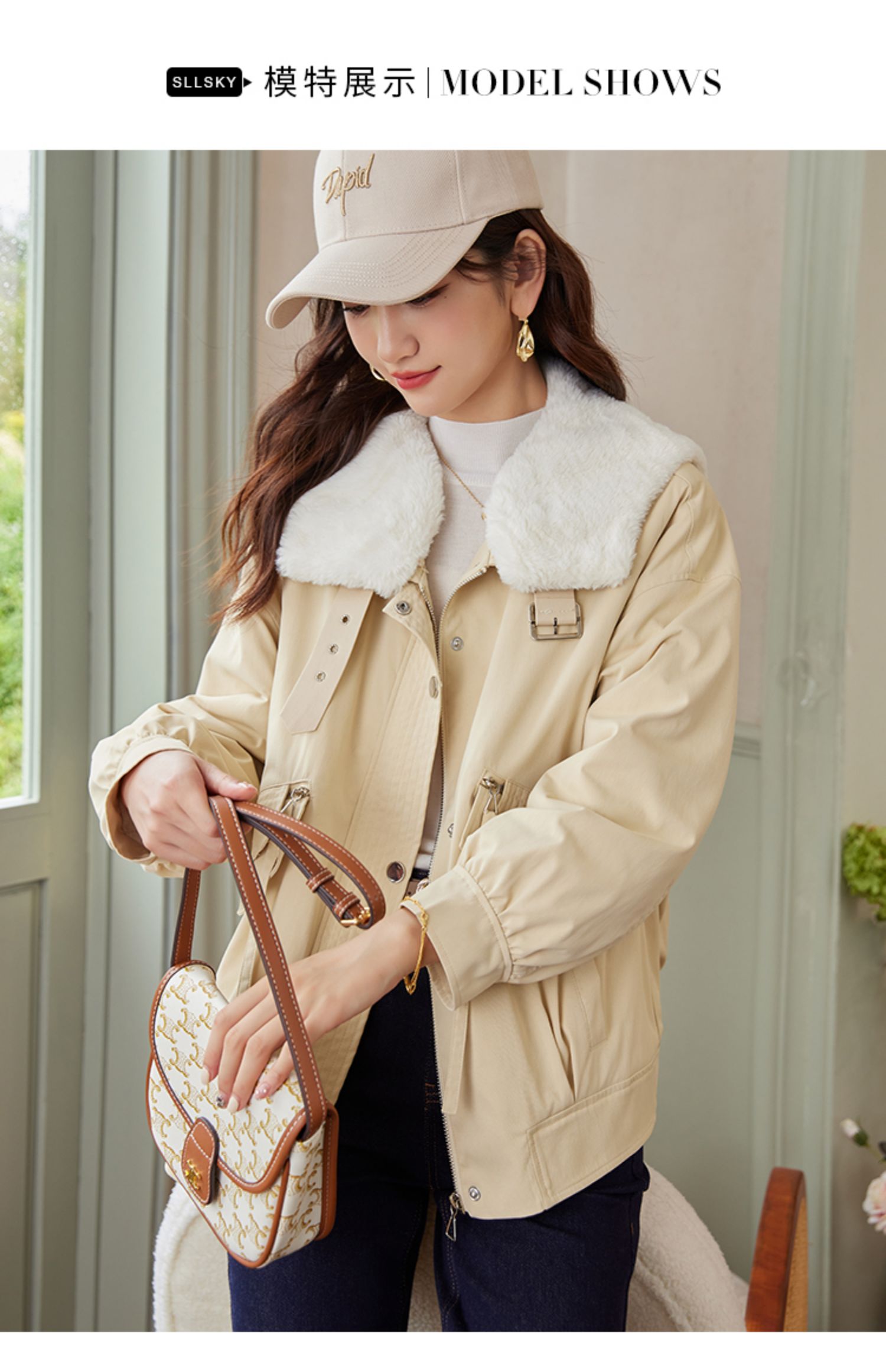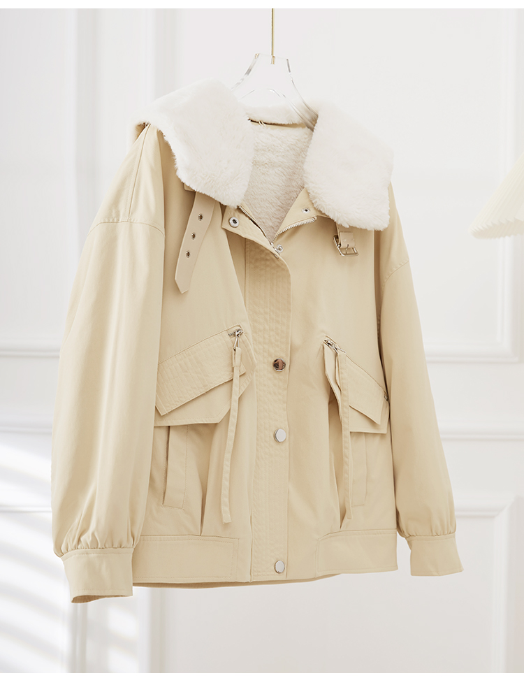 【专属特惠】熙世界酷飒仿兔毛翻领工装外套女秋冬新款内里加绒加厚短款派克服