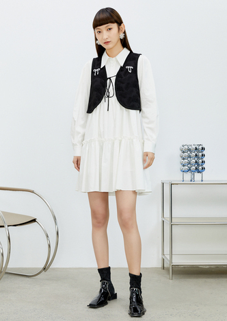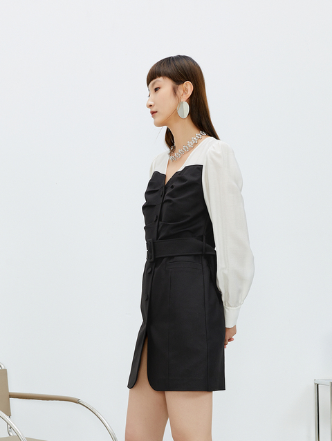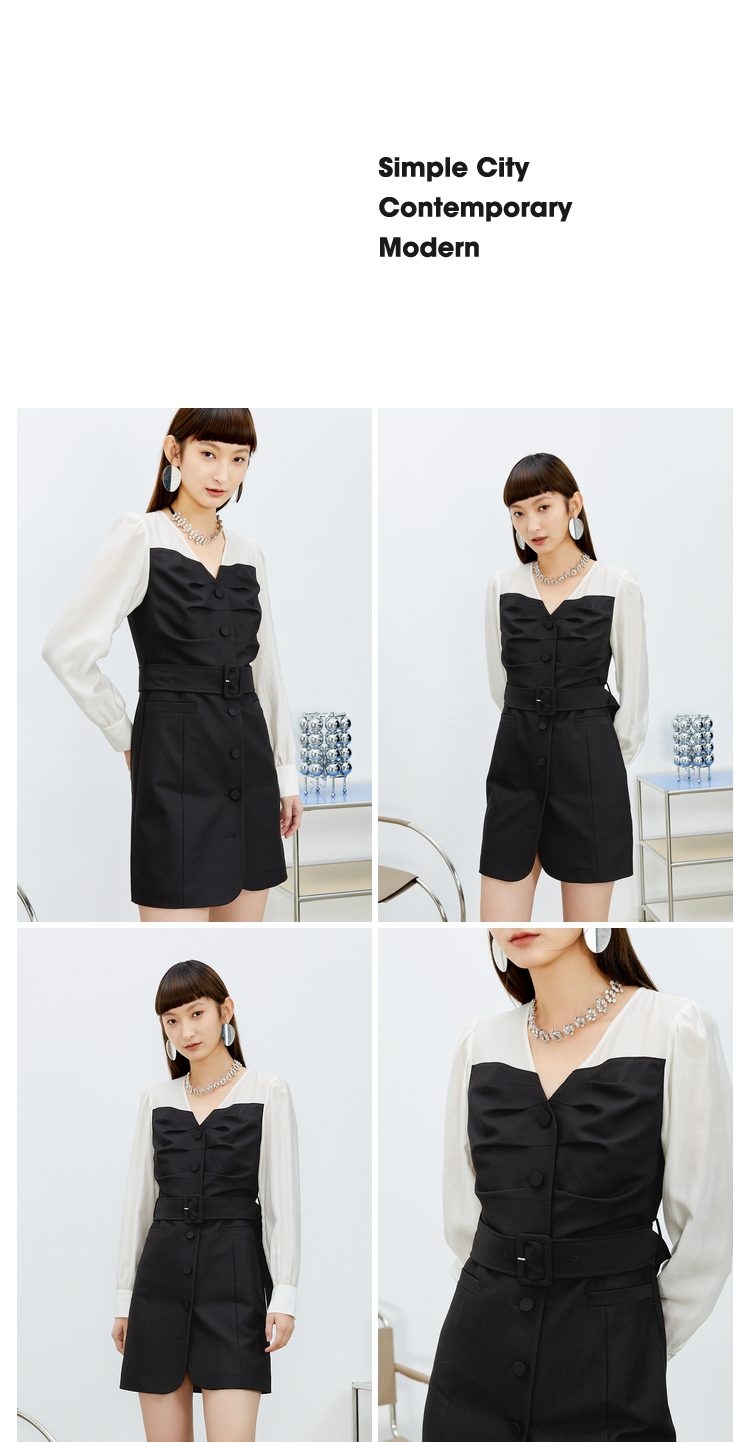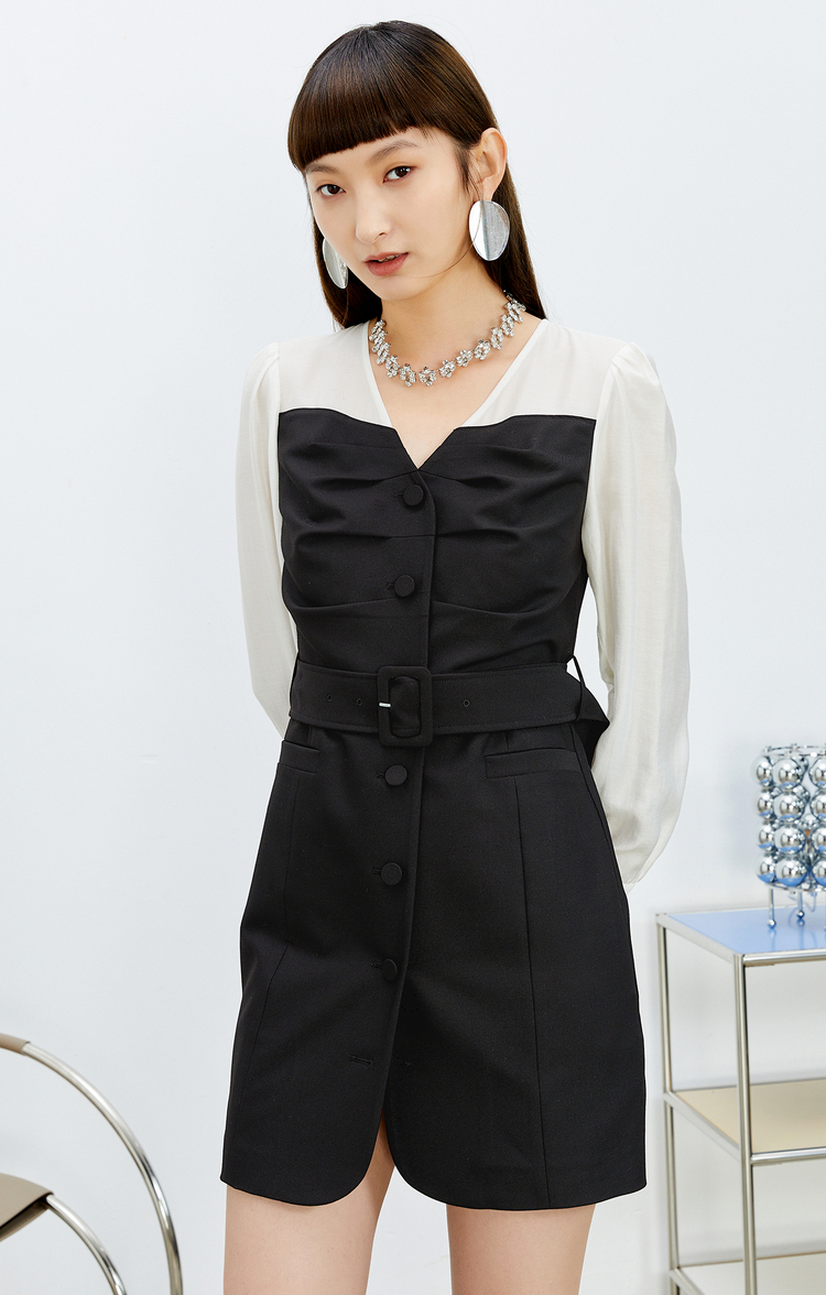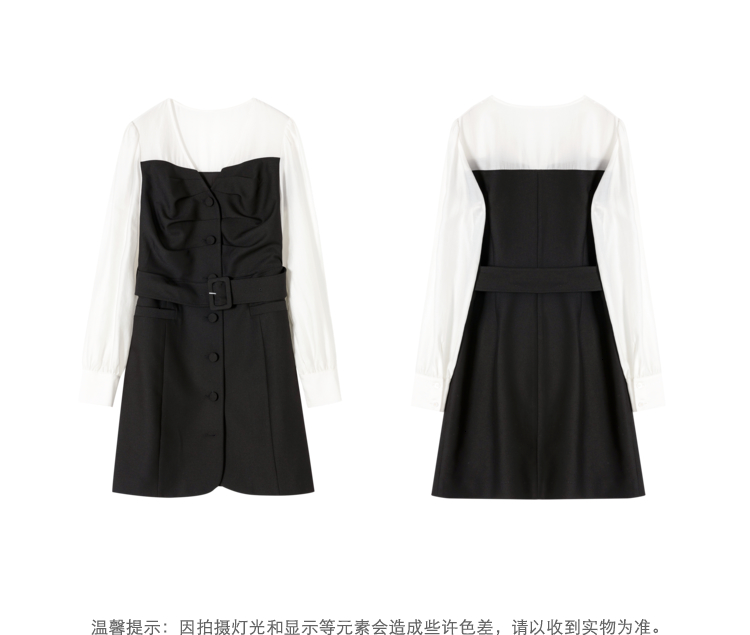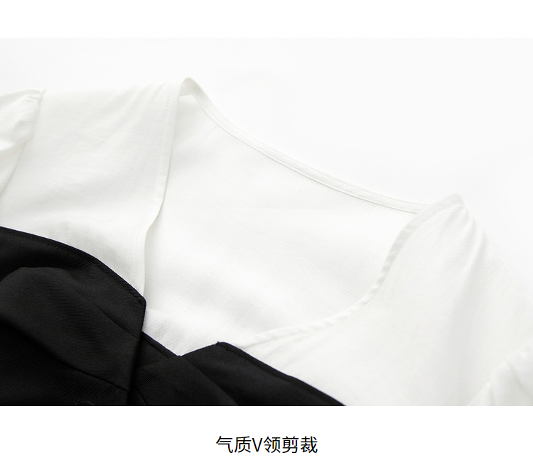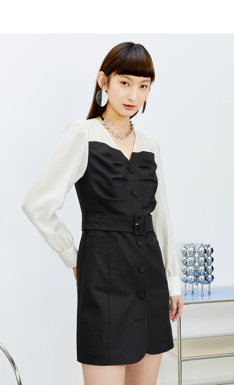 NEELLY纳俪商场同款气质V领连衣裙女撞色拼接简约风A字裙收腰春夏N22023Y01110