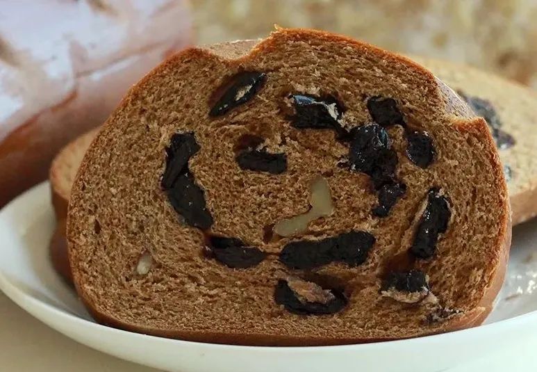 面包上面缀满了核桃仁、黑葡萄