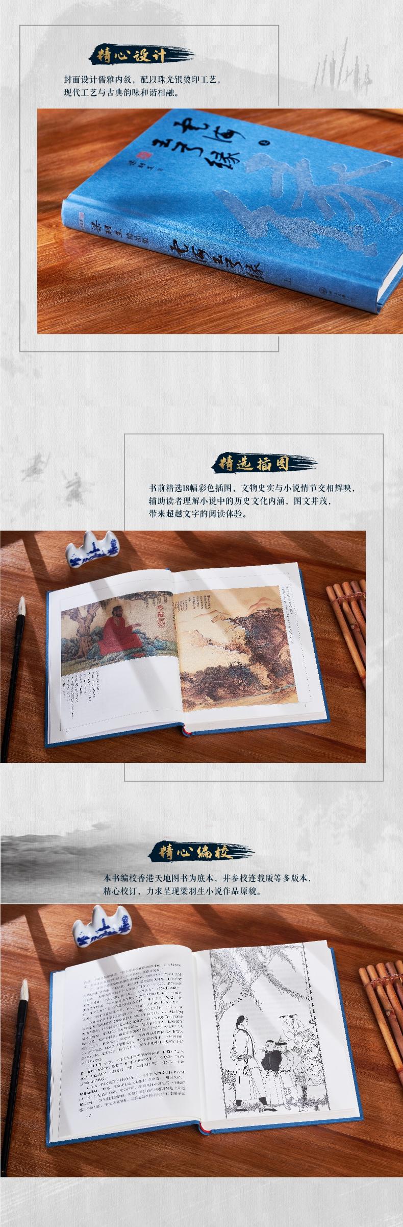 1. 精装硬封 本身采用圆脊锁线精装,用纸细腻柔软,可平摊阅读,解放双手。 2.精心设计 封面设计儒雅内敛,配以珠光银烫印工艺,高档精致、秉承梁羽生小说古典气质。 3. 精选彩图 书前精选66幅彩色插图,文物史实与小说情节交相辉映,辅助读者理解小说中的历史文化内涵,带来图文并茂的阅读体验。 4.精心编校 本书编校香港天地图书为底本,并参校连载版等多版本,精心校订,力求呈现梁羽生小说作品原貌。