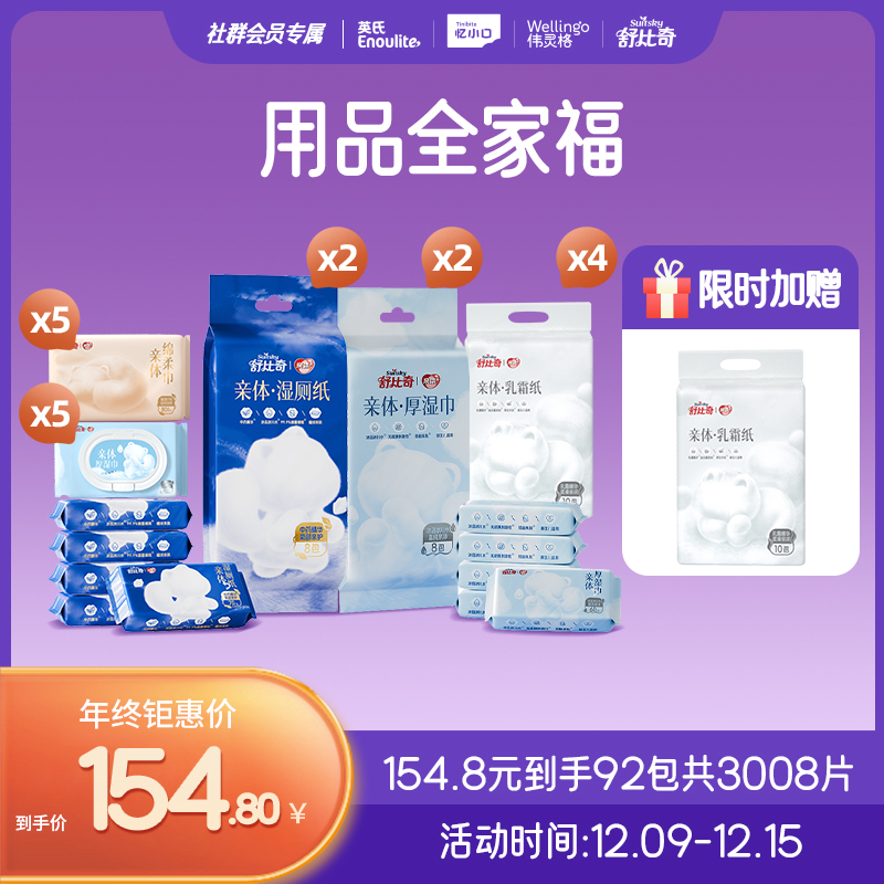 【会员嗨购节】2月19日抢购开启舒比奇社群团购用品全家福 舒比奇纸品92包(厚湿巾80抽*5+厚湿巾6片*16+乳霜纸40片*50+棉柔巾80抽*5+湿厕纸7片*16)(含赠品)