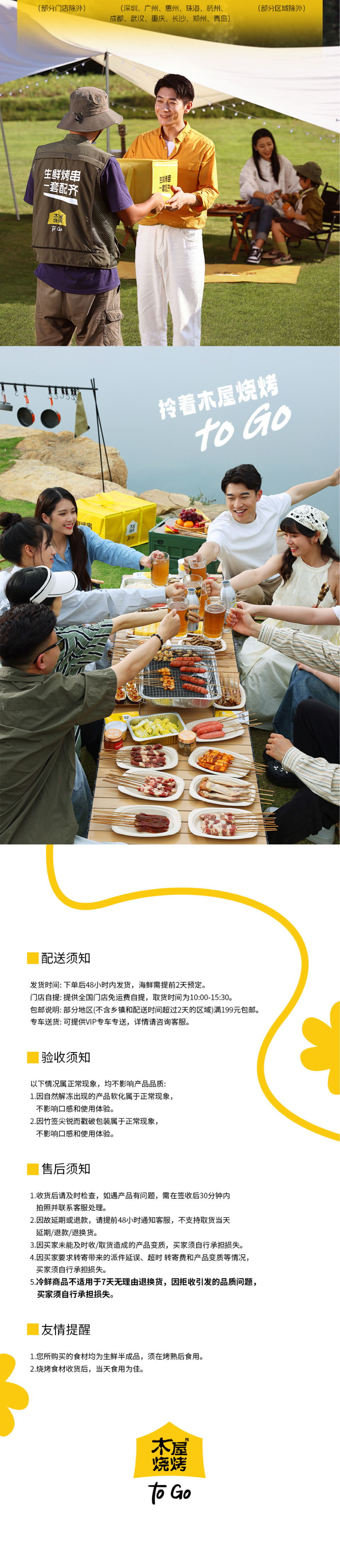 木屋烧烤半成品套装,一键下单,使命必达。 -全国300家门店支持次日到店自提 -全国顺丰包邮,当日下单,次日顺丰送货上门(部分区域除外,实际以顺丰时效为准)