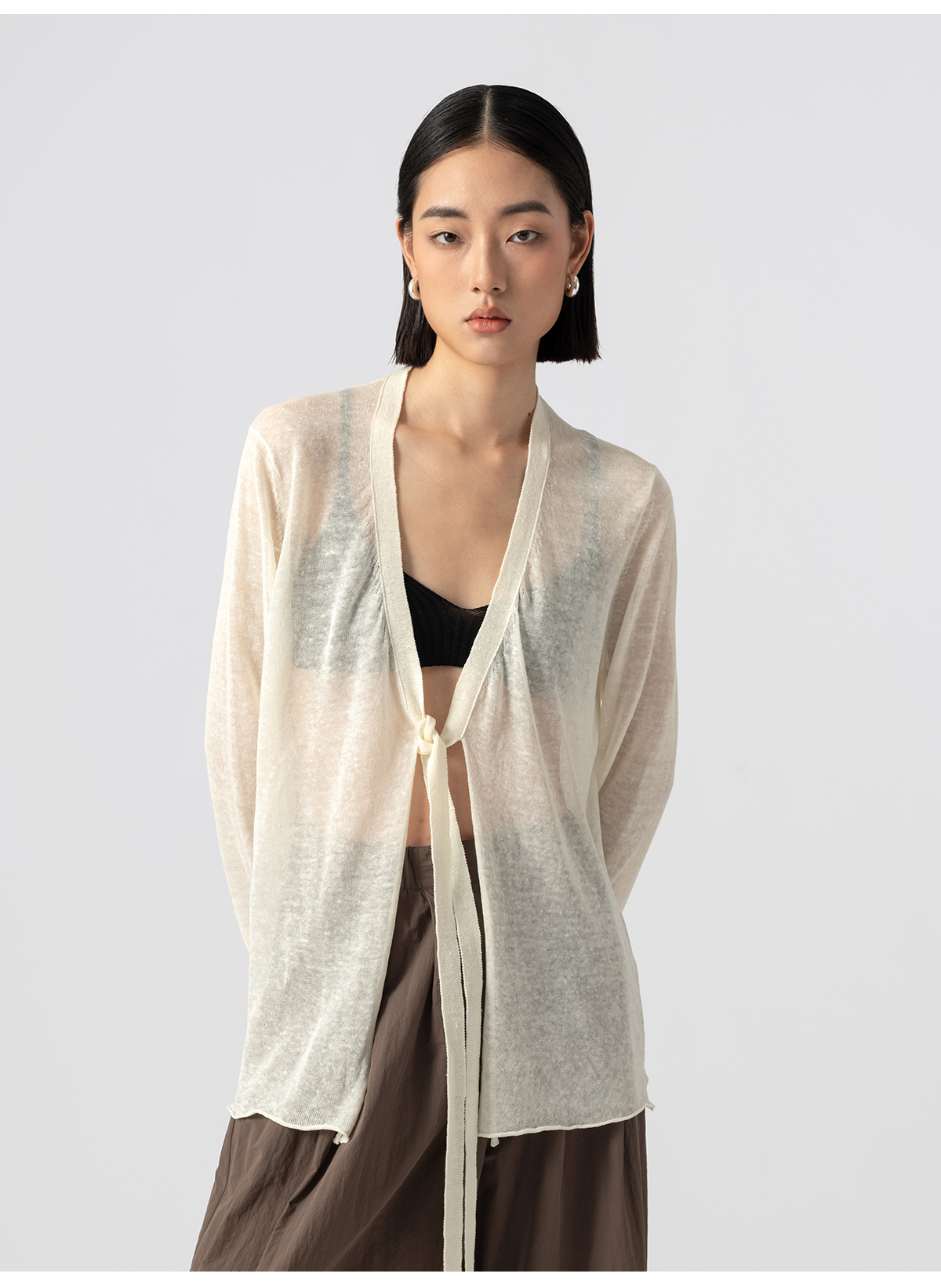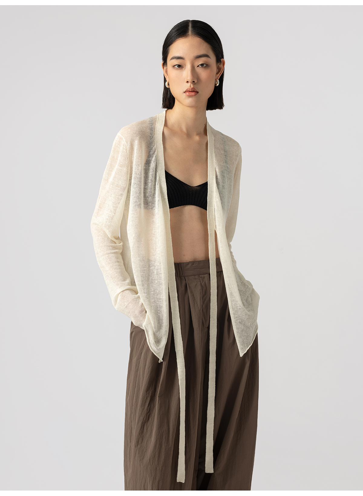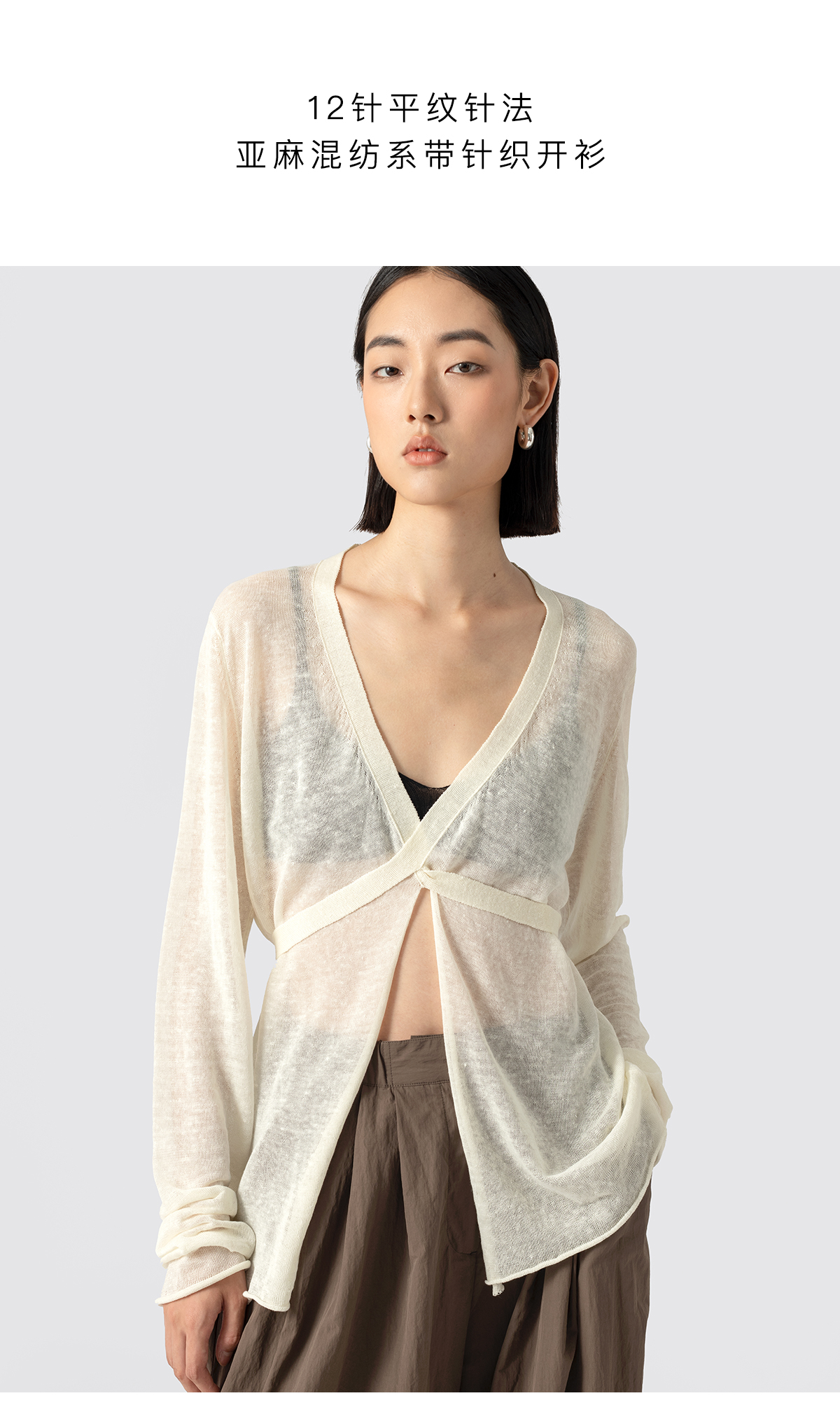 322工房纯粹亚麻女士长袖针织防晒开衫2023夏系带V领空调衫女B096
