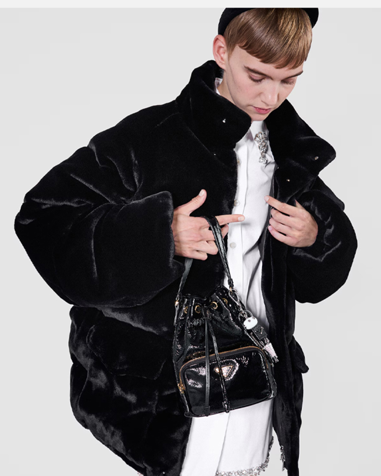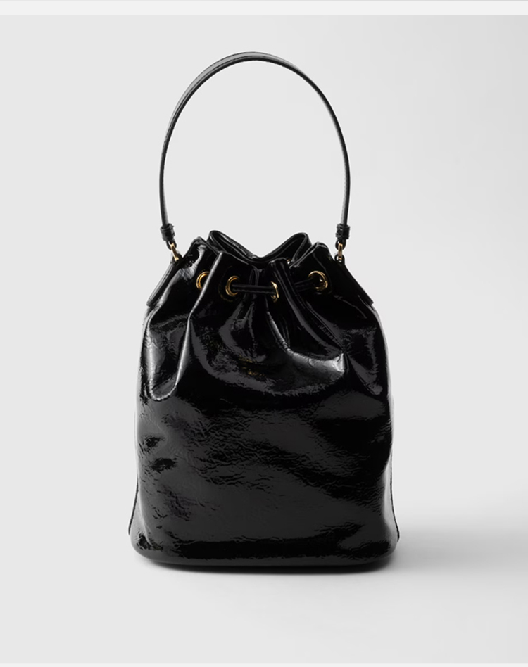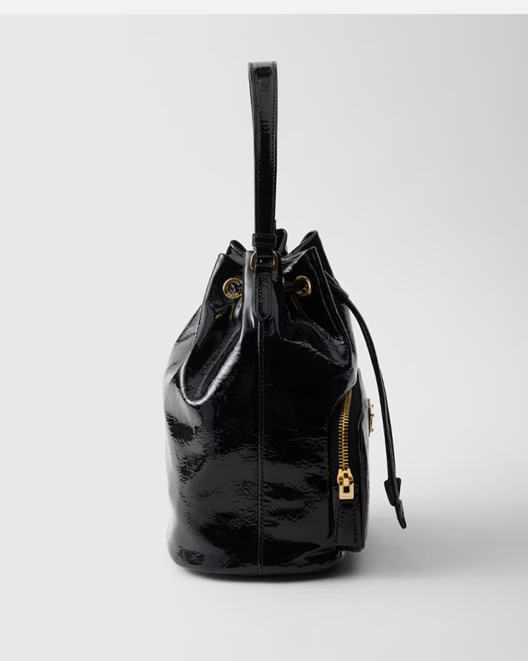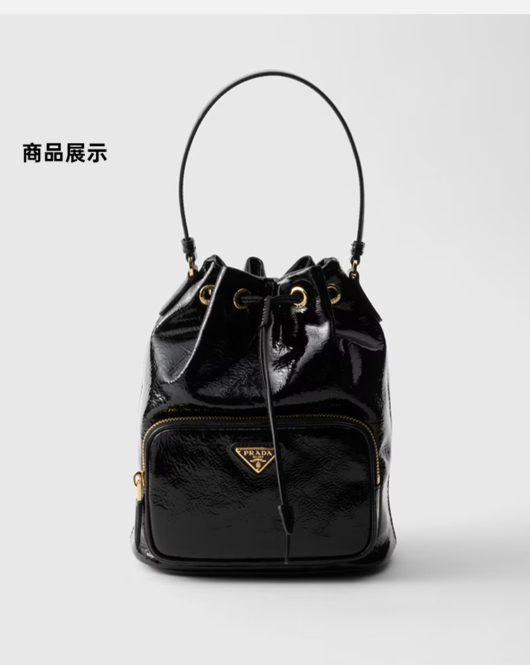 PRADA 普拉达 女士珐琅金属三角徽标 Duet naplak 漆皮水桶包 黑色 1BH038 2DNT F0002 UOM