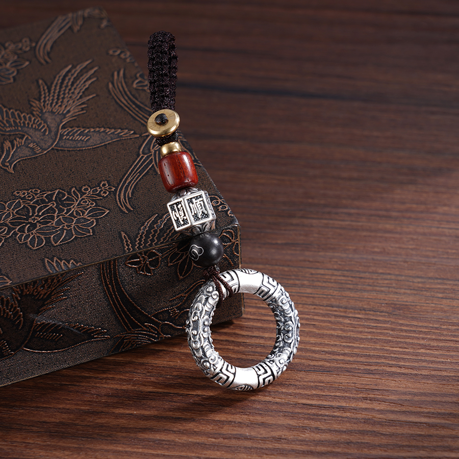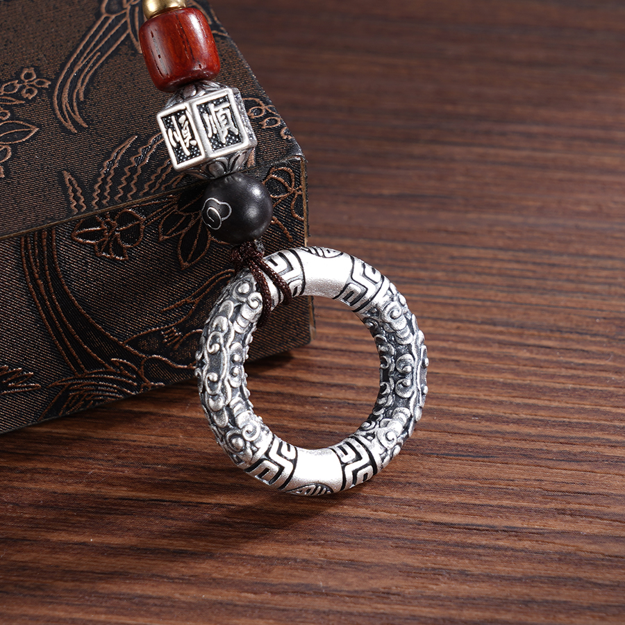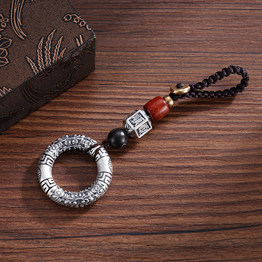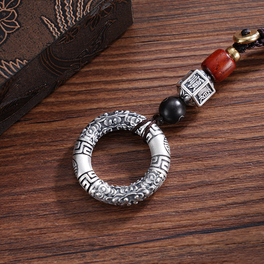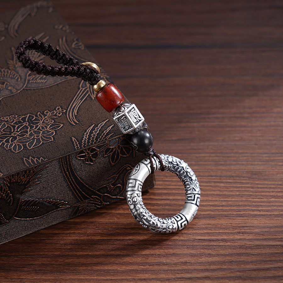 【寓意】:平安扣吊坠,表面浮雕祥云花纹,祥云缠绕平安扣,灵趣巧妙,富有深意。寓意扣住平安,万事顺意。