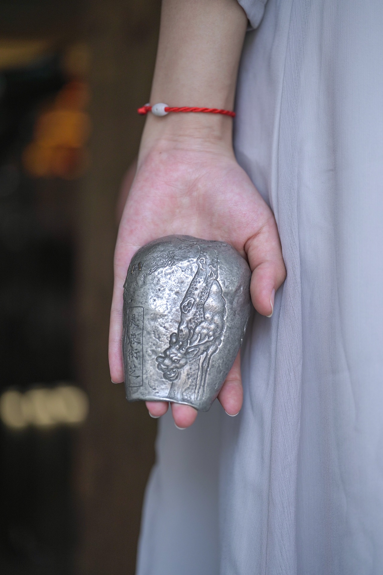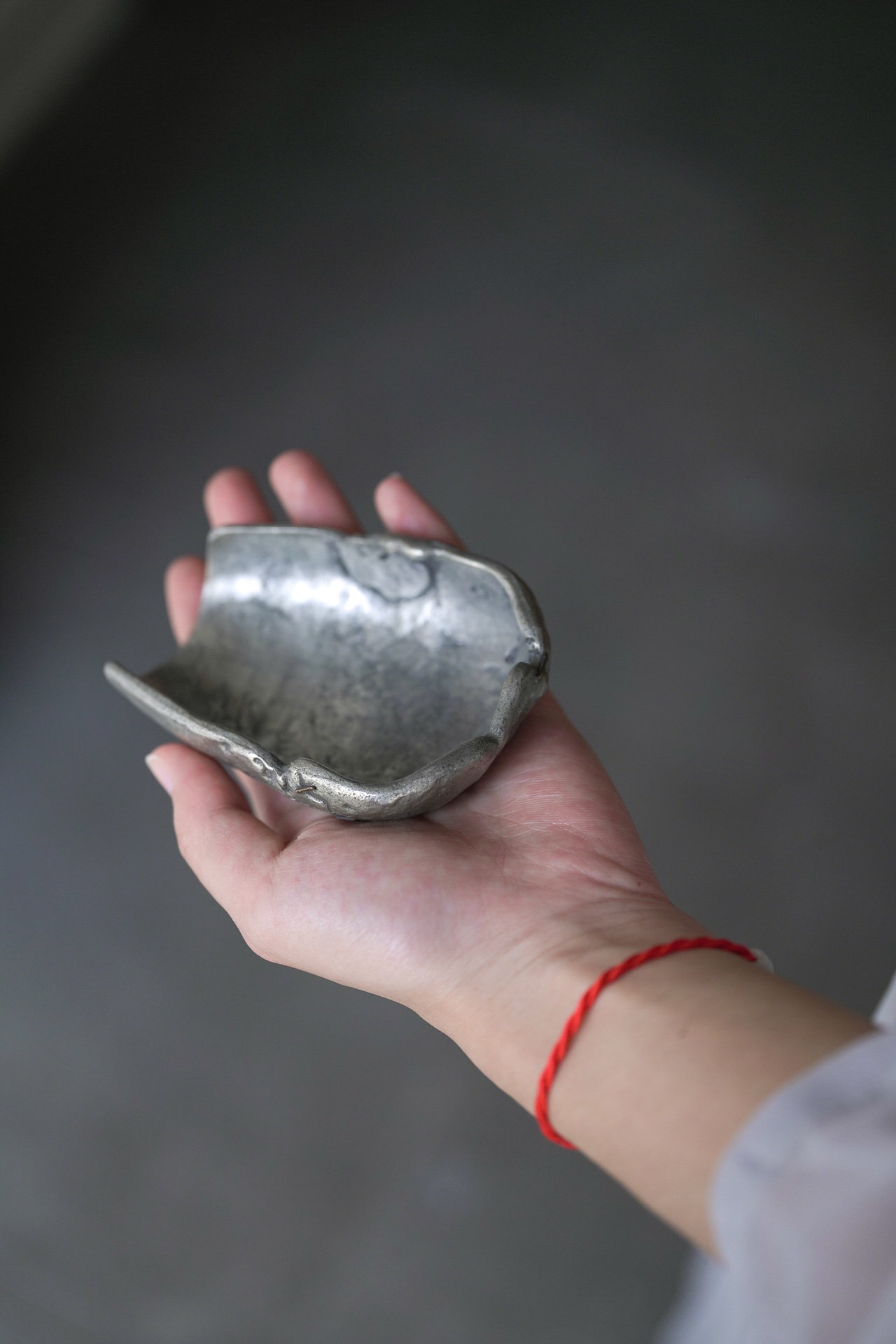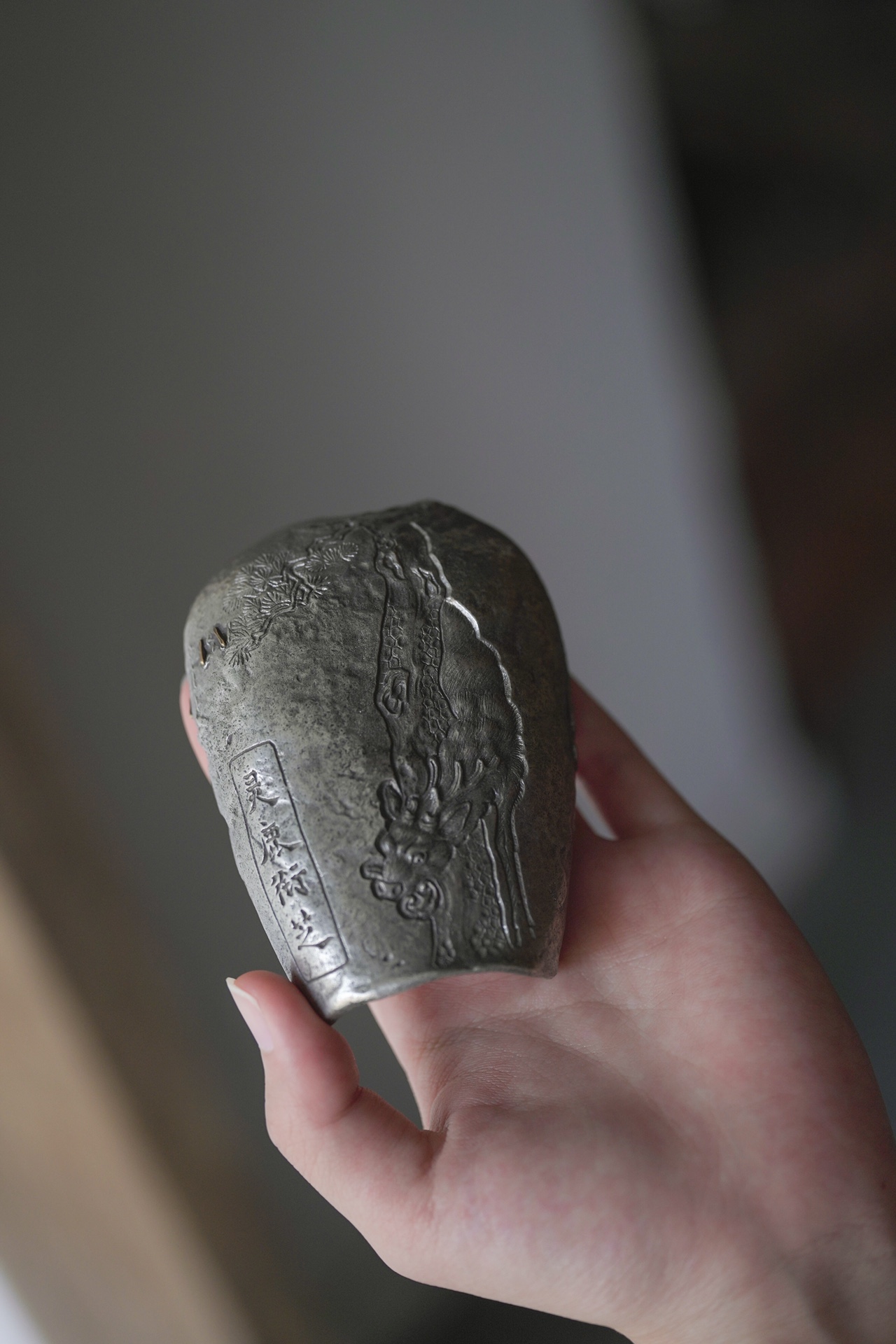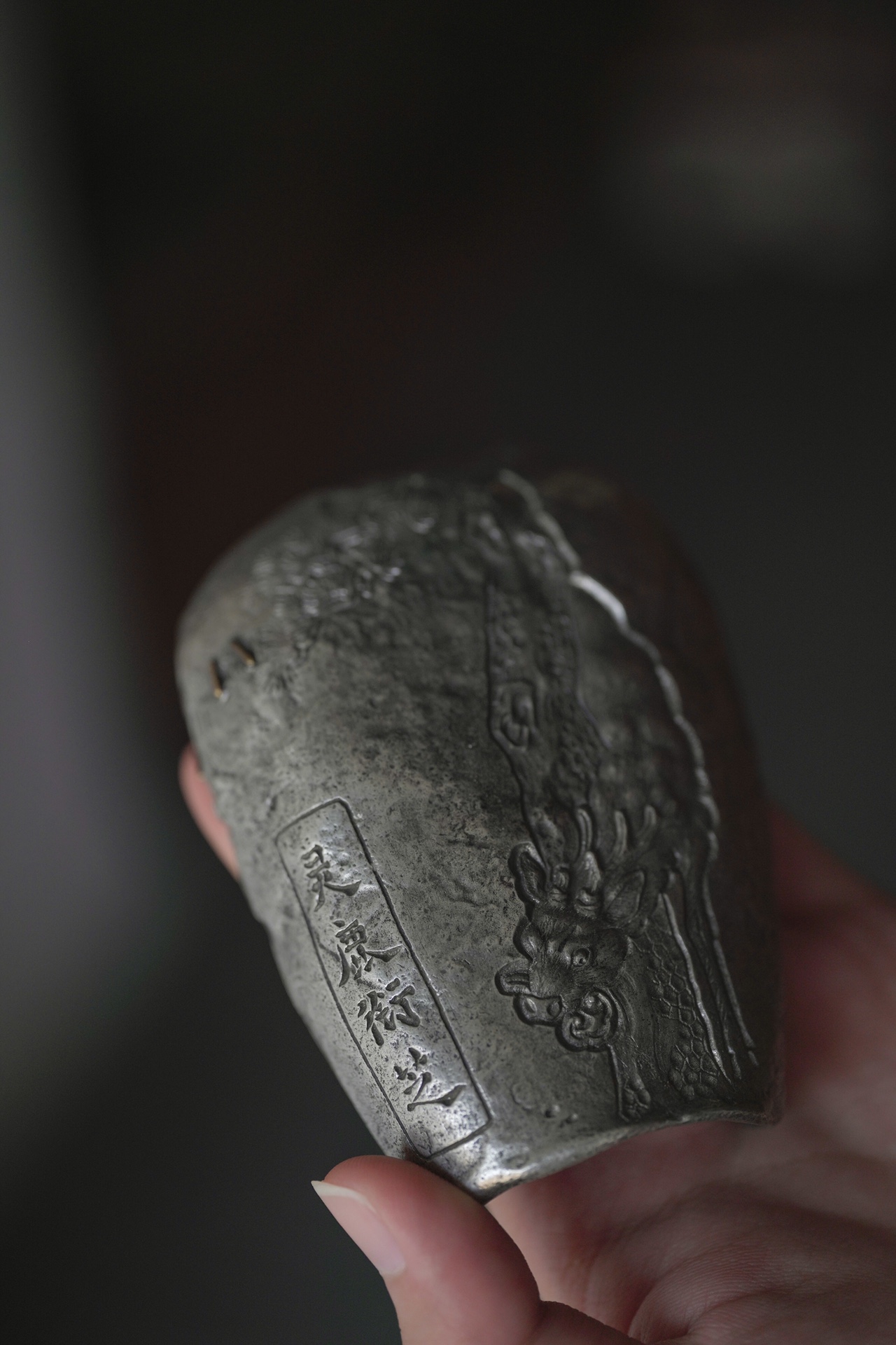 乾茂號造|“灵鹿衔芝”石纹锔钉锡茶则 纯锡茶则茶道配件