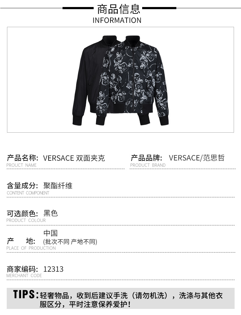 【超惠秒】Versace 范思哲 男士 双面穿 夹层无填充防风雨夹克外套 12313