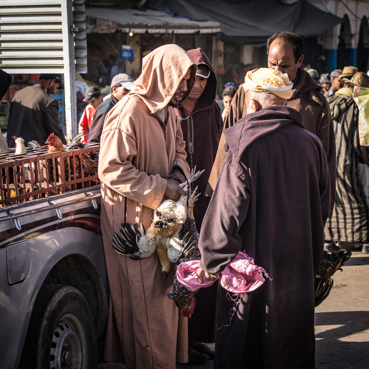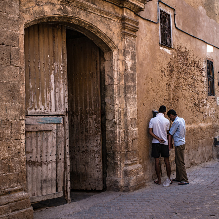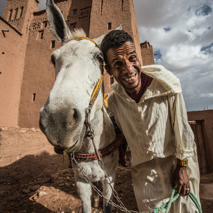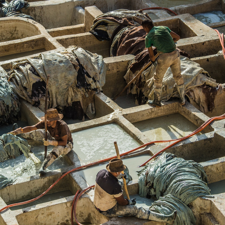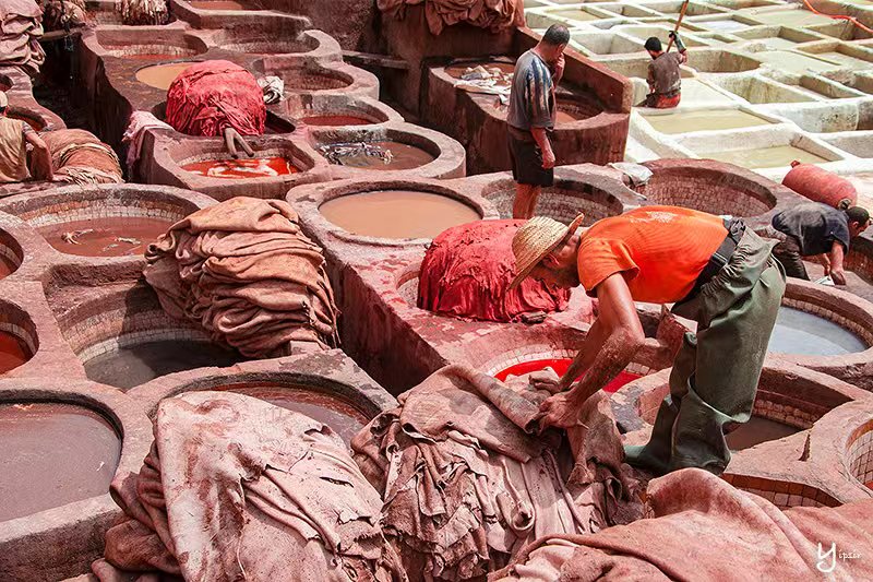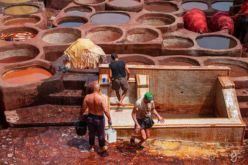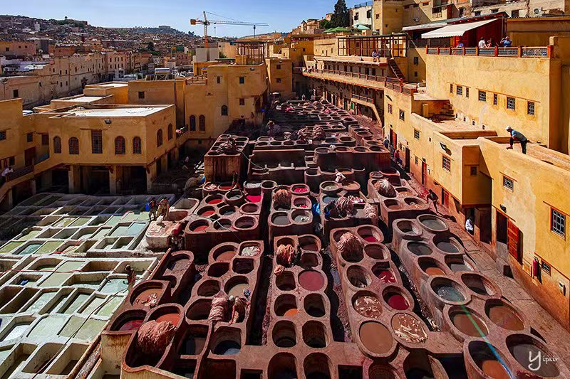 早餐之后游览拍摄点【菲斯古城】被美国著名杂志,评为全球最浪漫的10大城市之一,到了菲斯,人们仿佛回到了一千年前,毛驴仍是百姓主要交通工具,探访那里的中古世纪老城区、古兰经经学院、Nejjarine 泉、伊德里斯陵墓和世界第一所大学等。菲斯古城里最具"色彩"的景点就是皮革染坊。染坊名气大的其中一个原因就是一个"臭"字,在迂回曲折的小巷迷宫中,循着臭味去找,你就能找着这个大染坊。据说菲斯是世界上极少仍保持传统染色方法的地区之一,当地人用驴子送来皮革,再将它们放入一格格染槽中,保留着传统搓揉及风干的古老方法,让天然植物的颜色在皮革上美丽地呈现出来。