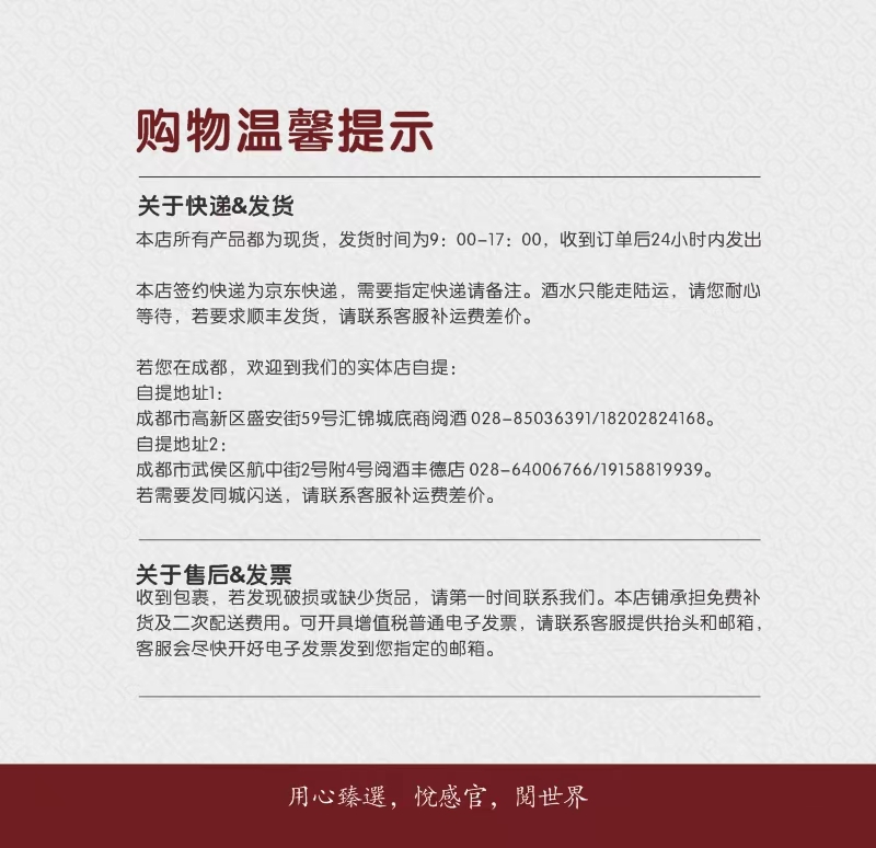注:酒类属于特殊售后,不支持7天无理由退换货;如收到有质量问题,如遇破损、漏液、丢件、错发少发,请第一时间拍照与客服联系。