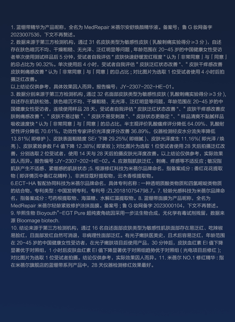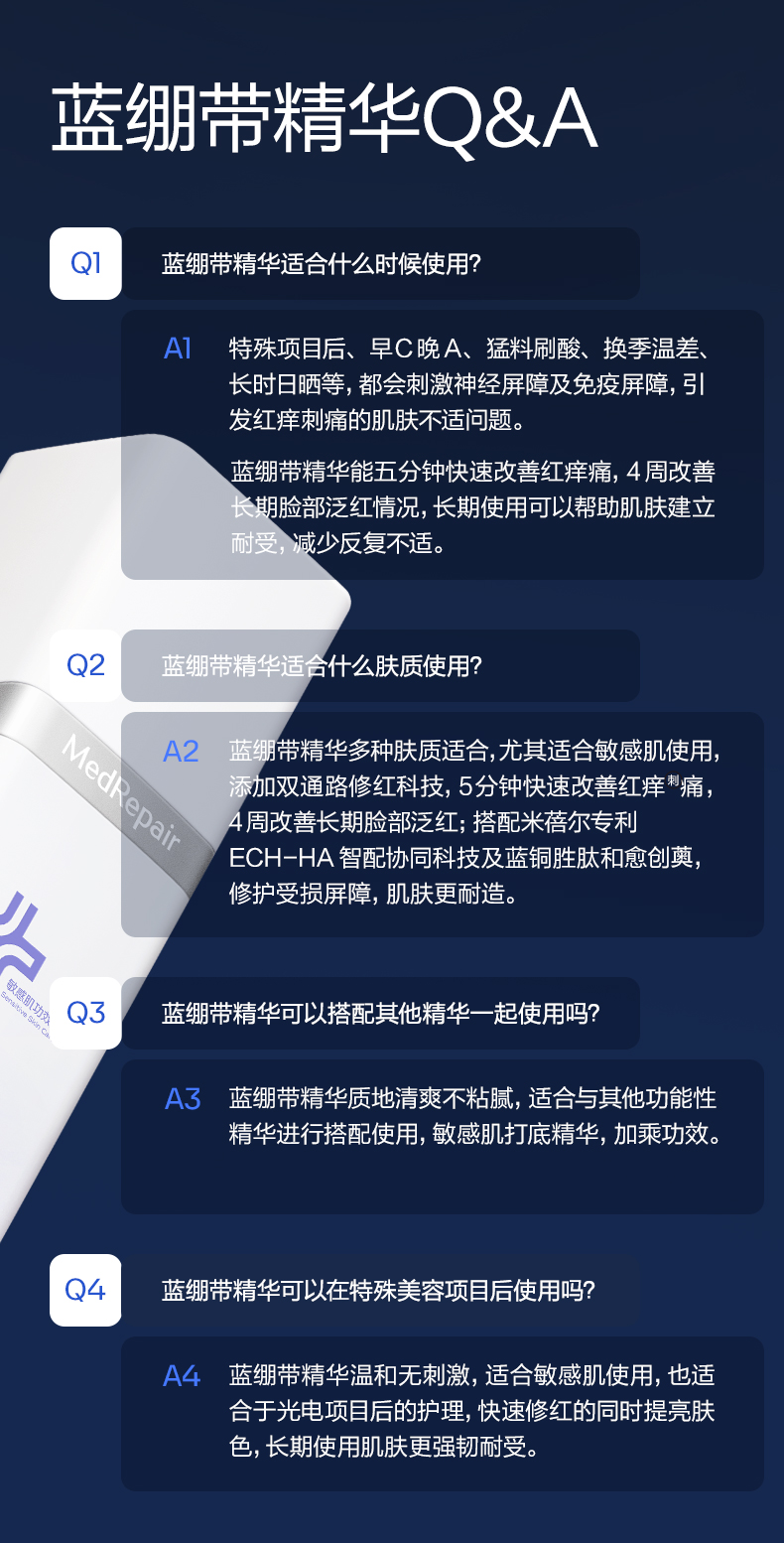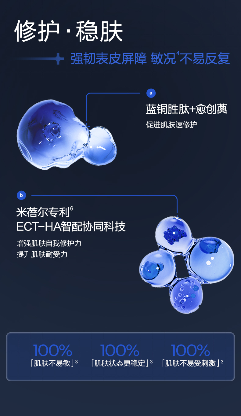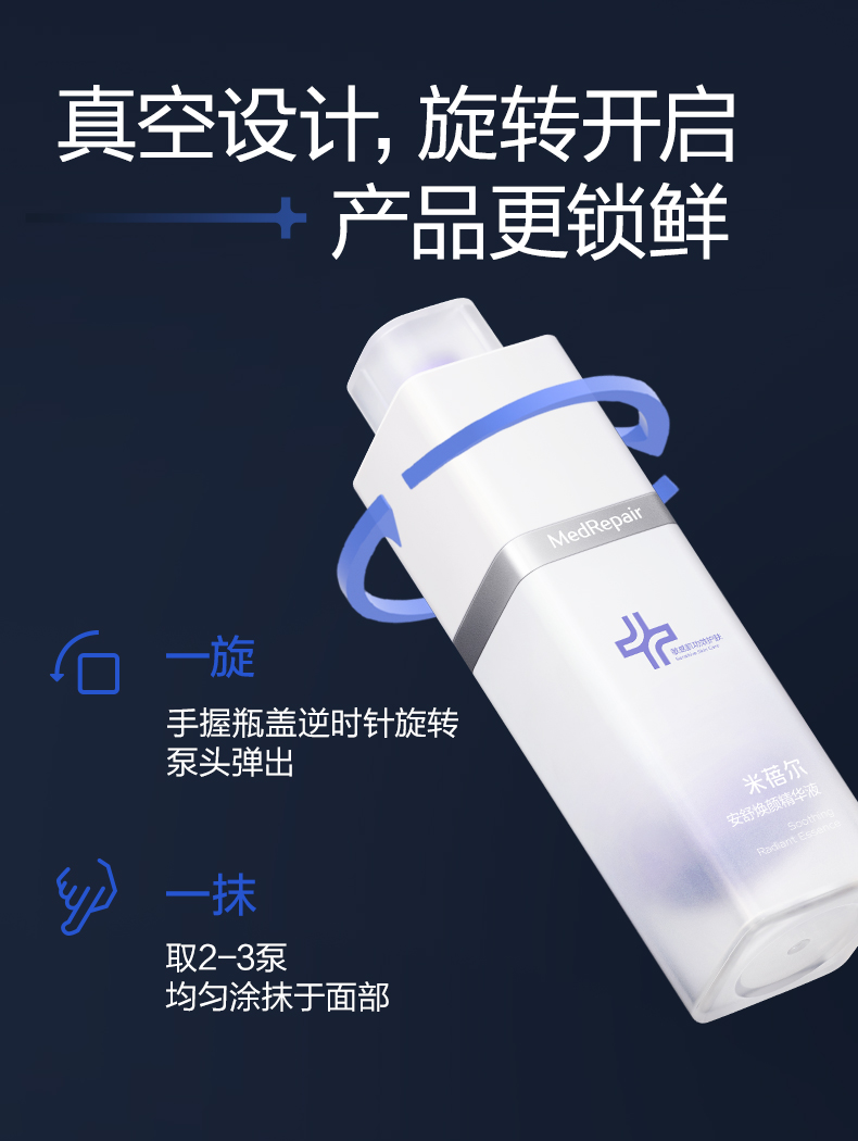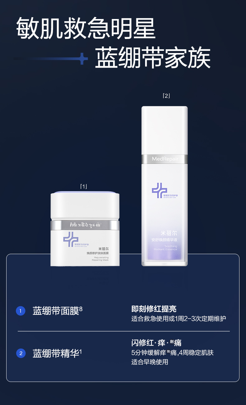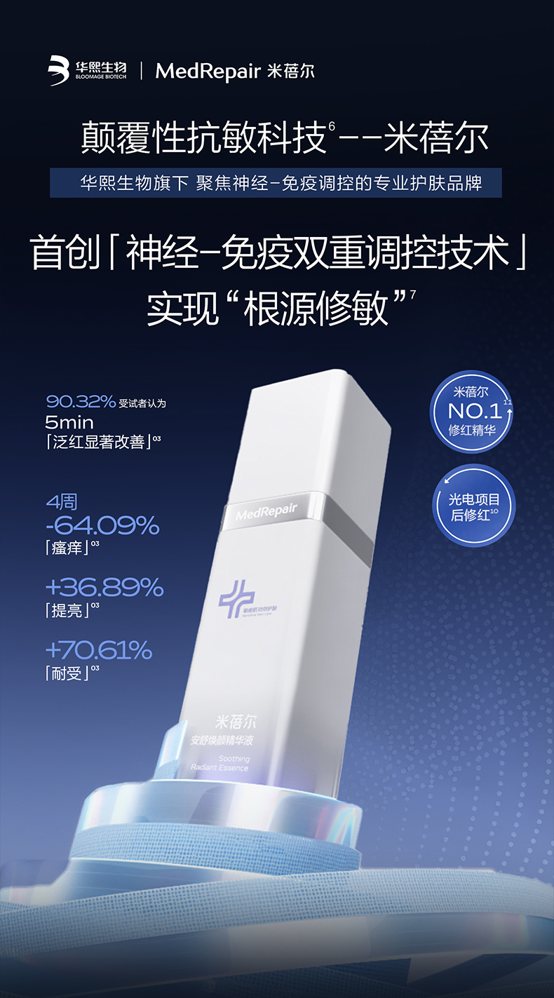 华熙生物集团旗下——米蓓尔MEDREPAIR,源自华熙生物多年潜心研发,“精于修复,专注美丽”为消费者解开敏肌密码,4D-HA四重活水创专利配方取代市场主成分,提供解决敏肌问题的方案。