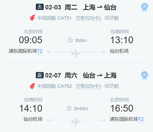 · 上海-日本仙台往返直飞经济舱机票费用