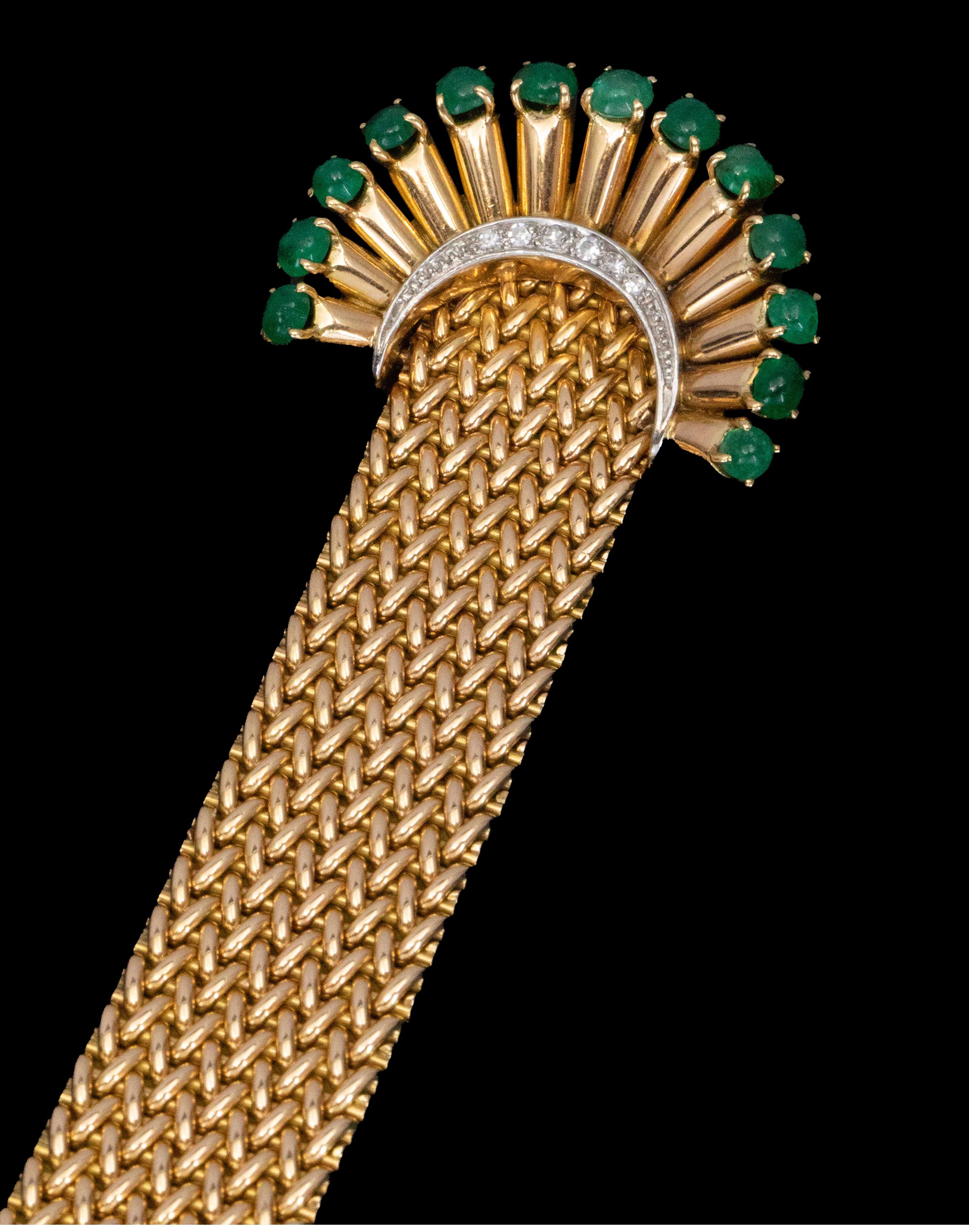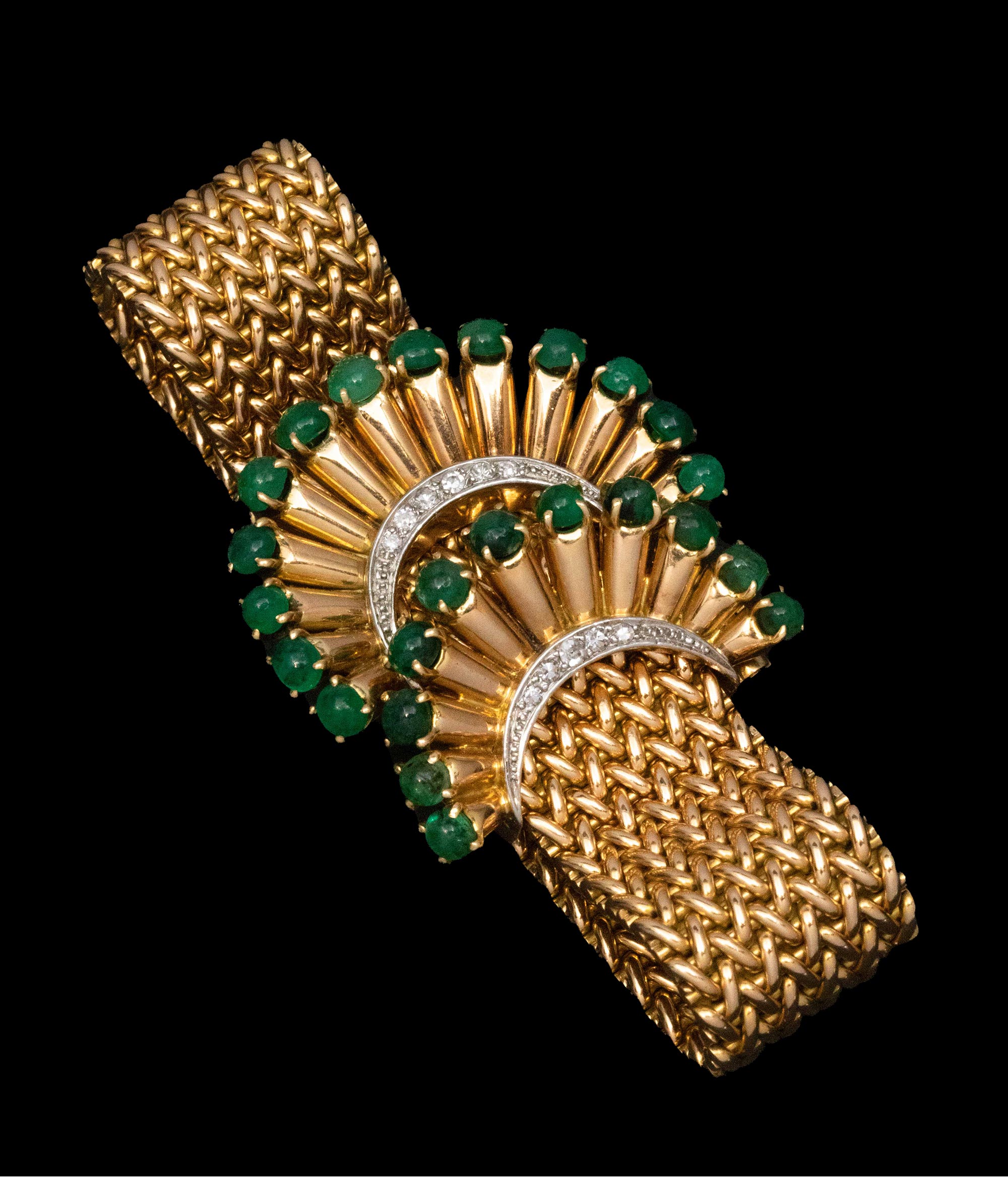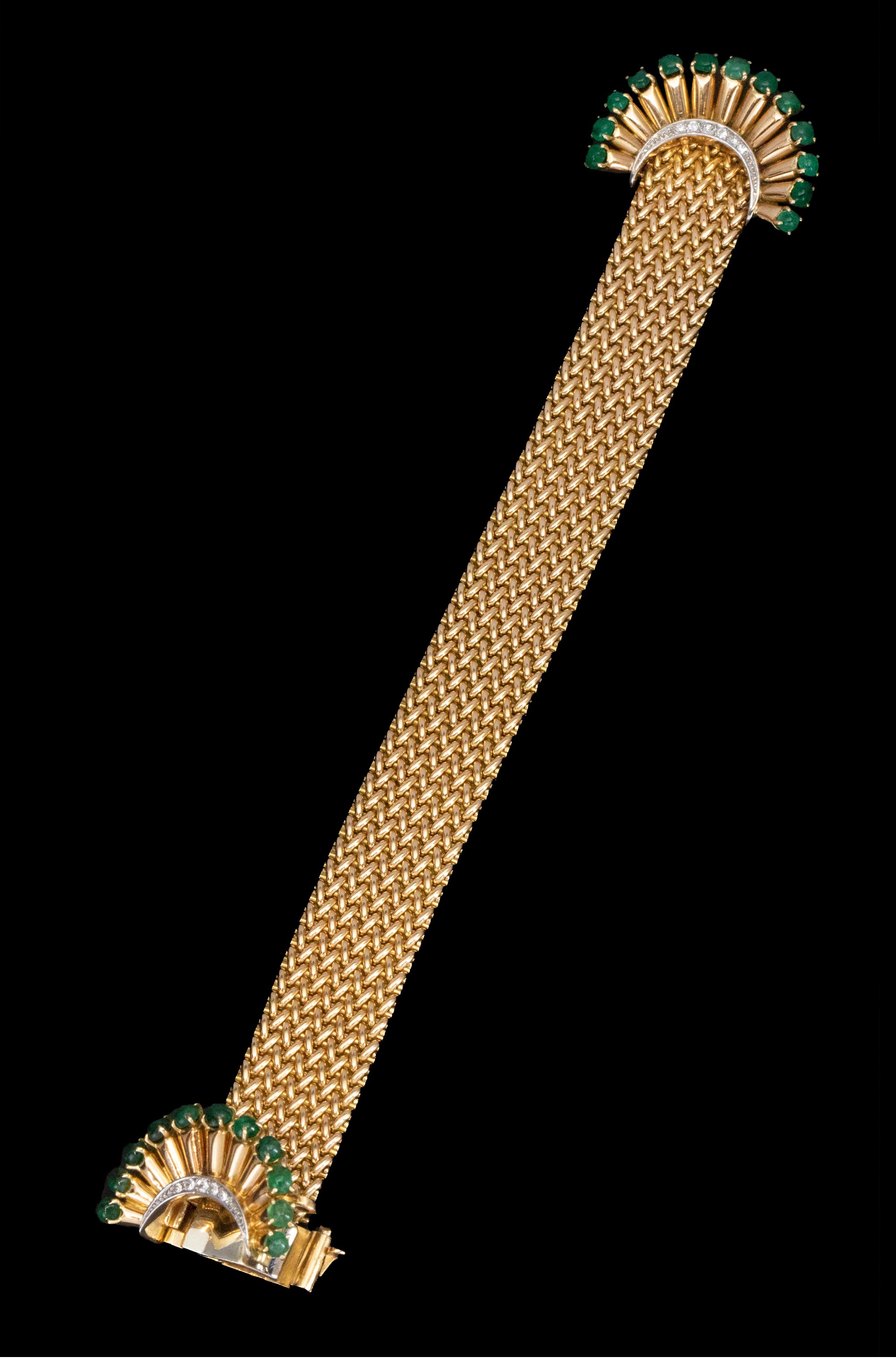 1960年代法国出品装饰艺术风格18K黄金镶嵌祖母绿及钻石编织纹理手链