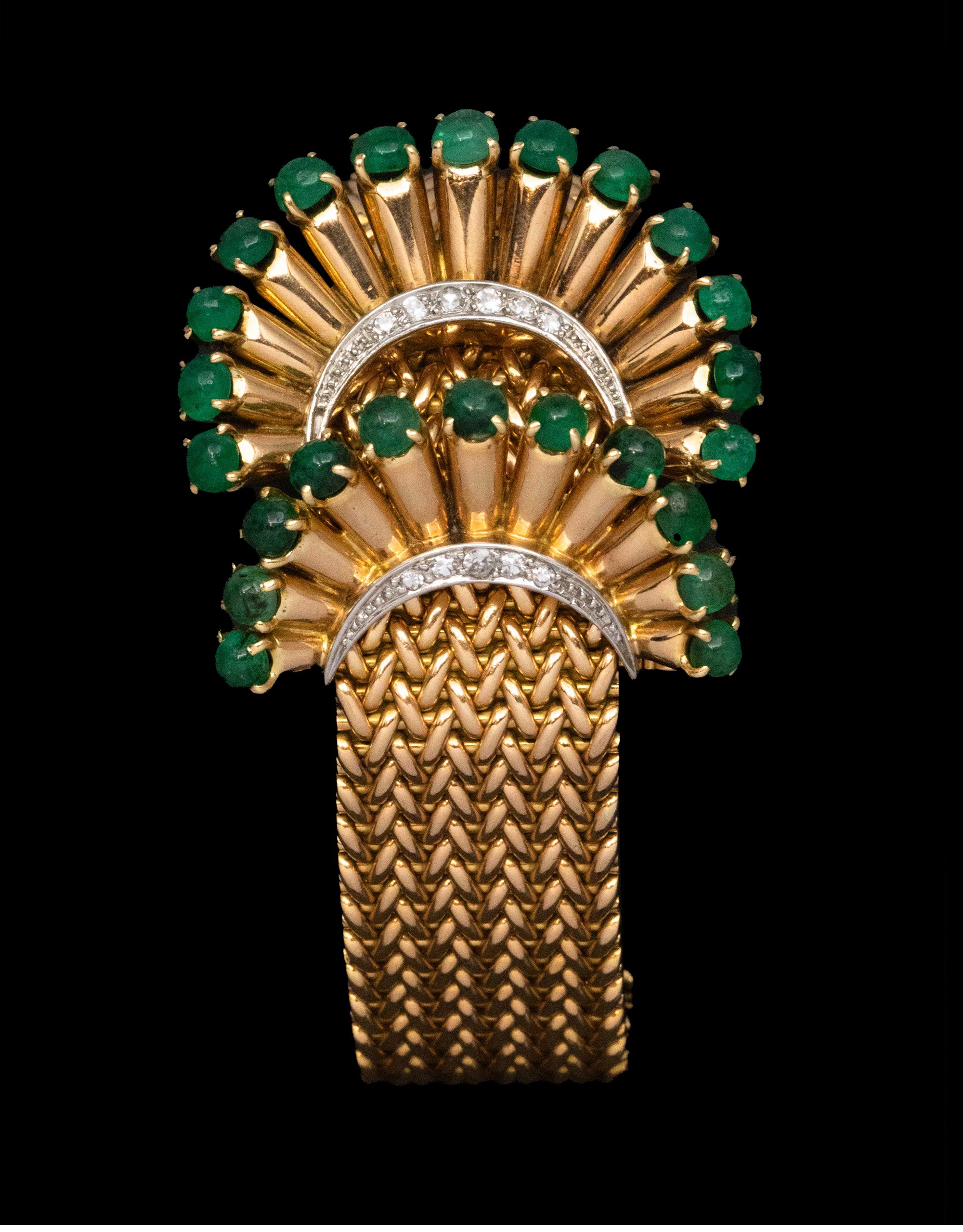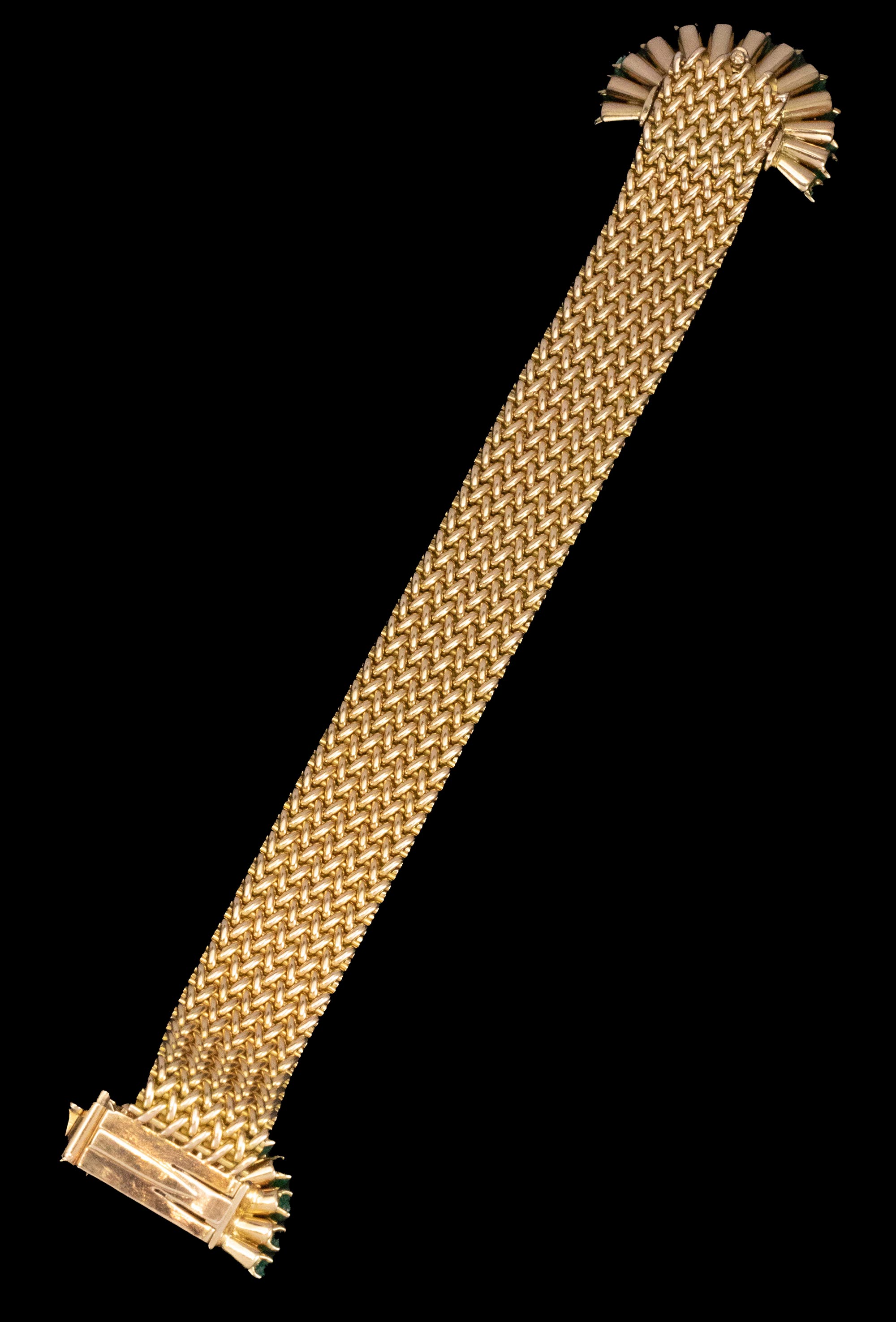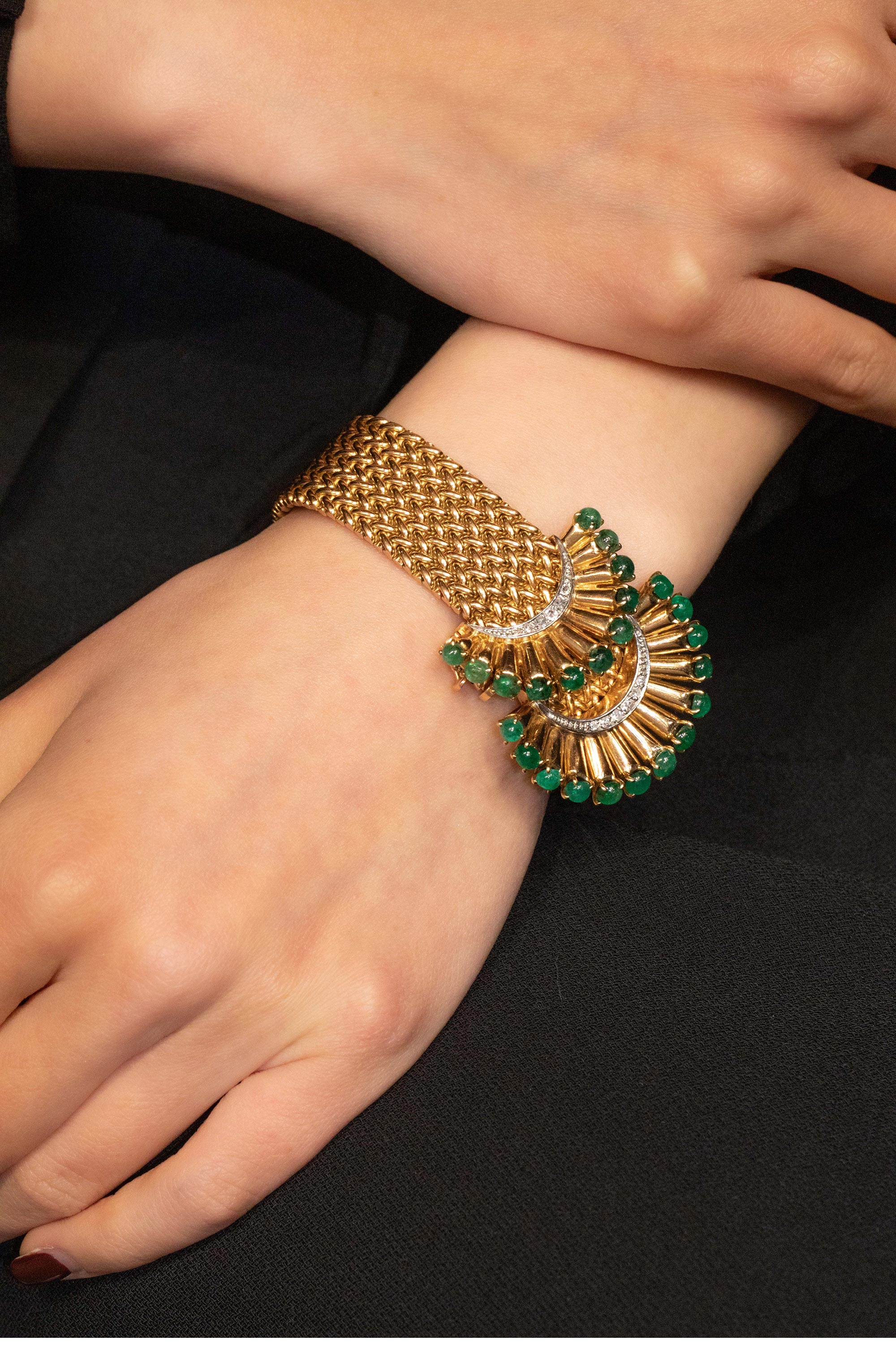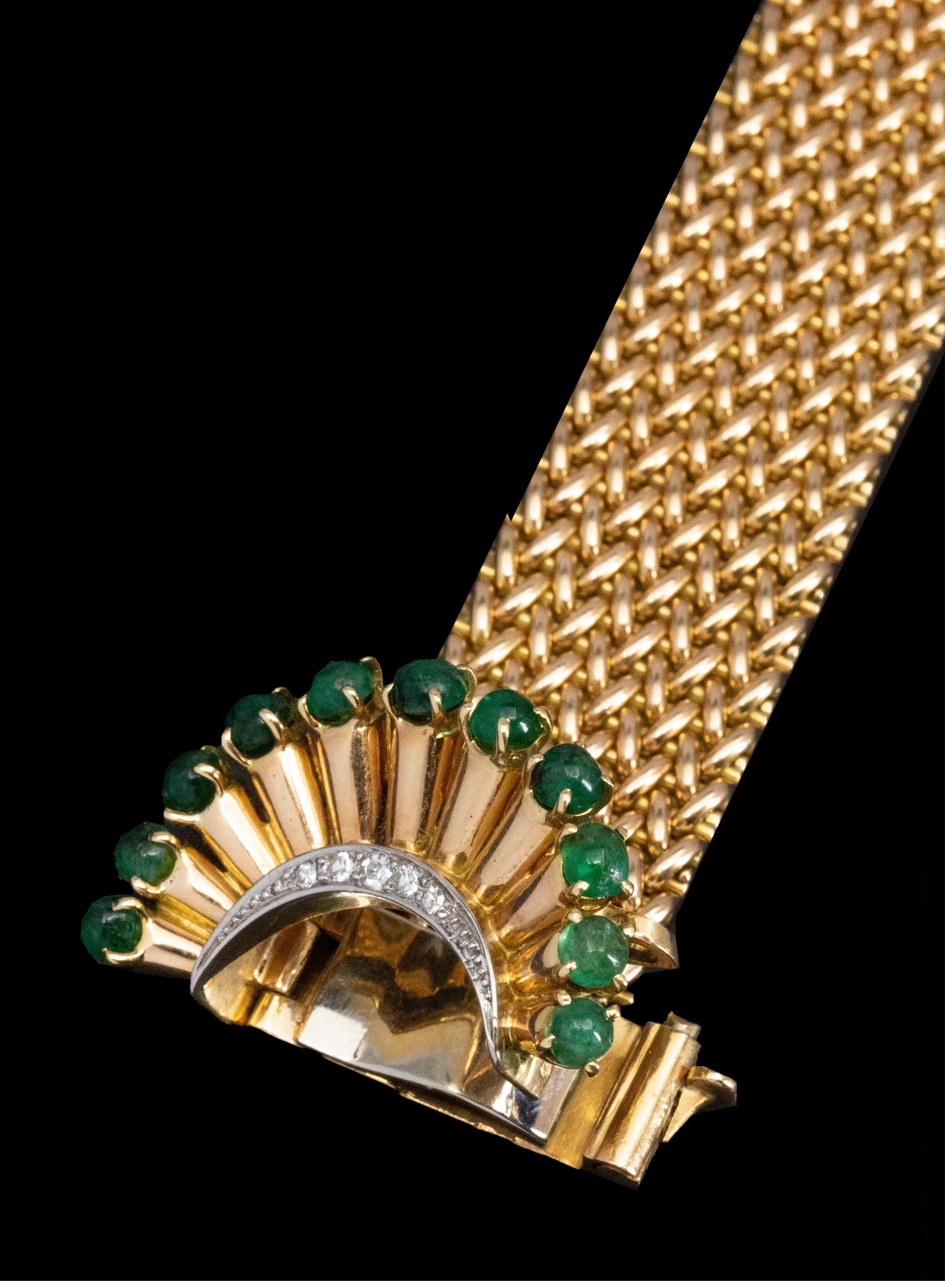 1960年代法国出品装饰艺术风格18K黄金镶嵌祖母绿及钻石编织纹理手链