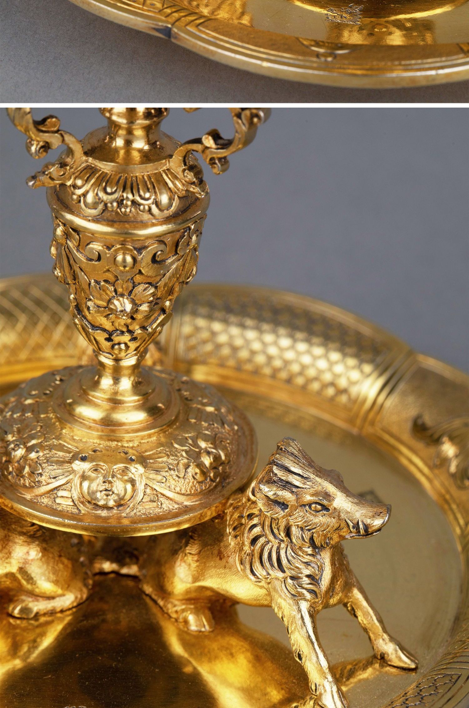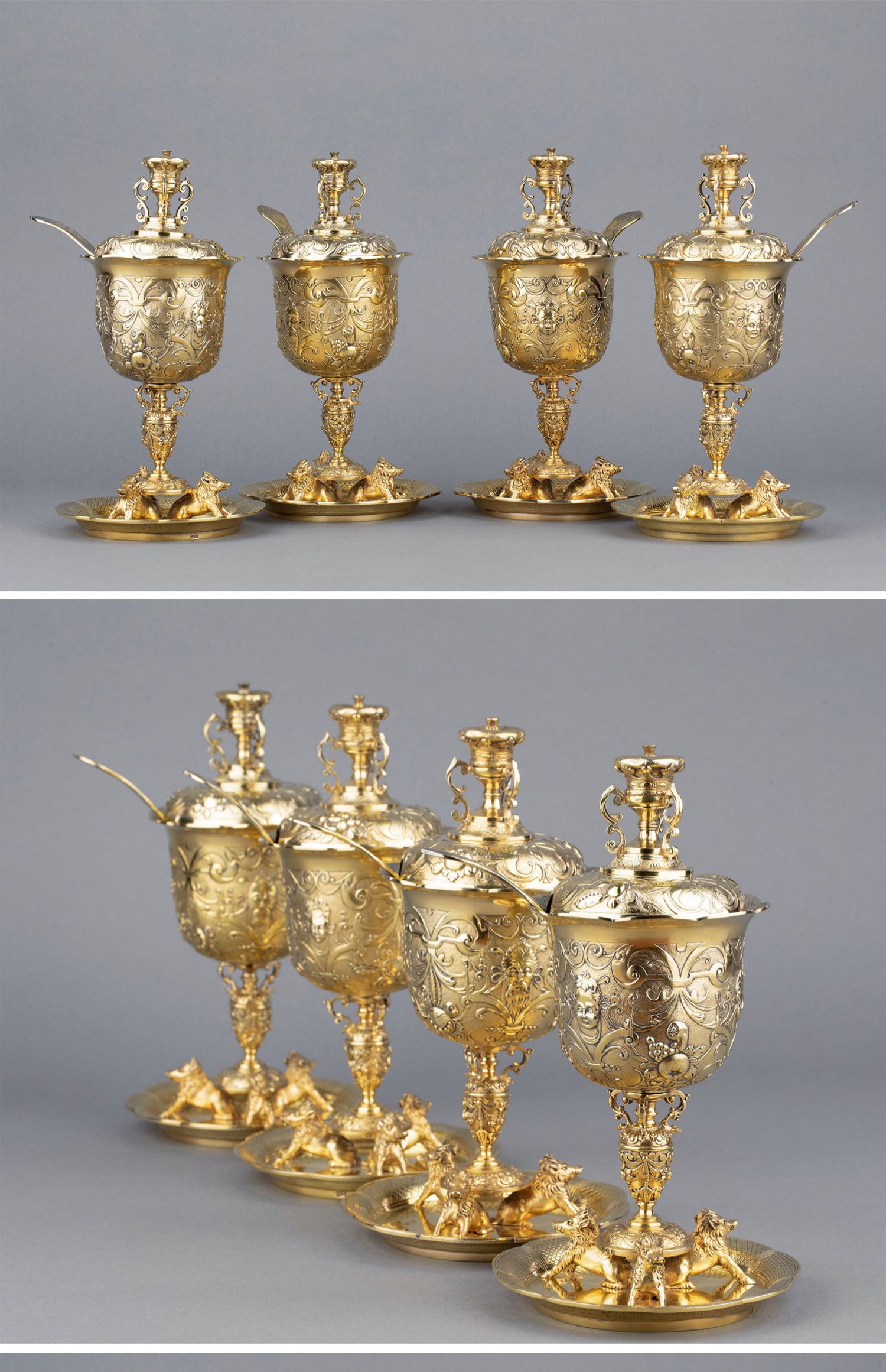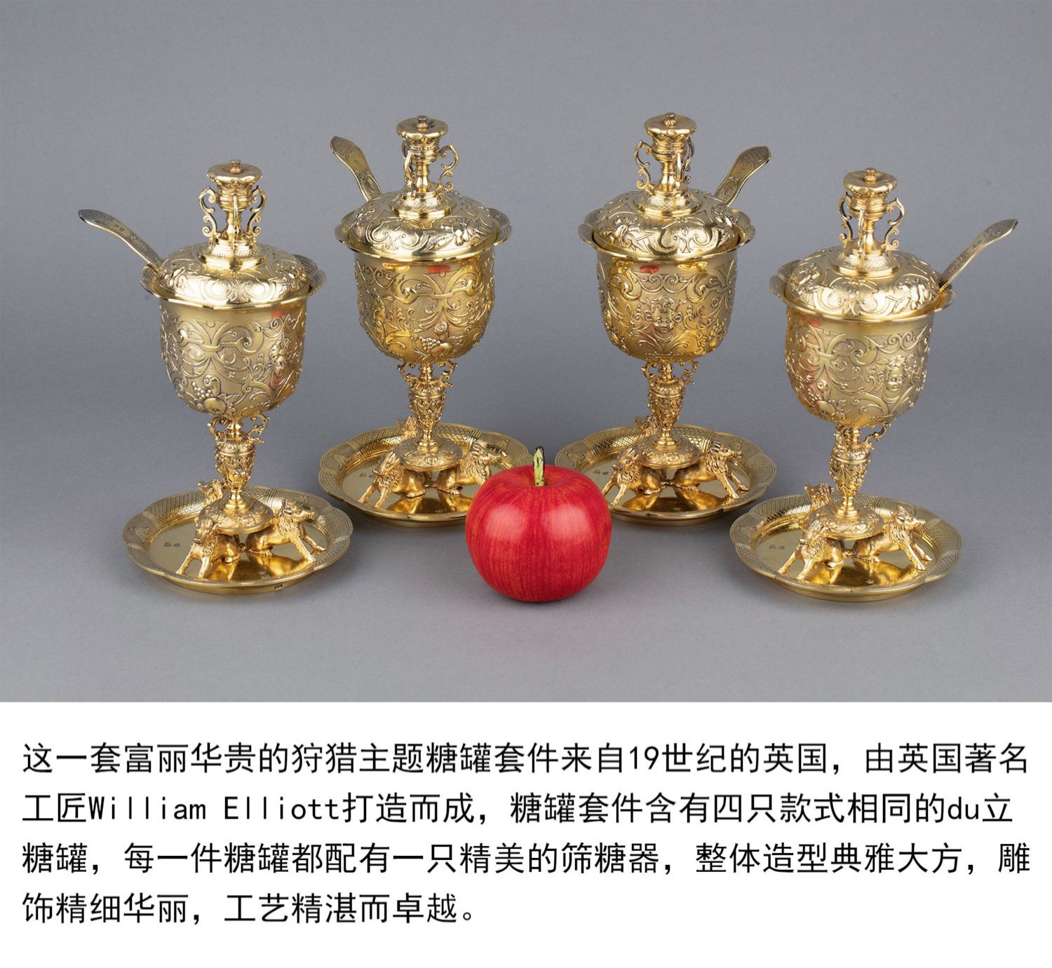 独角鹿西洋古董银器William Elliott狩猎主题纯银镀金糖罐套件