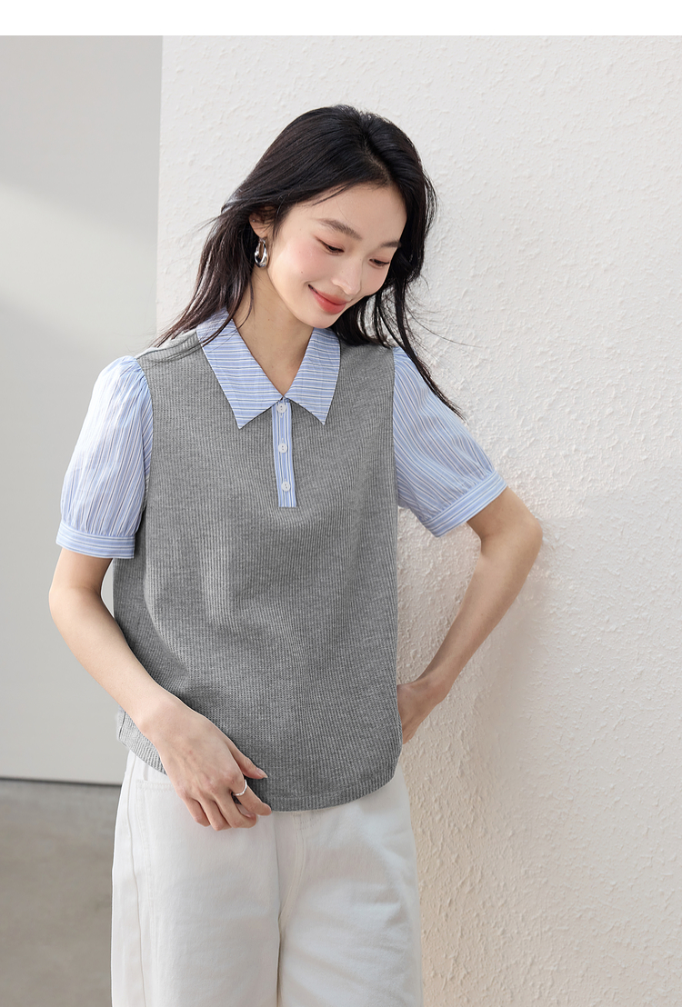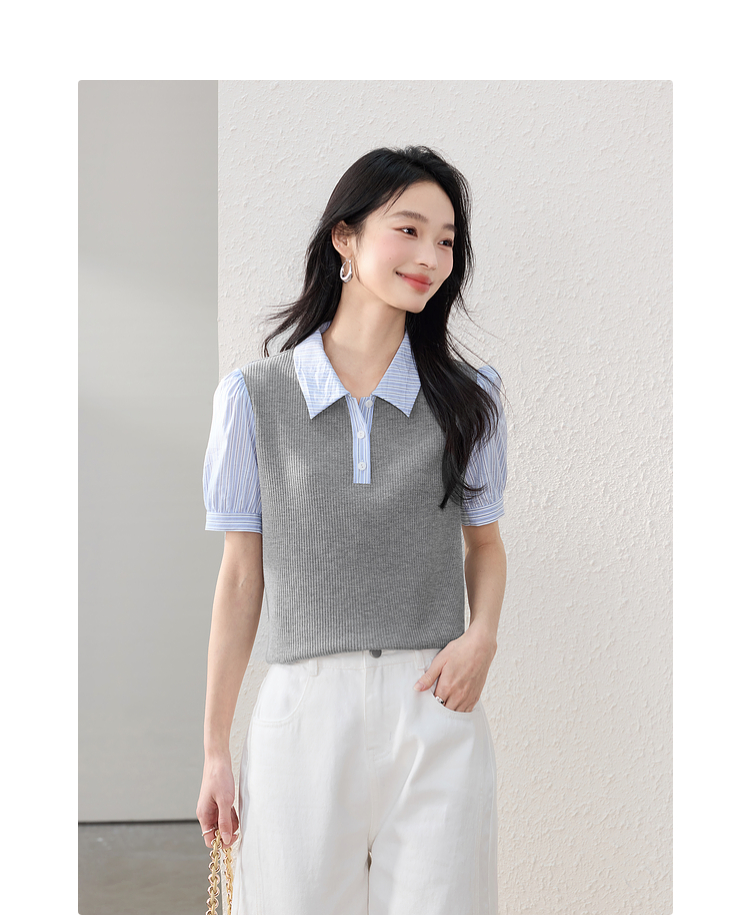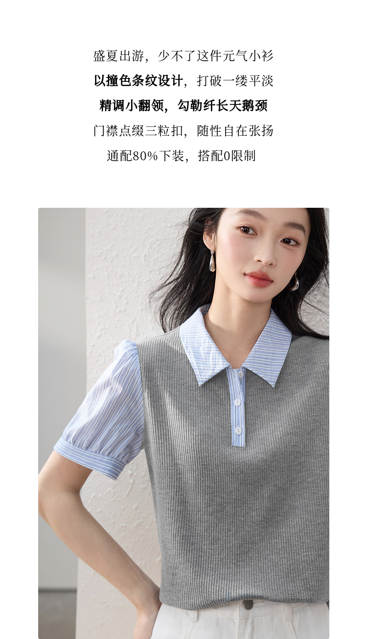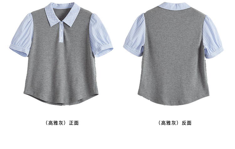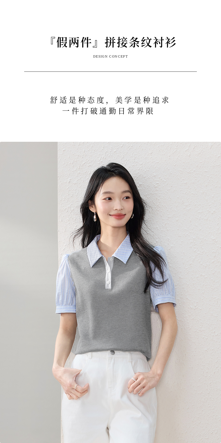 熙世界假两件POLO领条纹衬衫女短袖2025年夏季新款泡泡袖拼接上衣