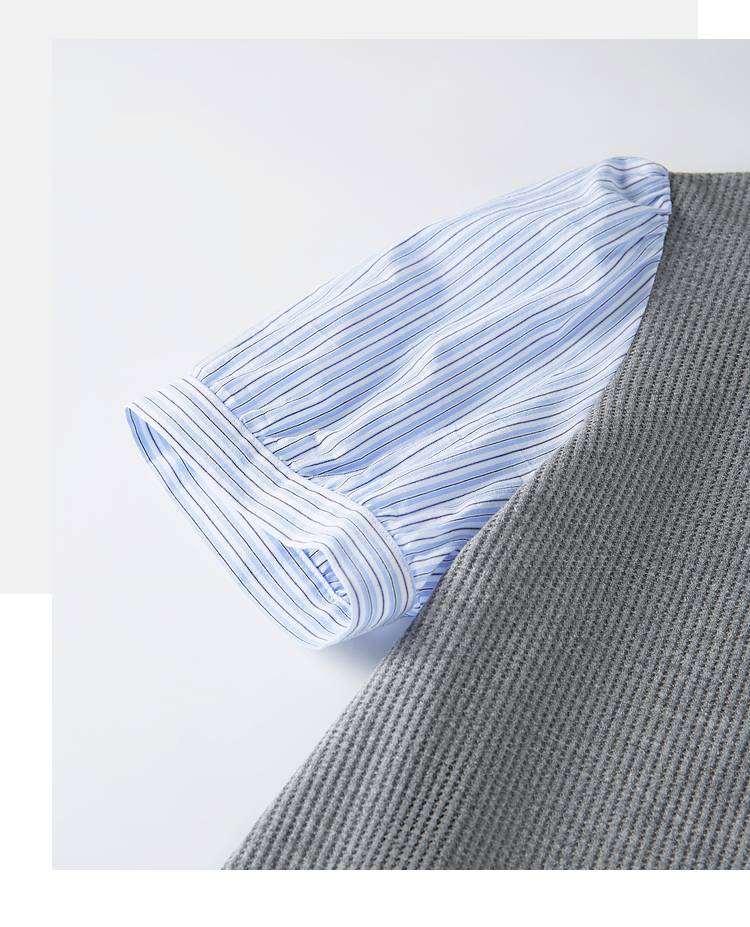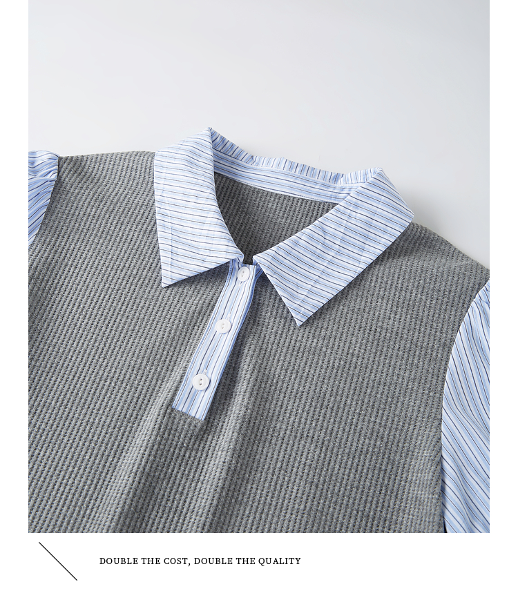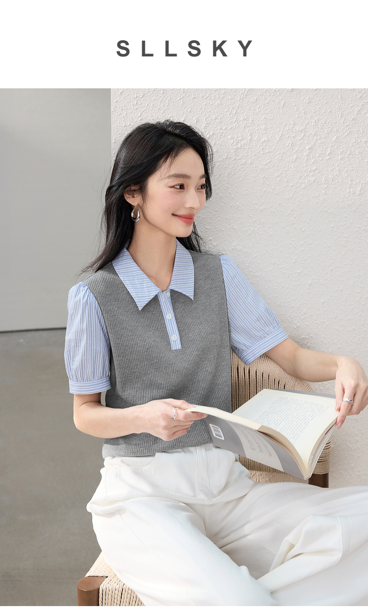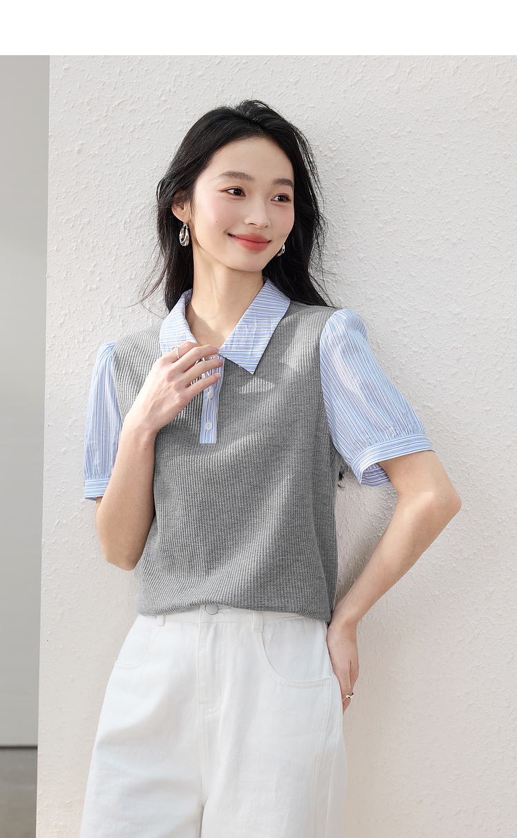 熙世界假两件POLO领条纹衬衫女短袖2025年夏季新款泡泡袖拼接上衣