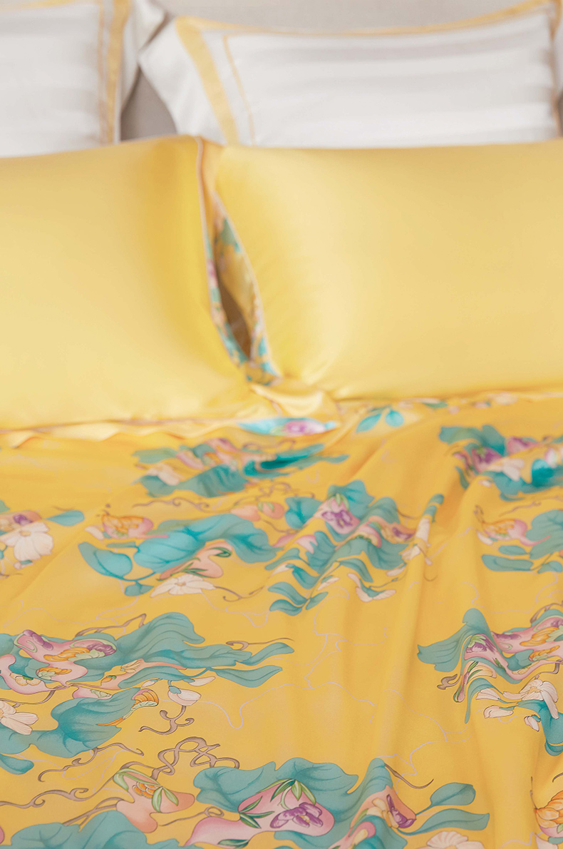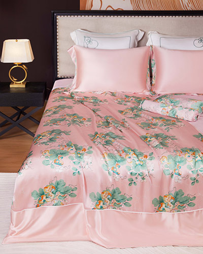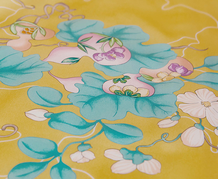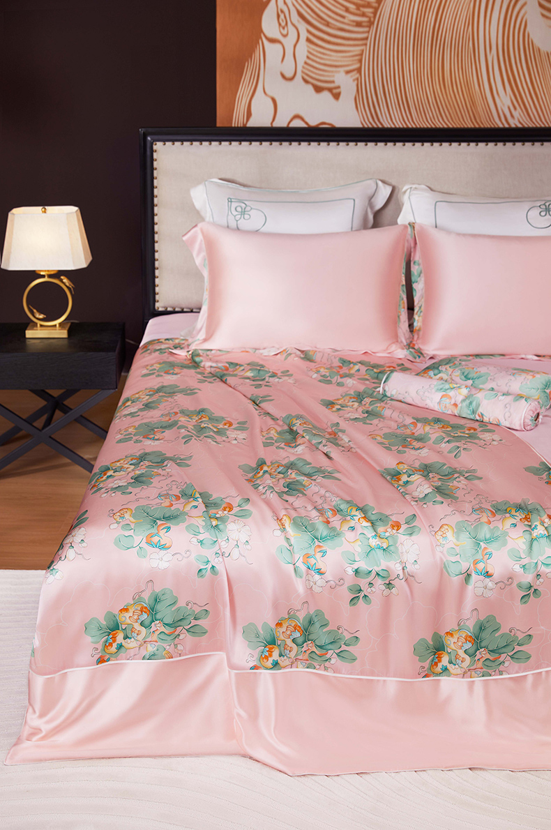 被面为印花软缎与素色软缎拼接,被里为素色软缎,触感柔软顺滑。
