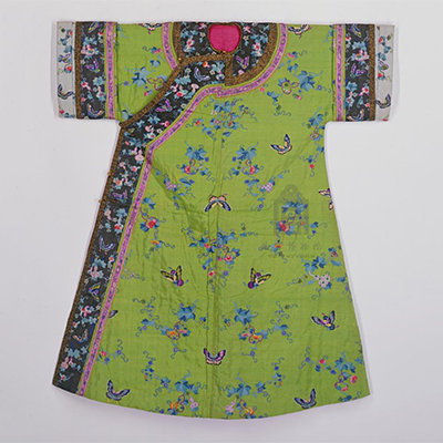 “灵感来源于宫廷的绿色缂丝子孙万代蝶纹棉衬衣。润泽饱满的葫芦,结于蜿蜒的藤蔓之上;缀以竹叶、寿桃、牡丹等吉祥图案。葫芦花伴葫芦叶,层层叠叠,动中有静,自然朴实,亦不失华贵。 葫芦其音“福禄”,象征幸福,其蔓密集绵延,结籽繁盛,亦表达子嗣昌吉、福禄万代之意。将美好的葫芦呈于君前,愿君一生,福禄绵长。
