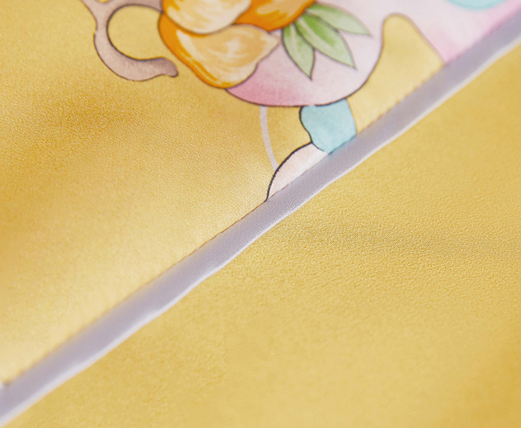 被子正面印花与素色拼接处采用宽牙边装饰,精致美观。