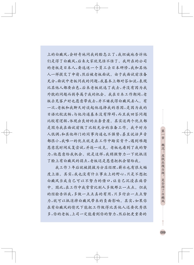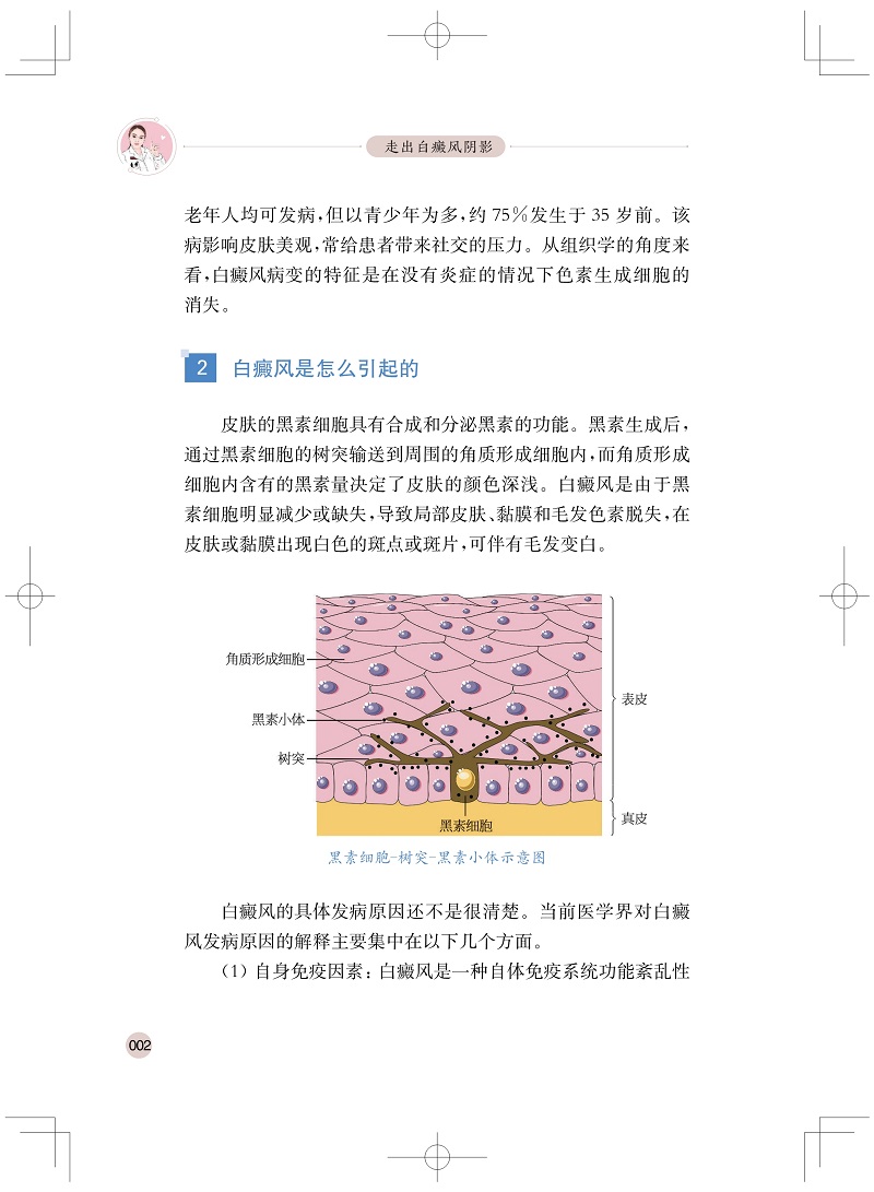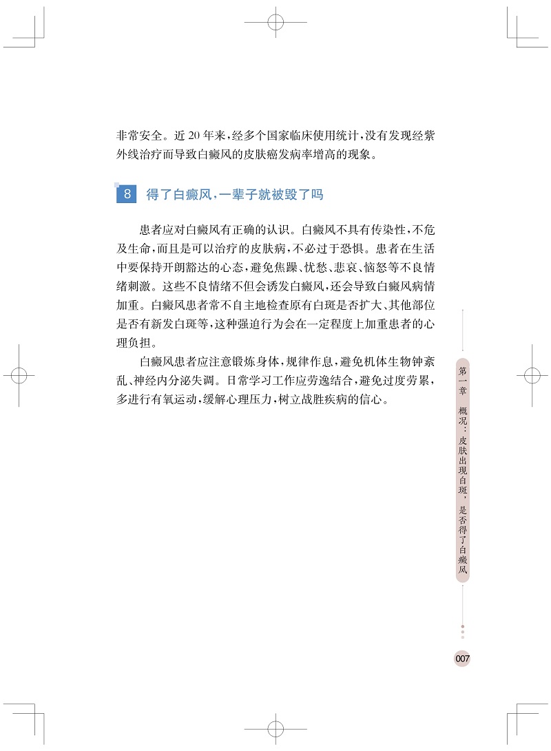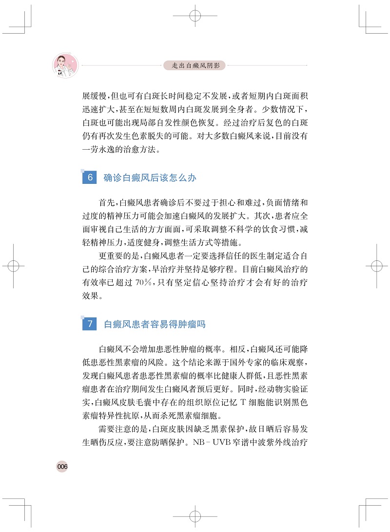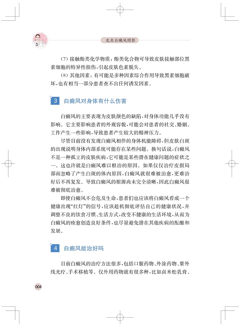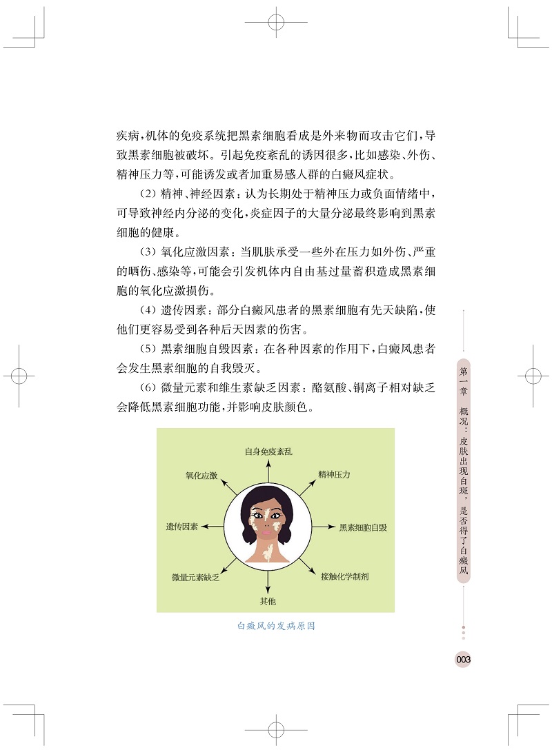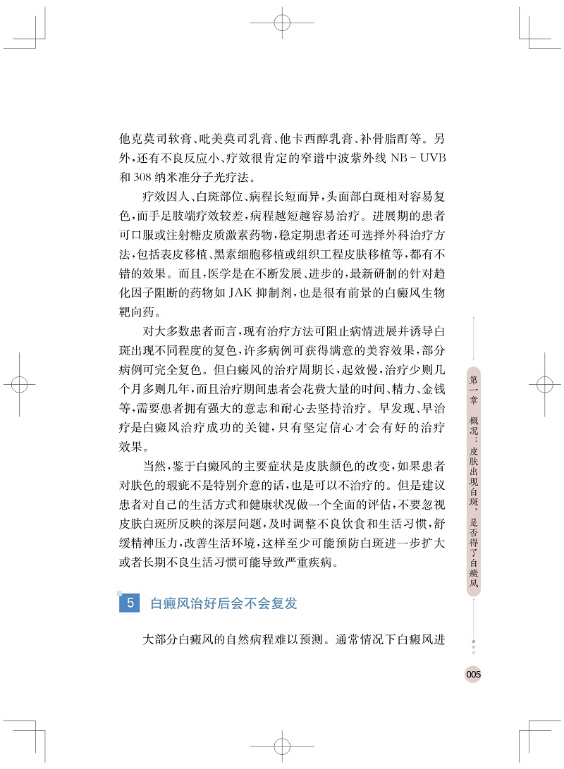 章 概况∶皮肤出现白斑,是否得了白癜风001 1.什么是白癜风001 2.白癜风是怎么引起的002 3.白癜风对身体有什么伤害004 4.白癜风能治好吗004 5.白癜风治好后会不会复发005 6.确诊白癜风后该怎么办006 7.白癜风患者容易得肿瘤吗006 8.得了白癜风,一辈子就被毁了吗007患友的故事∶ 白癜风长在脸上,依然可以活得精彩漂亮! 008第二章探因∶为什么会得白癜风011 9.什么是导致白癜风的核心因素011 10.精神和情绪对白癜风有影响吗013 11.饮食不当会导致白癜风吗013 12.皮肤受到的外在因素与白癜风有关吗014 13.季节、天气对白癜风有影响吗016 14.白癜风好发于哪些人 01715.白癜风会不会传染017 16.家人都有白癜风,是基因有问题吗017 17.白癜风遗传给孩子的风险有多大018 18.白癜风与职业有关吗018患友的故事∶你若盛开,清风自来020第三章确诊∶白癜风是什么症状,如何诊断024 19.白癜风的典型皮损表现是怎样的024 20.哪些皮肤白斑不属于白癜风025 21.诊断白癜风的有力"武器"有哪些025 22.需要化验哪些血液指标028 23.医生早期诊断白癜风有什么依据029 24.白癜风分为哪些类型029 25.如何判断白癜风处于进展期还是稳定期031 26.怎样评估白癜风皮损的严重程度032 27.晕痣是白癜风吗 034 28.白癜风病情进展有哪些信号035 29.什么是同形反应035 30.可以根据单个白斑判断白癜风病情进展吗036患友的故事∶家有"小白人",母亲的爱心守护037第四章治疗∶白癜风该怎么治疗042 31.如何和医生一起制定合适的治疗目标042 32.进展期和稳定期白癜风治疗的侧重点有什么不同043 33.白癜风进展很快该怎么办04434.控制白斑发展有哪些有效方法044 35.哪些方法可以促进白斑恢复正常肤色046 36.稳定期白癜风复色的四种方式049 37.白癜风常用治疗药物有哪些050 38.糖皮质激素可以治疗白癜风吗051 39.糖皮质激素治疗导致的不良反应可怕吗052 40.他克莫司和吡美莫司可用于白癜风长期管理吗 052 41.补骨脂素为何能治疗白癜风053 42.为什么医生推荐使用 NB-UVB 治疗面积较大的白癜风054 43.促进局限型白斑复色快的方法是什么055 44.紫外线光疗有哪些注意事项056 45.光疗会不会导致不良反应057 46.光疗有哪些禁忌证058 47.光疗百分百有效吗058 48.为什么不推荐光化学疗法059 49.如何选择适合的家用紫外线光疗仪059 50.稳定期顽固白斑的终极治疗方法是什么062 51.中医药可以治疗白癜风吗064 52.中医治疗白癜风有哪些方法065 53.泛发型白癜风的脱色疗法是什么066 54.生物制剂能治疗白癜风吗066 55.皮肤遮盖液该如何选择068 56.怎样选择适合自己的治疗方案069 57.儿童白癜风该如何选择治疗方案.071 58.白癜风患者可以怀孕吗071 59.妊娠期白癜风患者的治疗方案如何选择07260.患白癜风的新手妈妈如何平稳度过哺乳期073 61.怎样判断治疗白癜风的方法有效073 62.尝试多种疗法短期不见效就可以放弃吗074 63.怎样避免白癜风复发074患友的故事∶白癜风三个月复色——工程师的自我救赎之路076第五章盼愈∶白癜风患者日常生活中的注意事项081 64.为什么科学的生活作息和乐观的心态有助于白癜风康复081 65.白癜风患者可以正常结婚、生育吗082 66.如何保护白斑皮肤083 67.食疗有助于促进白癜风康复吗084 68.哪类体育锻炼适合白癜风患者085 69.白癜风患者可以吸烟、饮酒吗086 70.为什么保持平和乐观的心态是病情稳定和白斑复色的重要条件087 71.养成乐观心态的方法有哪些087 72.家长应该如何面对孩子得了白癜风089 73.老年患者治疗白癜风要注意什么090 74.报纸、网络上的治白癜风广告靠谱吗091 75.伪"专科医院"接诊白癜风有什么套路093 76.白癜风治疗如何避坑094患友的故事∶白癜风教给我的人生哲学——在这世上,除了生死,都是小事!096附录 用得到的科普知识与信息100