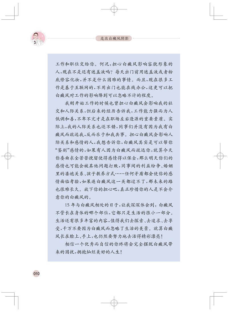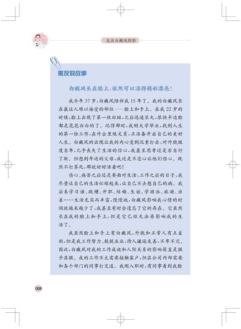 本书从白癜风患者想知道的问题入手,深入浅出地介绍了白癜风的病因、发病机理、临床表现、诊断、治疗和生活注意事项,特别指出人们对白癜风认识的误区。书中还分享了几位患者的故事,这些故事中展现的顽强意志,分享的人生感悟令人深受触动,相信对白癜风患者具有强大的鼓舞和疗愈作用。