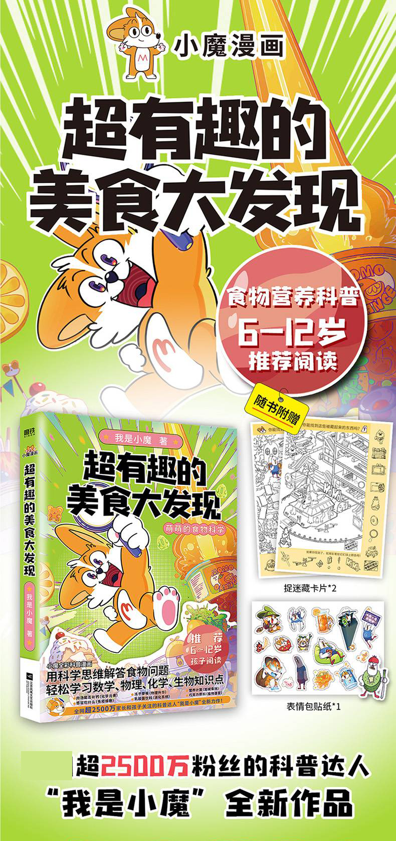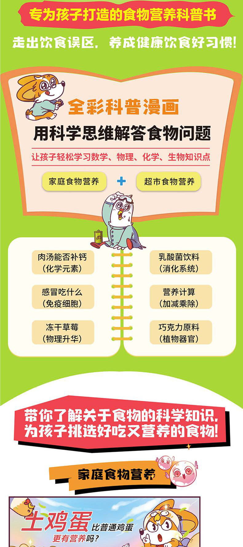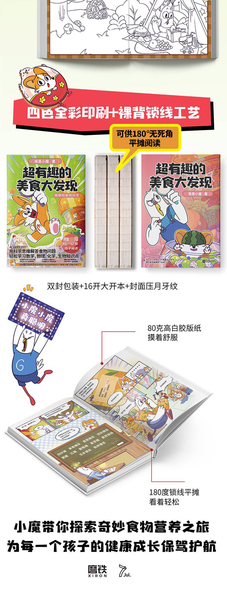 "◆超2500万粉丝科普达人“我是小魔”全新作品,为孩子量身打造的食物营养科普书!科普家庭食物营养 + 超市食物营养,两大日常生活场景里的食物,让孩子和家长走出饮食误区,为每一个孩子的健康成长保驾护航! 土鸡蛋比普通鸡蛋更有营养吗? 每天喝牛奶能长高吗? 吃核桃能变聪明吗? 吃蓝莓对眼睛好吗? 怎样分辨果汁的优劣? 怎样识别巧克力的好坏? 怎样买到品质好的牛肉干? 怎么看懂包装上的配料表? ◆用科学思维解答食物营养问题,培养孩子学科思维。全彩漫画形式,让孩子轻松了解食物里的数学、物理、化学、生物小知识。 ·肉汤能否补钙(化学元素) ·感冒吃什么(免疫细胞) ·冻干草莓(物理升华) ·乳酸菌饮料(消化系统) ·营养计算(加减乘除) ·巧克力原料(植物器官) ◆拟人化形象设计,聪明狗“小魔”+大笨鸟“咕咕咕”+暴躁“咕咕妈”,绝妙欢乐组合,让孩子在“哈哈哈”中轻松获取知识。 ◆内容形式丰富,孩子可以沉浸式自主阅读:每一帧画面精打细磨+每一个生僻字都有注音+神奇课堂复结+轻松一刻闯迷宫+练习简笔画,让孩子在阅读中兴趣互动! ◆ 线装16大开本+封面压月牙纹+180°锁线平摊,方便孩子轻松阅读。"