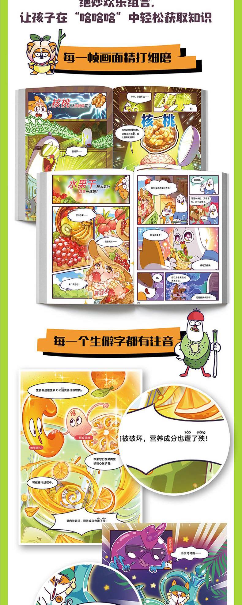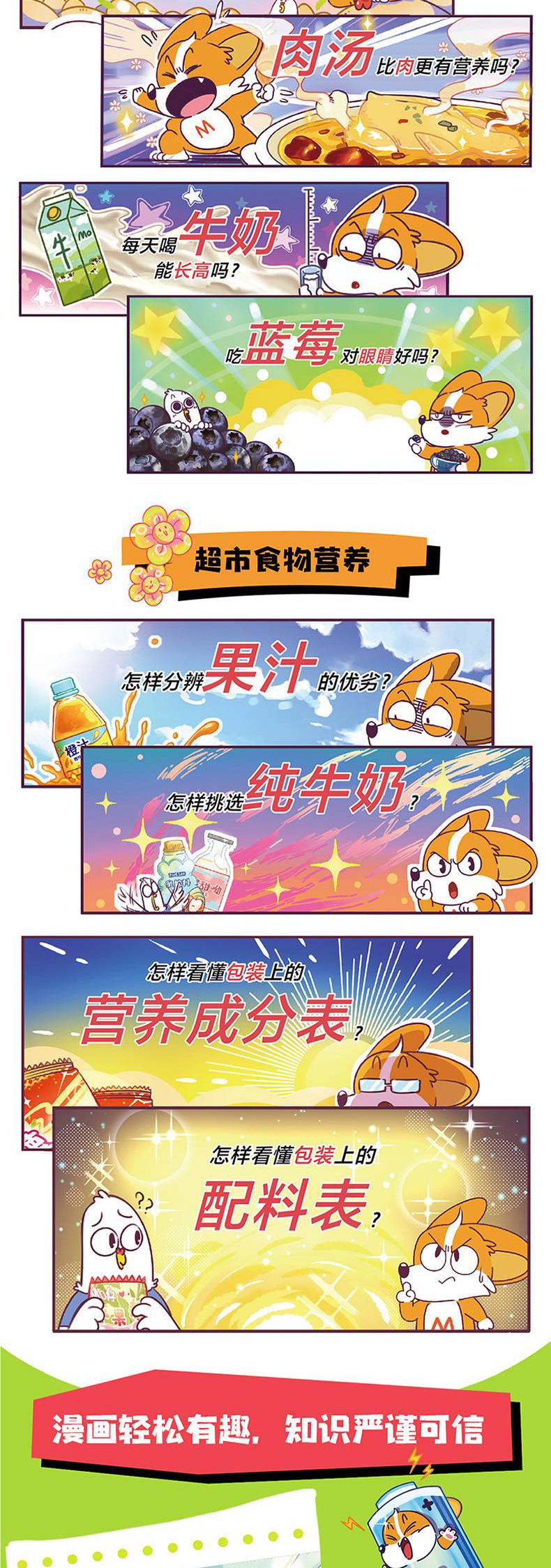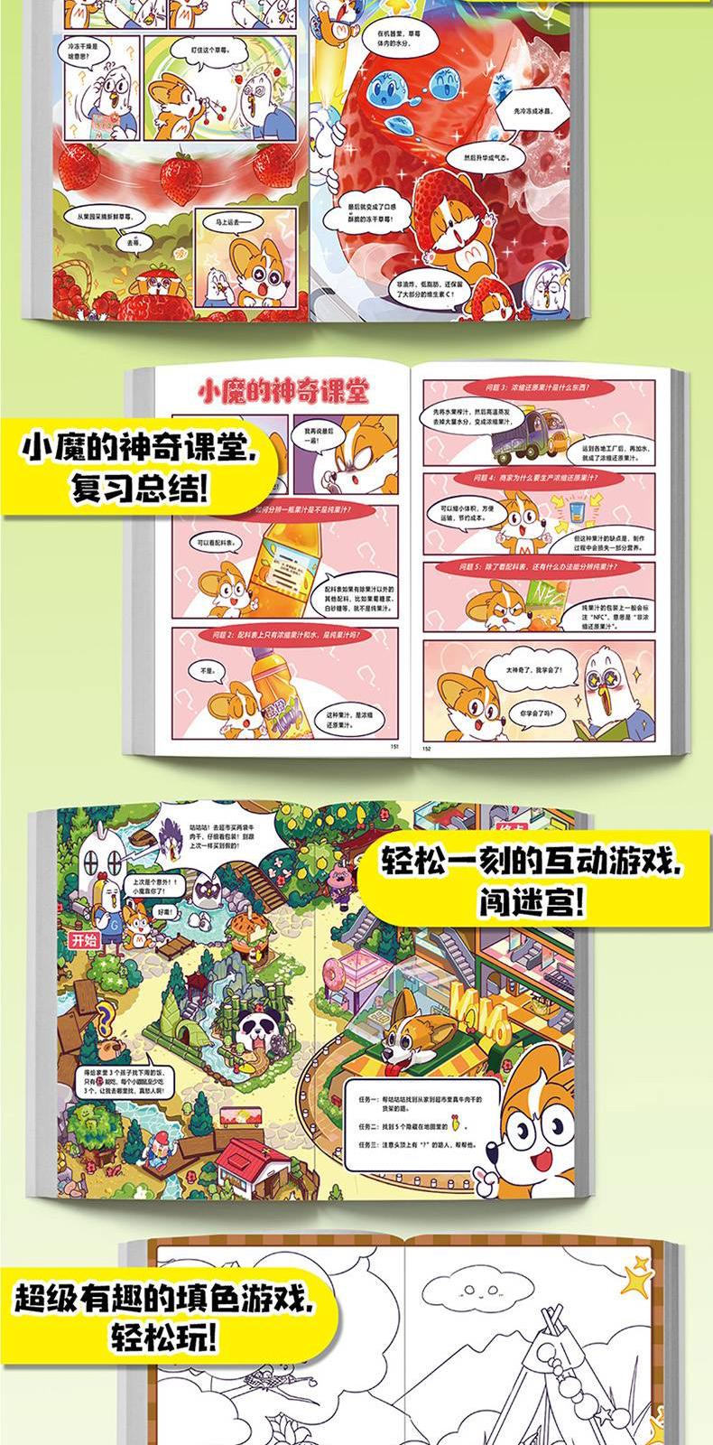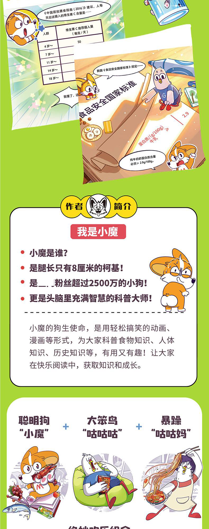 "◆超2500万粉丝科普达人“我是小魔”全新作品,为孩子量身打造的食物营养科普书!科普家庭食物营养 + 超市食物营养,两大日常生活场景里的食物,让孩子和家长走出饮食误区,为每一个孩子的健康成长保驾护航! 土鸡蛋比普通鸡蛋更有营养吗? 每天喝牛奶能长高吗? 吃核桃能变聪明吗? 吃蓝莓对眼睛好吗? 怎样分辨果汁的优劣? 怎样识别巧克力的好坏? 怎样买到品质好的牛肉干? 怎么看懂包装上的配料表? ◆用科学思维解答食物营养问题,培养孩子学科思维。全彩漫画形式,让孩子轻松了解食物里的数学、物理、化学、生物小知识。 ·肉汤能否补钙(化学元素) ·感冒吃什么(免疫细胞) ·冻干草莓(物理升华) ·乳酸菌饮料(消化系统) ·营养计算(加减乘除) ·巧克力原料(植物器官) ◆拟人化形象设计,聪明狗“小魔”+大笨鸟“咕咕咕”+暴躁“咕咕妈”,绝妙欢乐组合,让孩子在“哈哈哈”中轻松获取知识。 ◆内容形式丰富,孩子可以沉浸式自主阅读:每一帧画面精打细磨+每一个生僻字都有注音+神奇课堂复结+轻松一刻闯迷宫+练习简笔画,让孩子在阅读中兴趣互动! ◆ 线装16大开本+封面压月牙纹+180°锁线平摊,方便孩子轻松阅读。"
