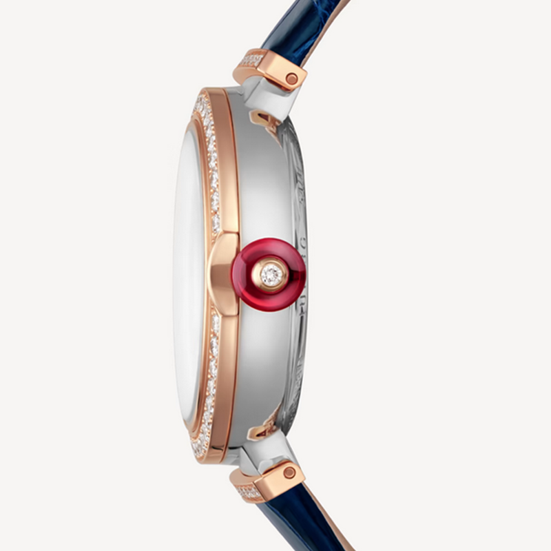 镜面 材质 | 蓝宝石水晶玻璃 | 表盘 | 18k玫瑰金表壳,表圈镶嵌钻石 饰以蓝色漆面的“BVLGARI”标志字母镂空表盘 18K玫瑰金表冠镶嵌凸形蛋面切割粉色宝石并饰以明亮式切割钻石 |