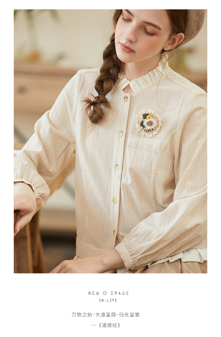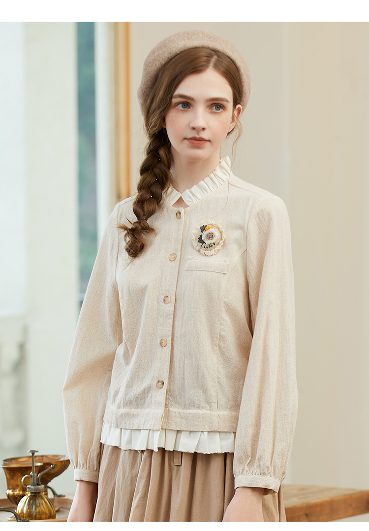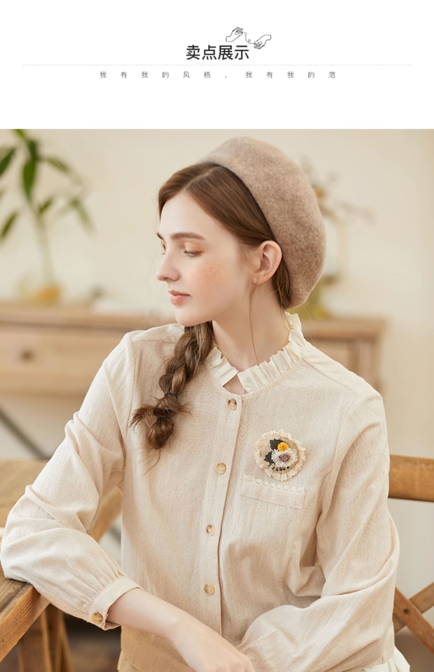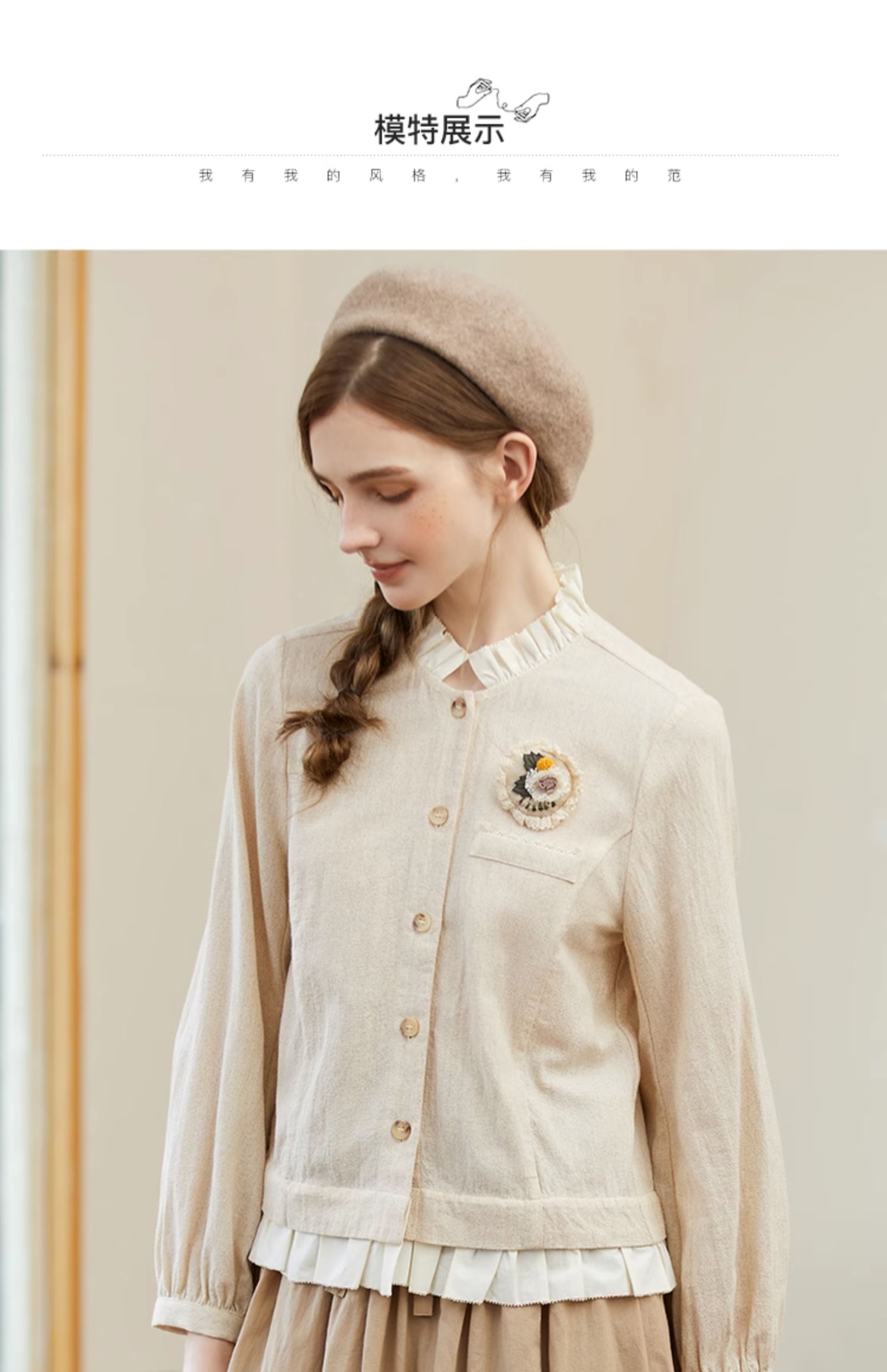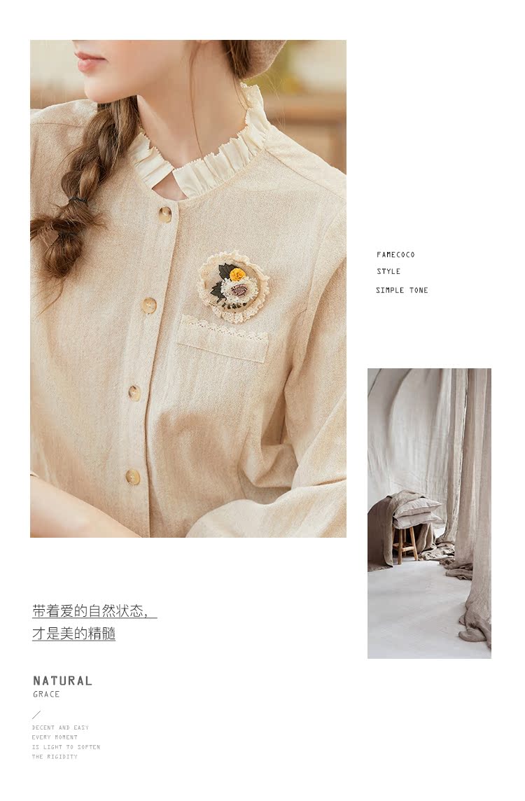 Famecoco范可儿花农诗人假两件棉麻衬衫女士秋款长袖开衫衬衣F225AB007