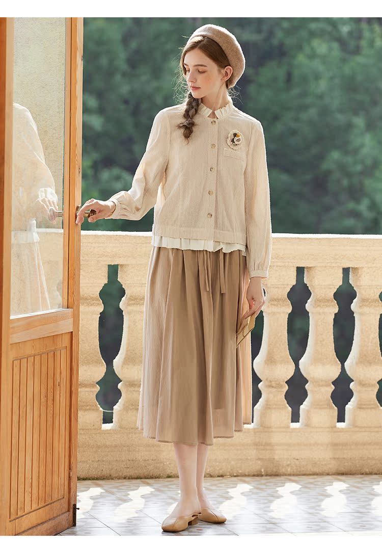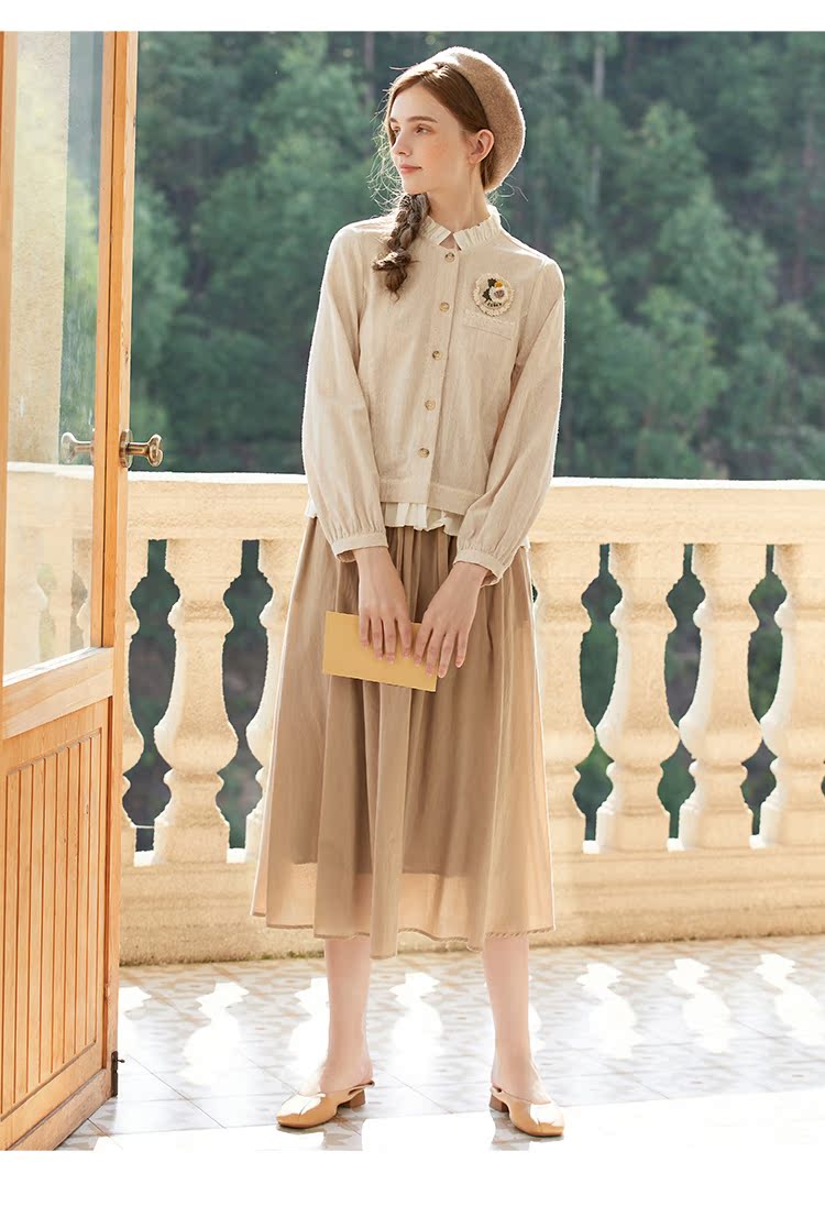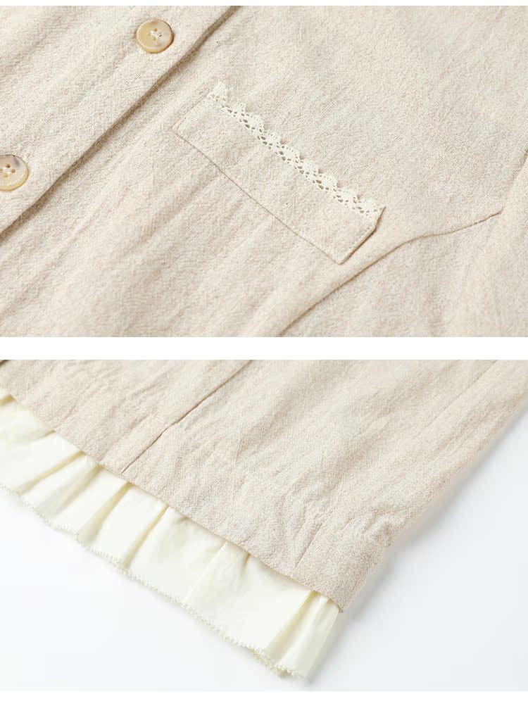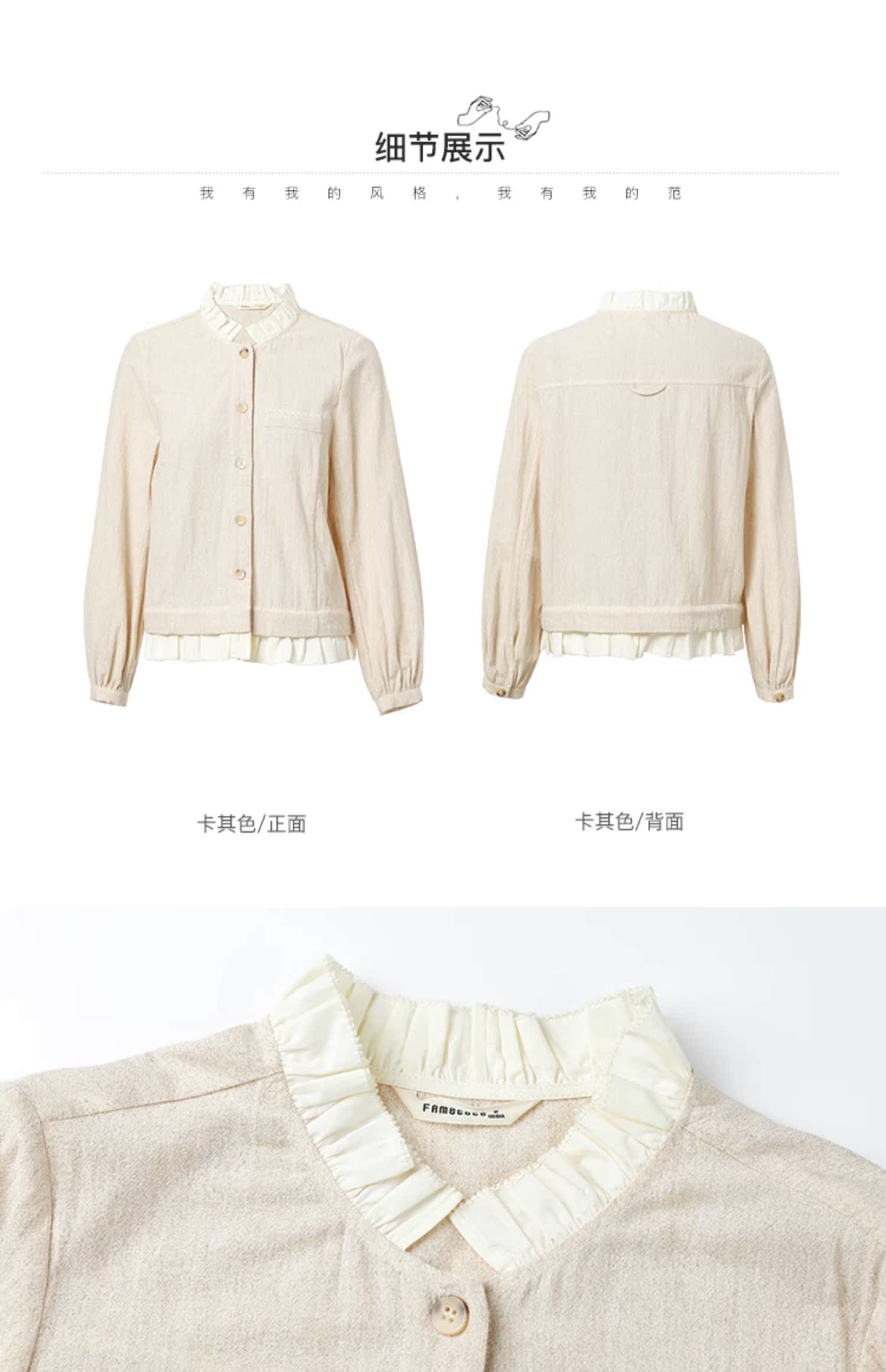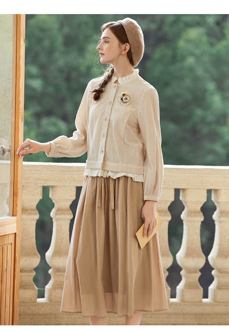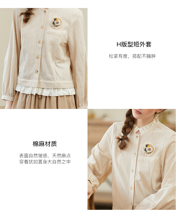 Famecoco范可儿花农诗人假两件棉麻衬衫女士秋款长袖开衫衬衣F225AB007