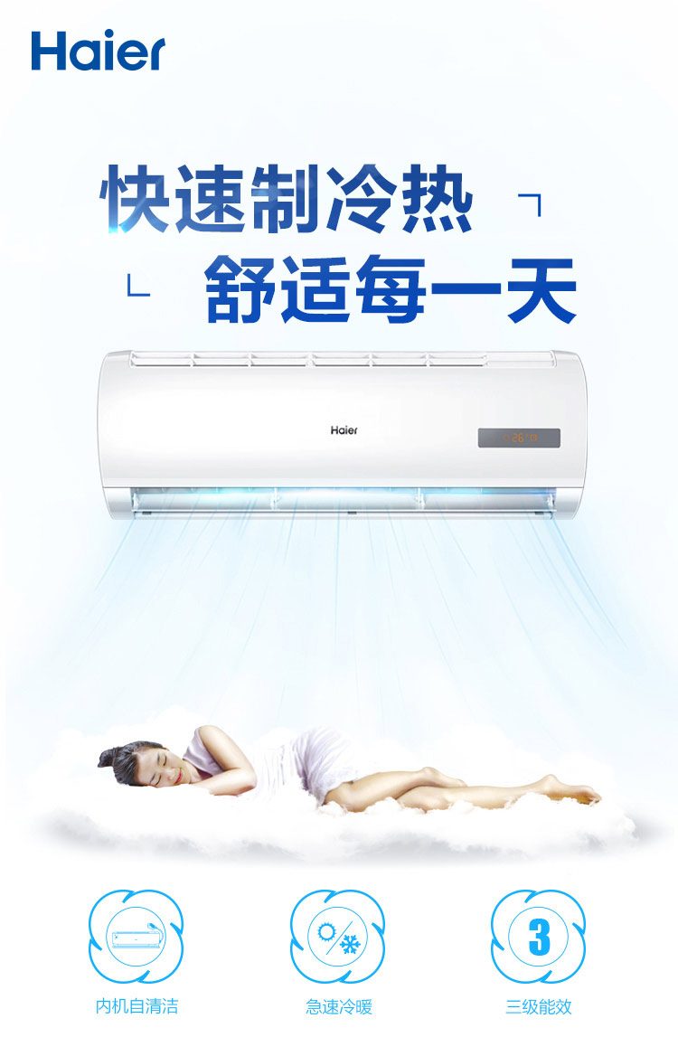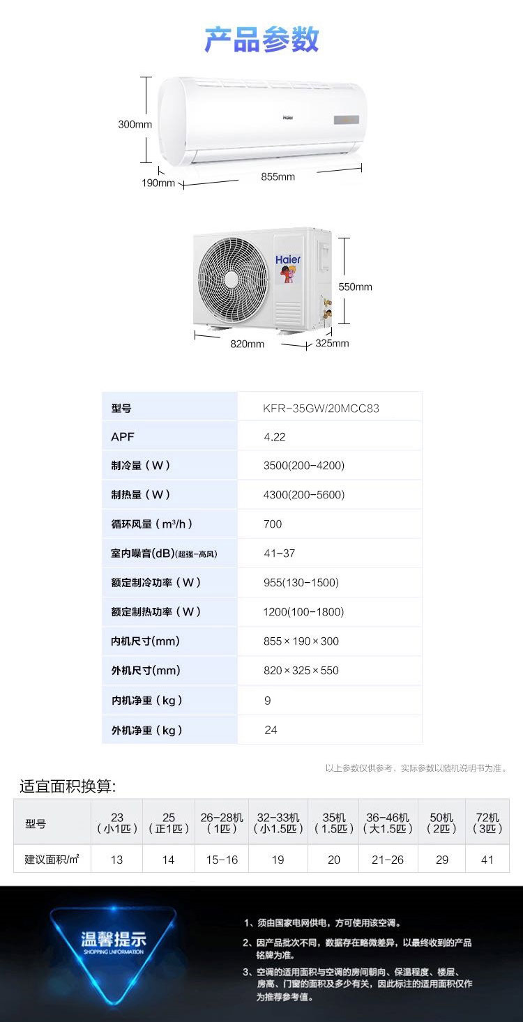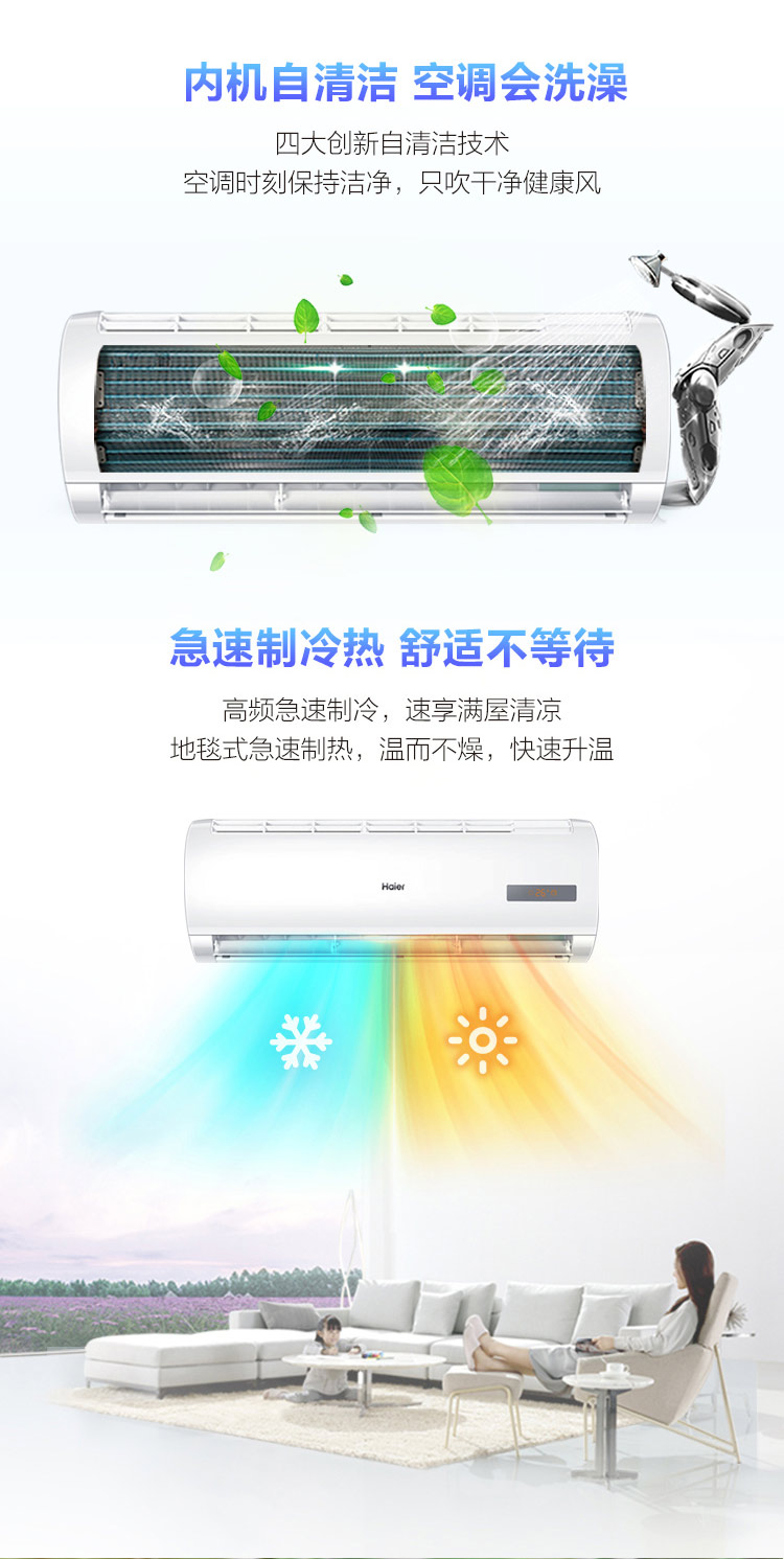 海尔(140188)家用空调KFR-35GW/20MCC83套机健康:内机自清洁,清洗更便捷,出风更洁净 舒适:双核PID变频科技,PMV,舒适又节能 强劲:品质压机,强劲动力,速冷强热