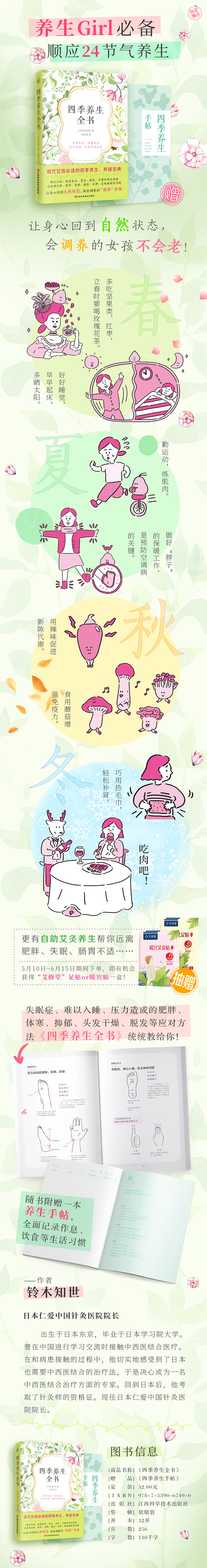 《四季养生全书》针对不同季节、不同节气的自然变化,阐述了起居作息、饮食养生、精神调节与运动指南等的内容,科学、简明、实操性强,搭配手绘插图,把二十四节气里的养生智慧融入现代女性的日常生活,是当下养生Girl的之书。