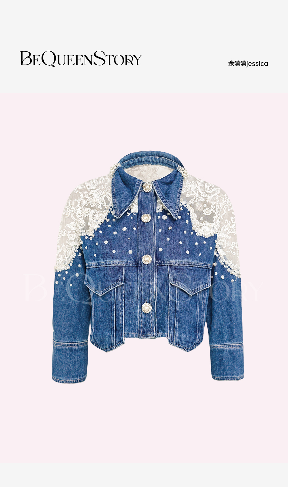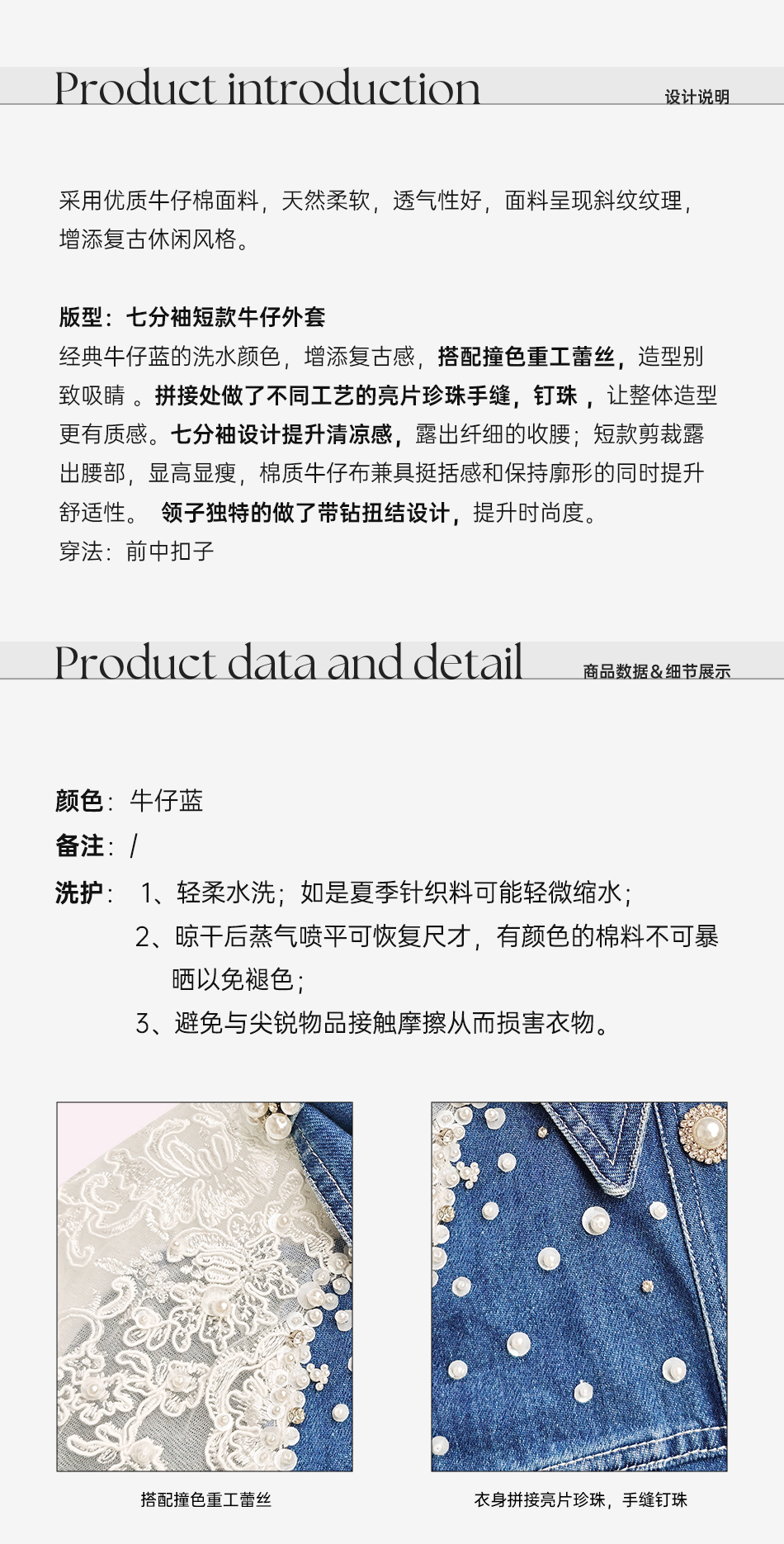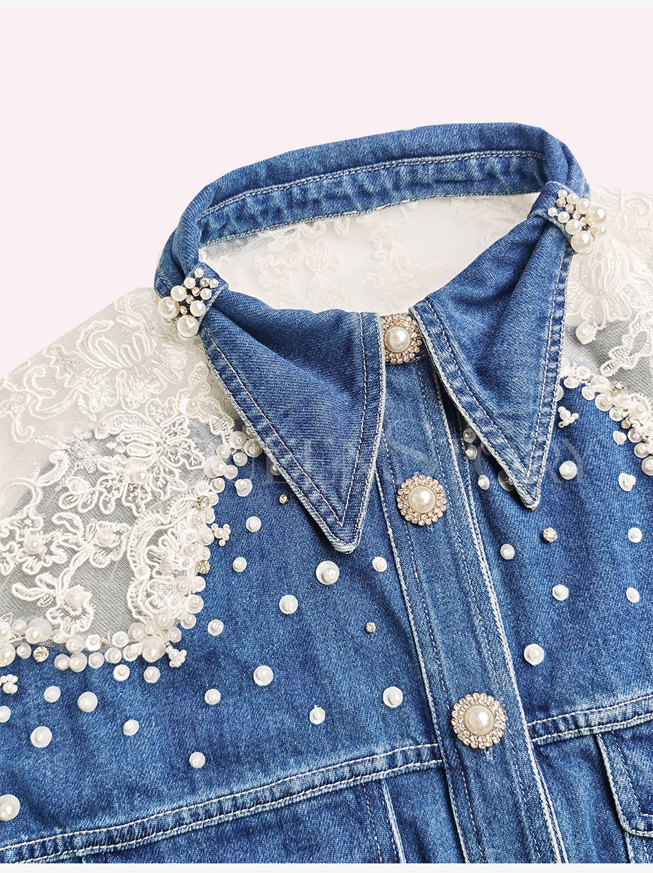 【孤品样衣,不退不换】【浪漫幻影】重工拼接蕾丝手缝亮片珍珠七分袖短款牛仔棉外套