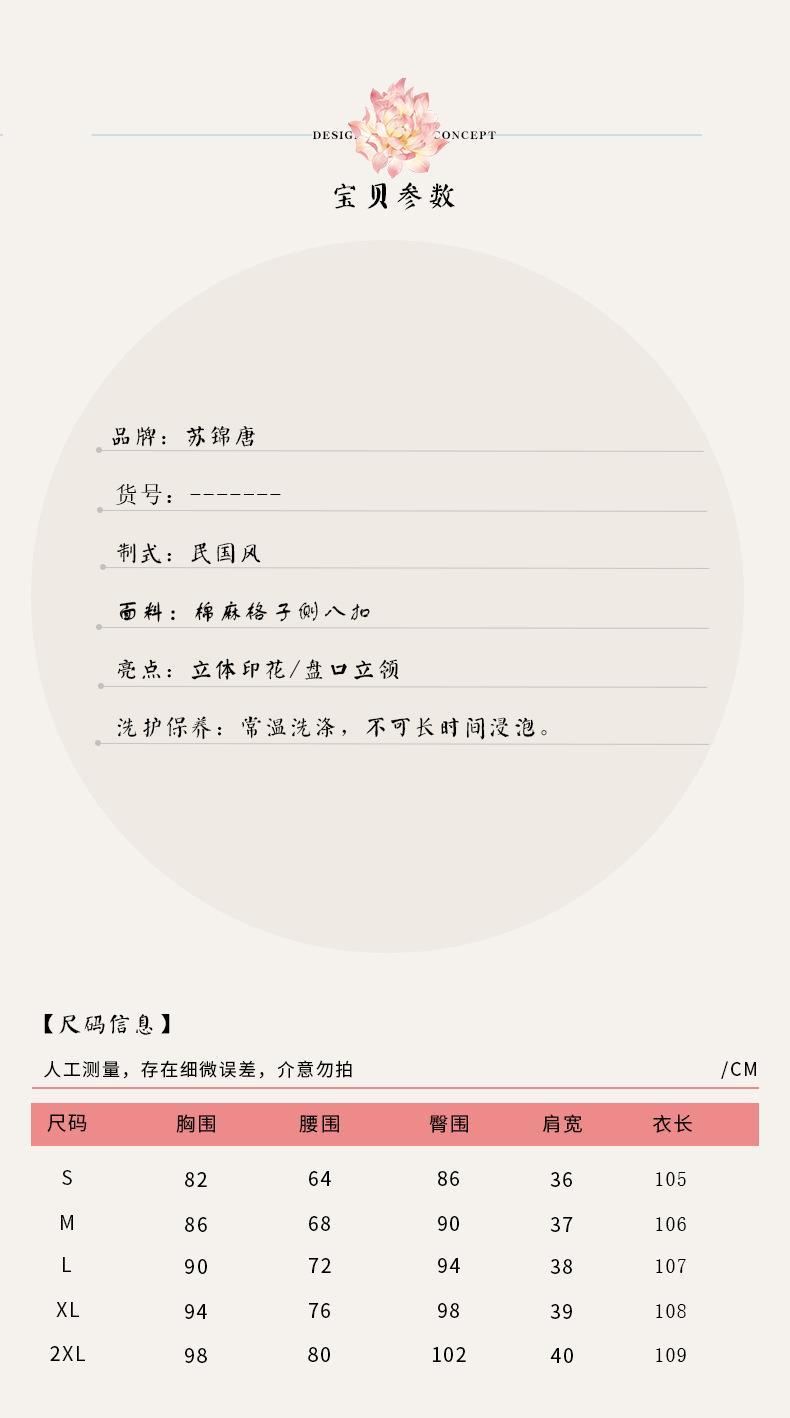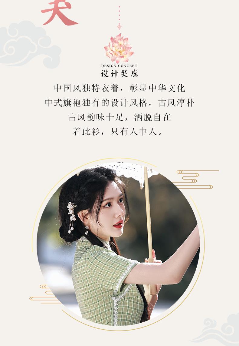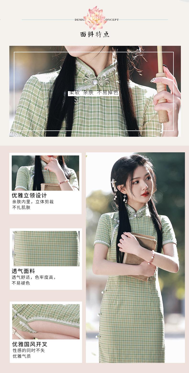 2023春夏新款棉麻格子侧八扣中长款旗袍连衣裙日常复古改良民国风