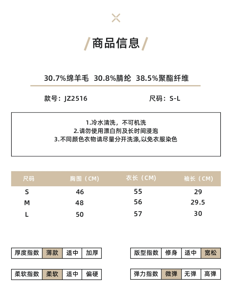 面料:30.7%绵羊毛,30.8%腈纶,38.5%聚酯纤维