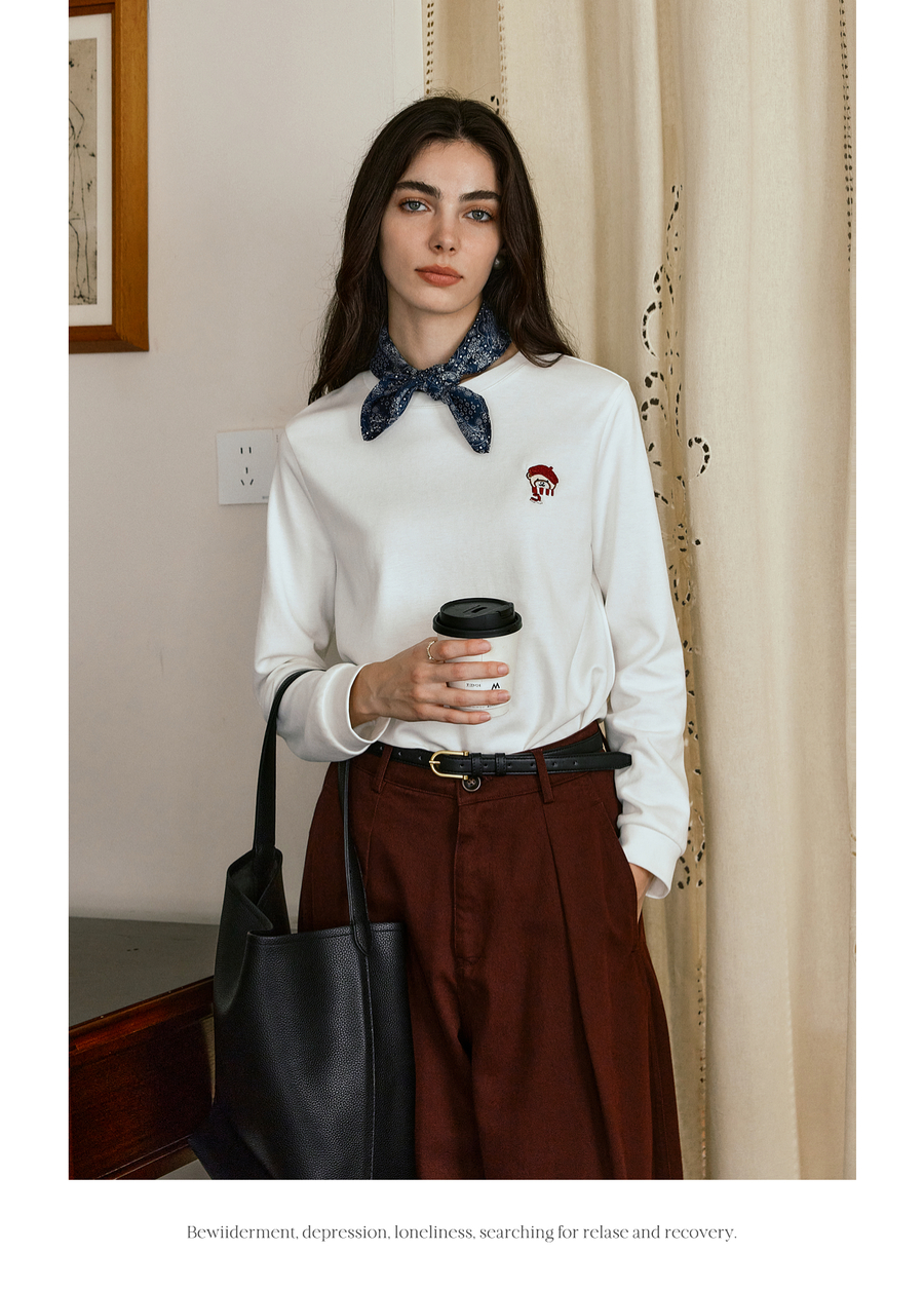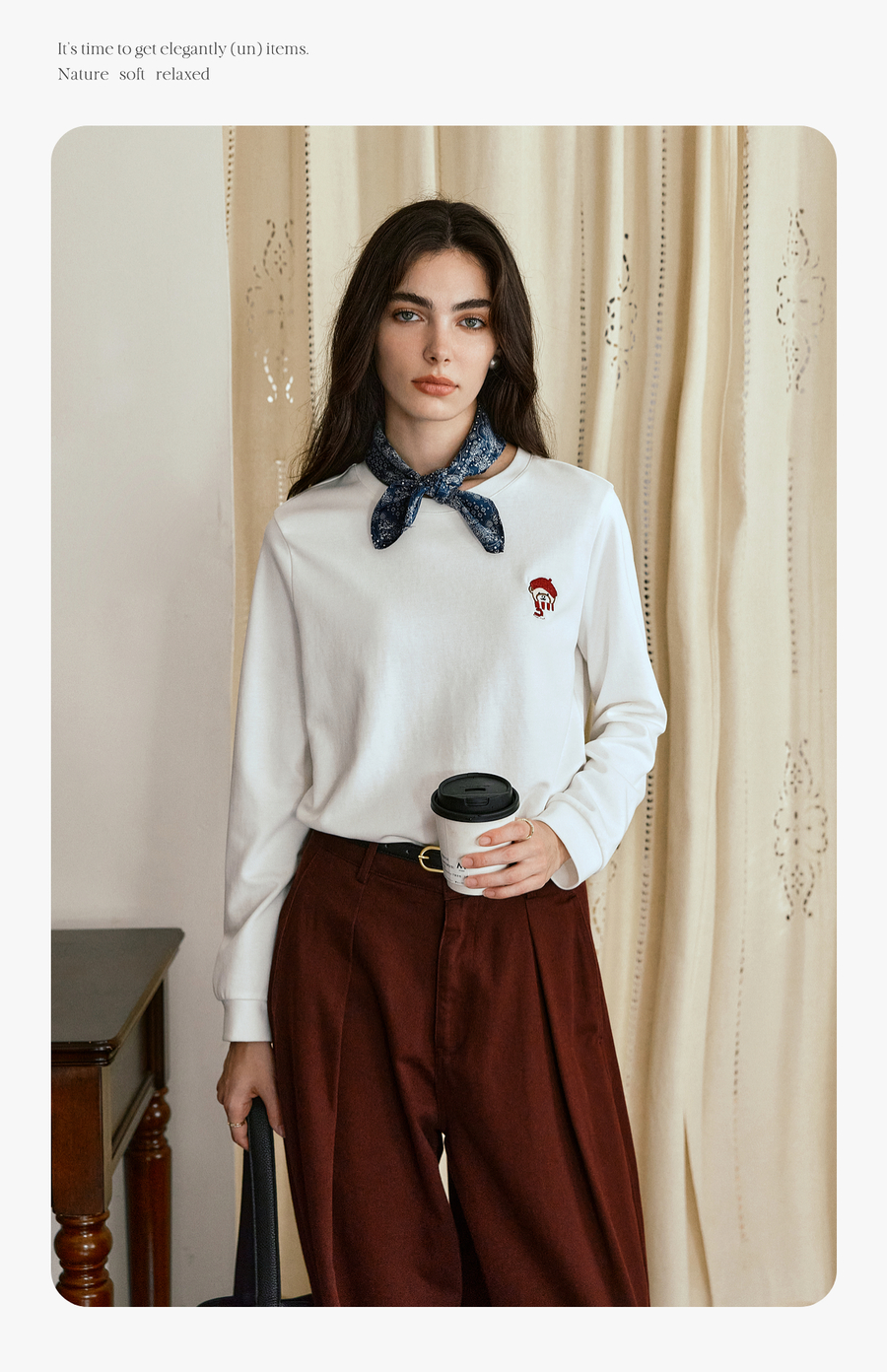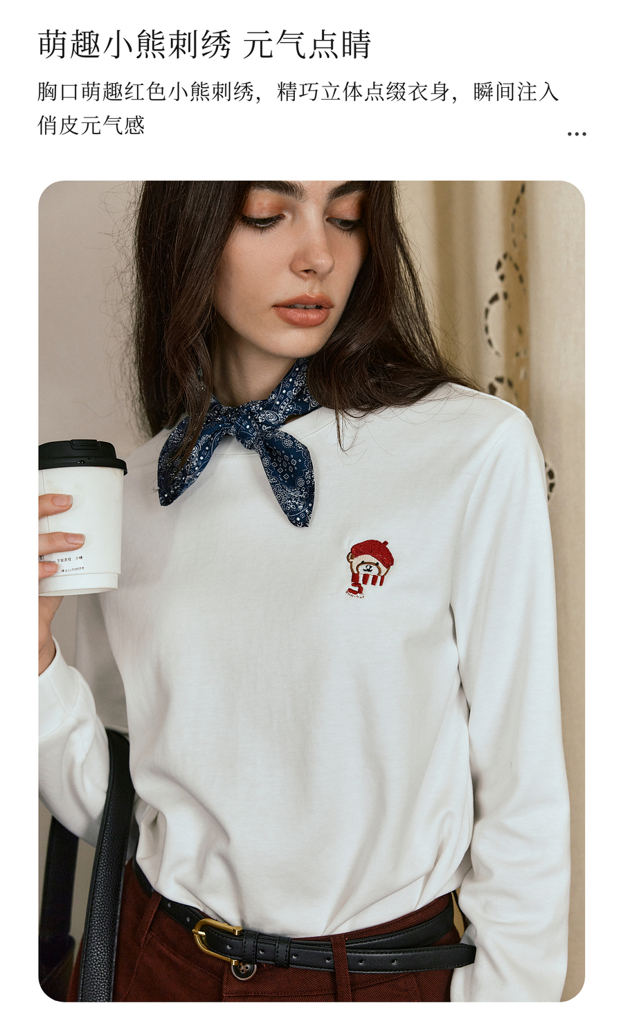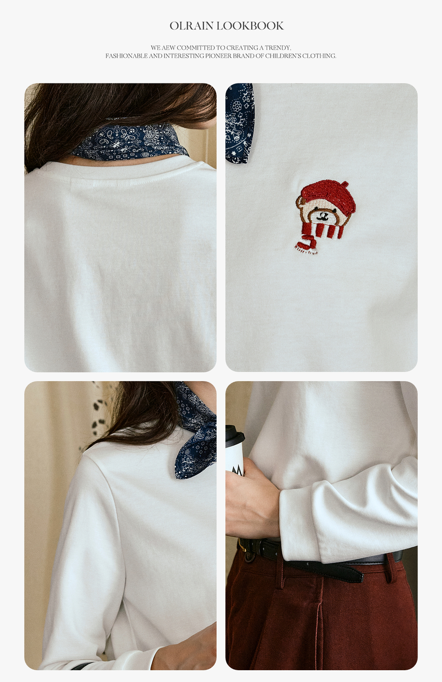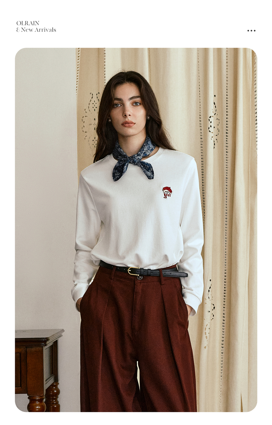 OLrain欧芮儿法式刺绣宽松长袖T恤女秋季2025新款休闲针织上衣
