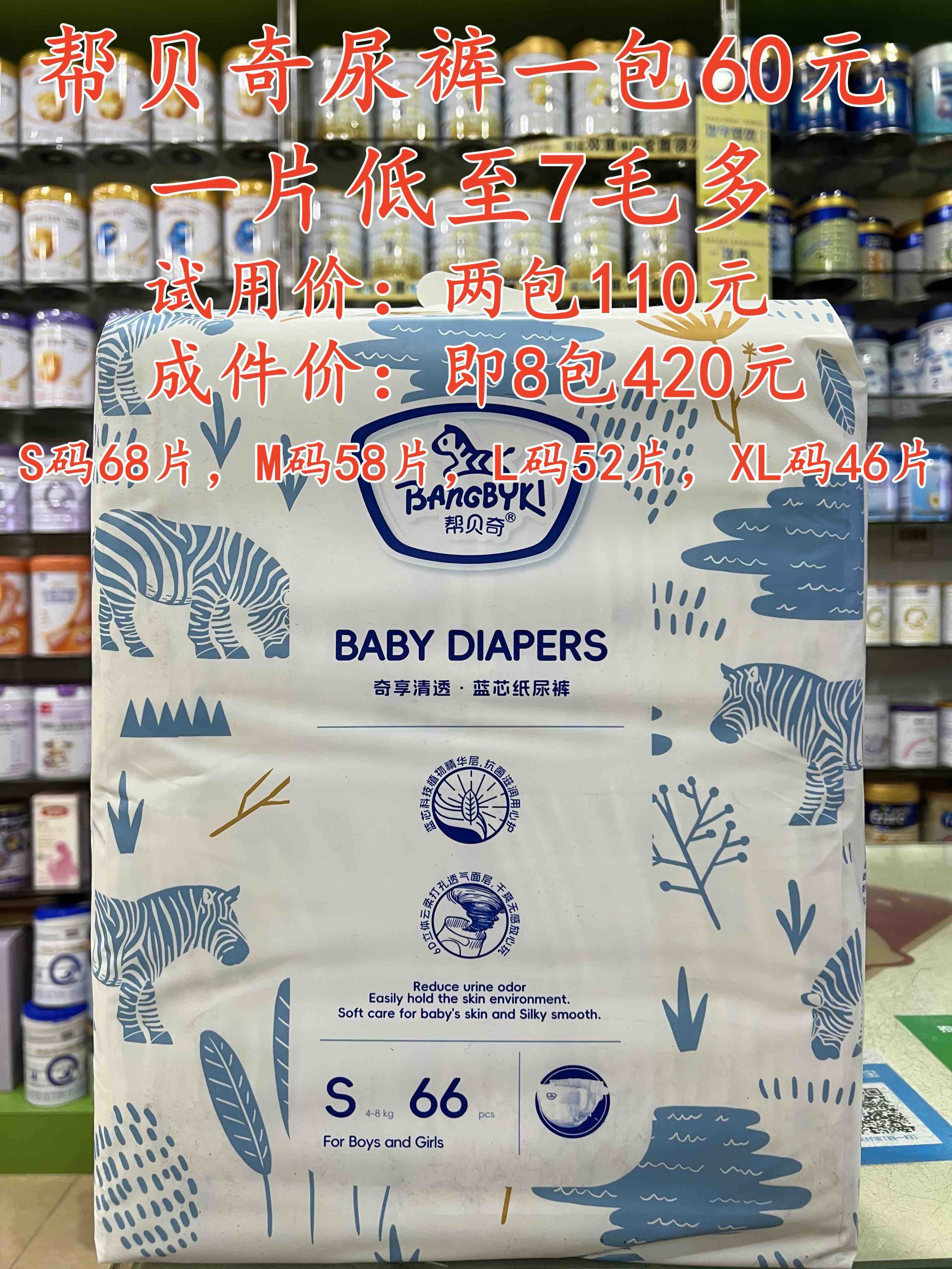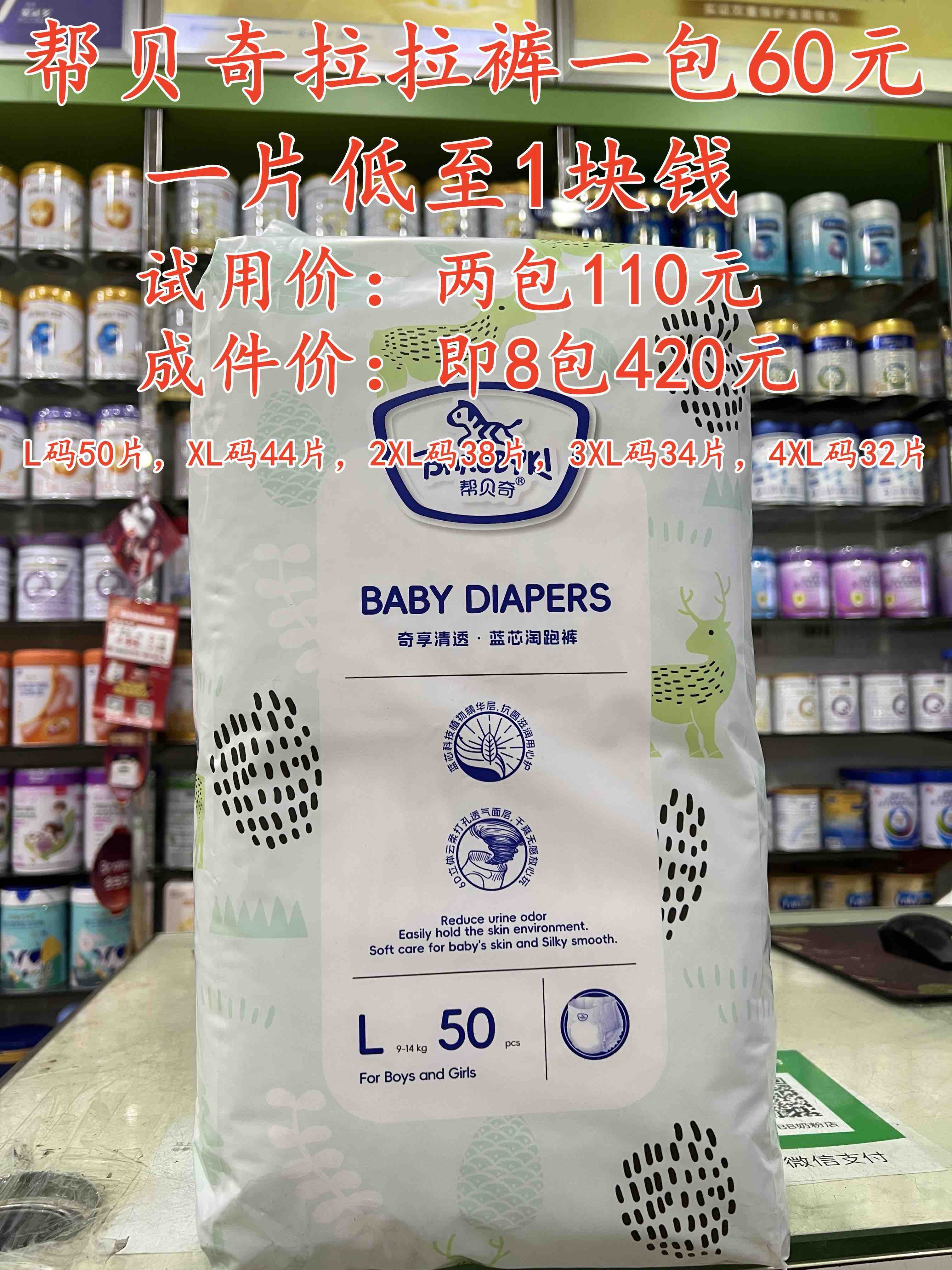 帮贝奇尿裤+拉拉裤一包60元,【两包底价出货】,成件购买更实惠。 试用价:两包110元. 成件价:即8包420元.