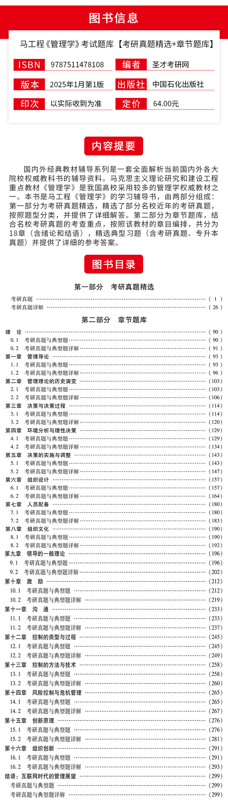 国内外*教材辅导系列是一套*解析当前国内外各大院校*教科书的辅导资料。马克思主义理论研究和建设工程重点教材《管理学》是我国高校采用较多的管理学*教材之一。本书是马工程《管理学》的学习辅导书,由两部分组成:*部分为考研真题精选,精选了部分名校近年的考研真题,按照题型分类,并提供了详解。*部分为章节题库。结合名校考研真题的考查重点,按照该教材的章目编排,共分为18章(含绪论和结语),精选典型习题(含考研真题、专升本真题)并提供了详细的参考答案。