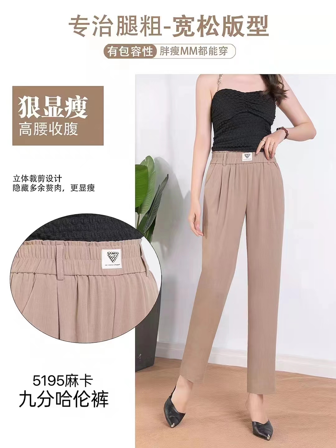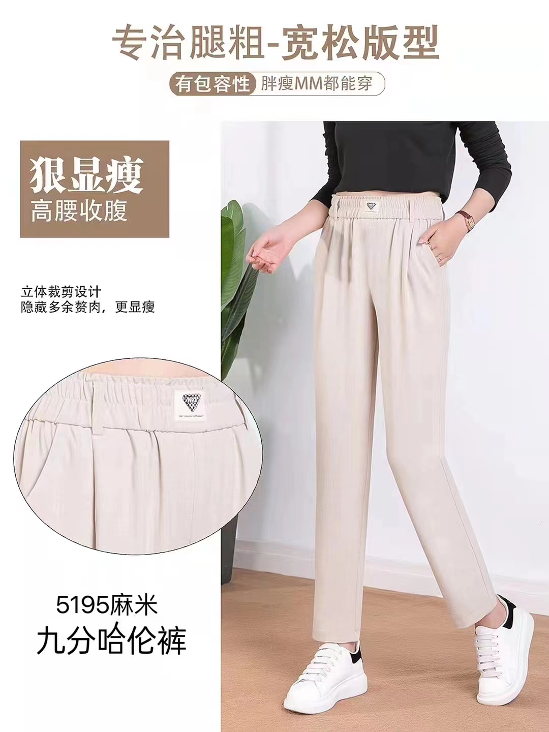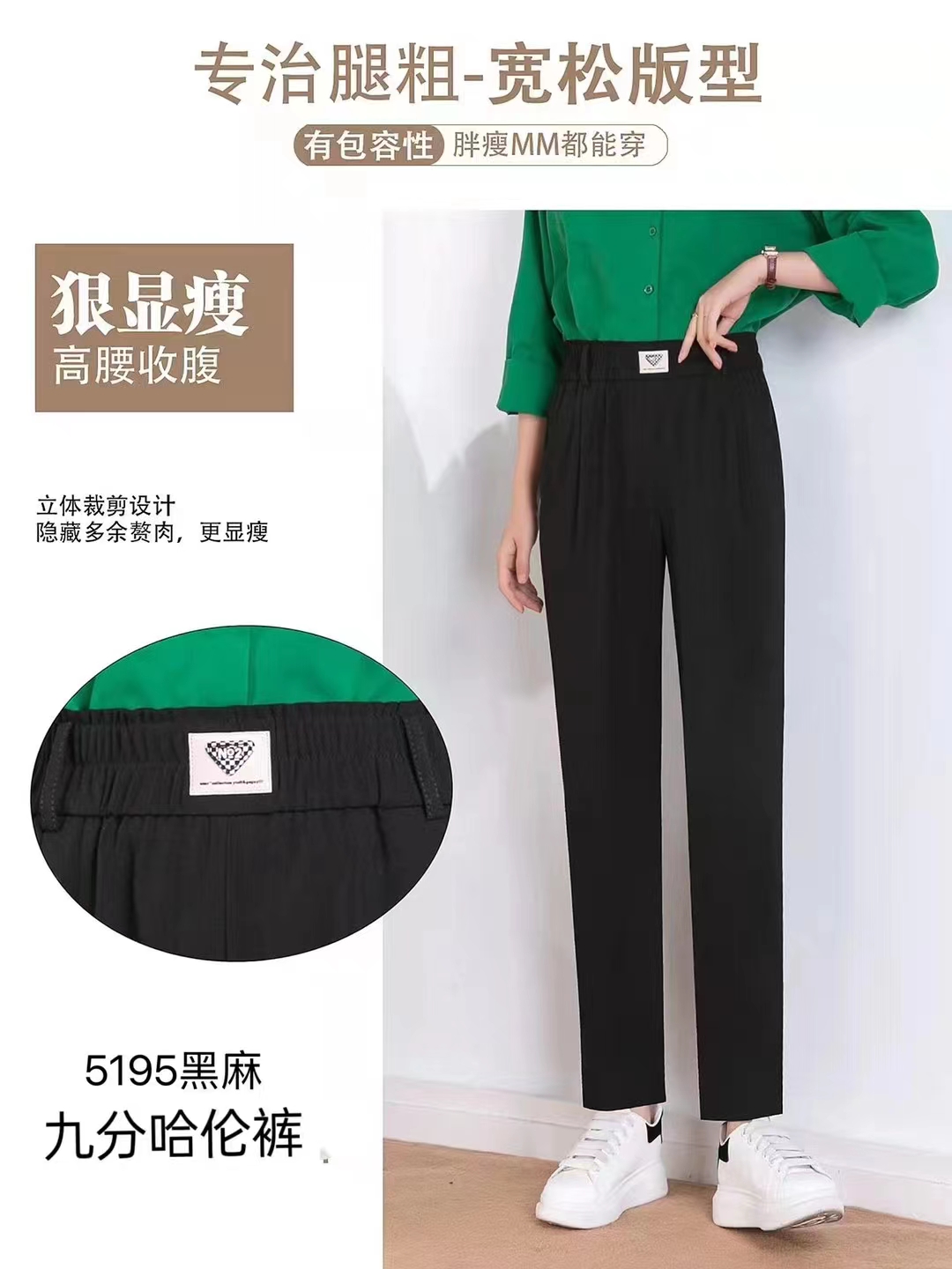 面料:棉麻丝哈伦裤,面料柔软舒适、透气性好,版型简单大方,遮胯效果好,适合30岁以上人群穿着,搭配衬衫、体恤衫均可