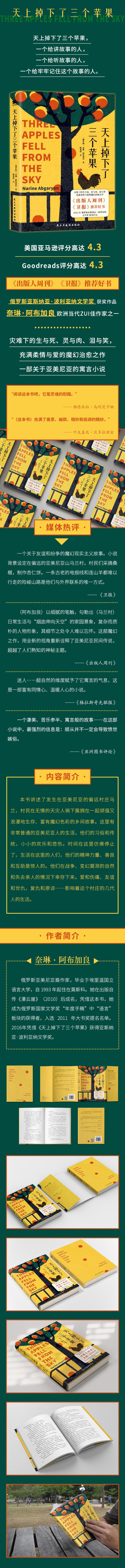本书讲述了发生在亚美尼亚的偏远村庄马兰里,村民在无情的天灾人祸下簇拥在一起顽强又浪漫地生存、富有魔幻色彩的乡间故事。这里有非常普通的亚美尼亚人的生活,他们的习俗和传统,小小的欢乐和悲伤。时间在这里仿佛停止了,生活在这里的人们,他们的精神力量、善良和互助是惊人的。他们在战争、变幻莫测的自然和失去亲人的情况下幸存下来。爱和伤痛、友谊和世仇,复仇和原谅……影响着这个村庄的几代人的生活。