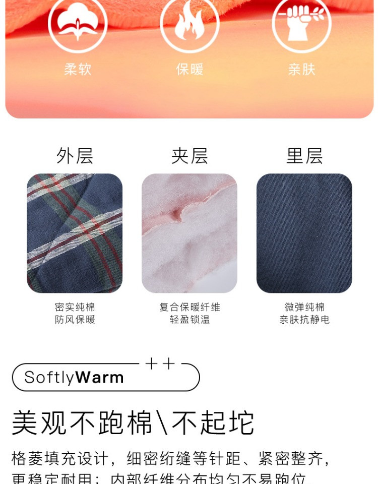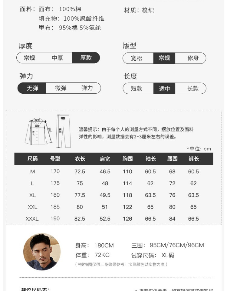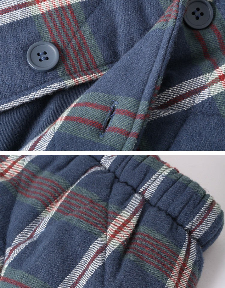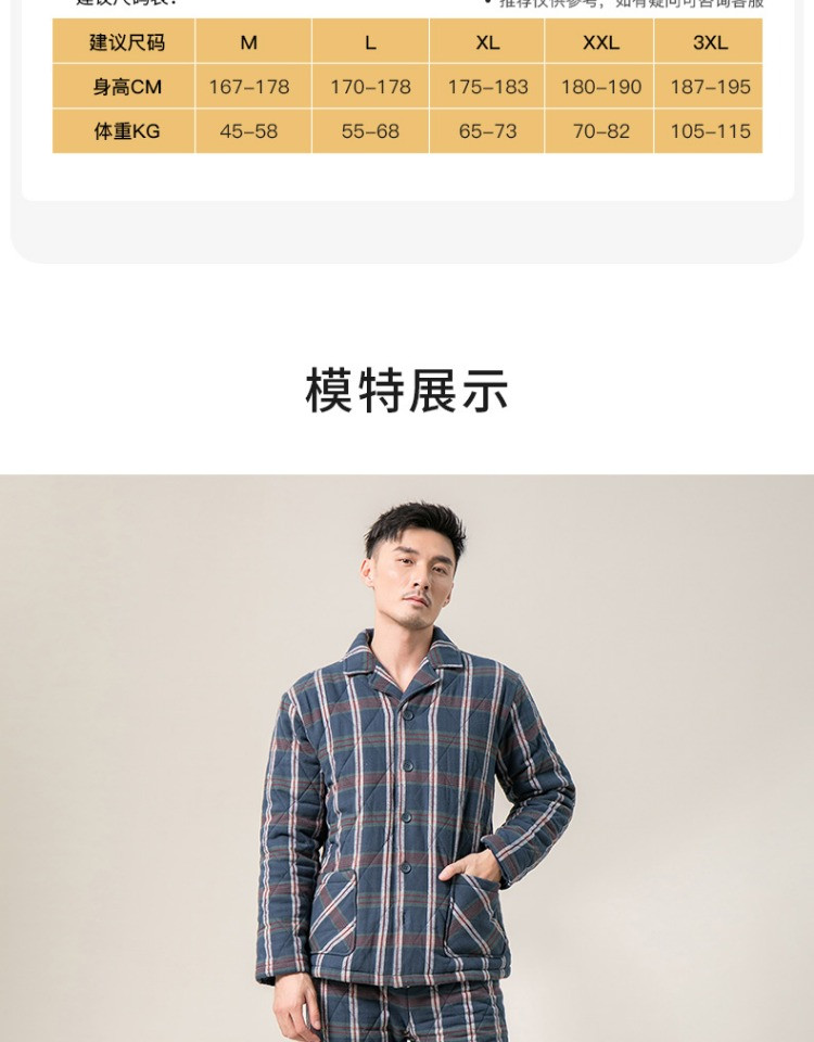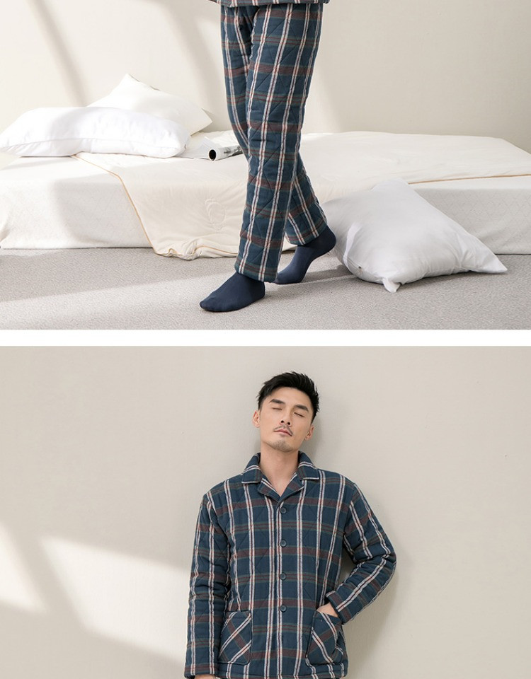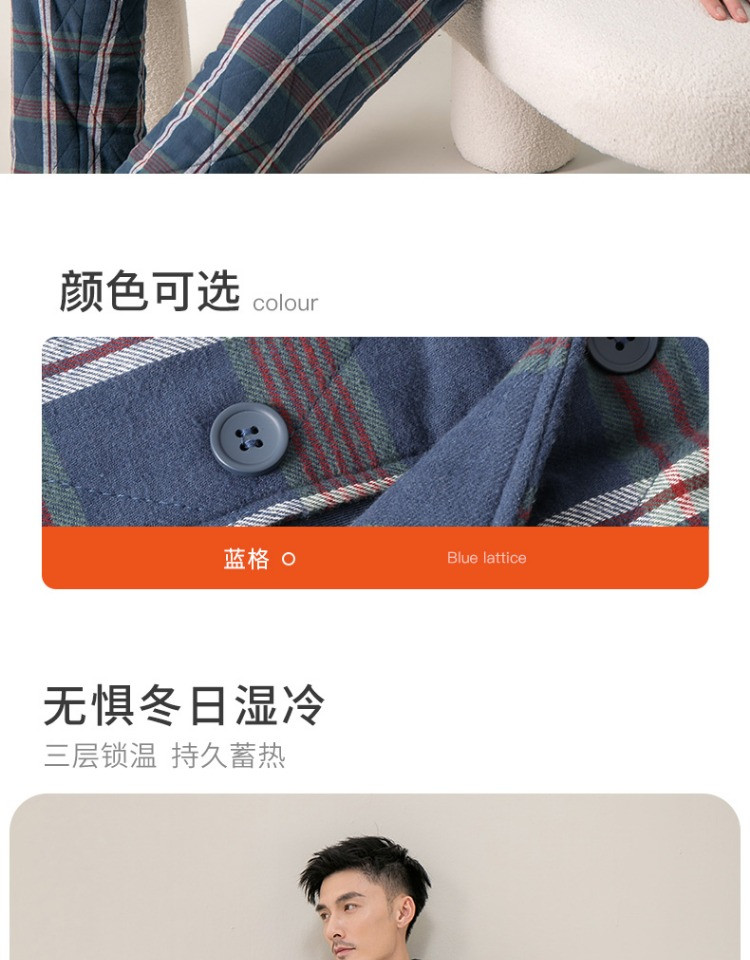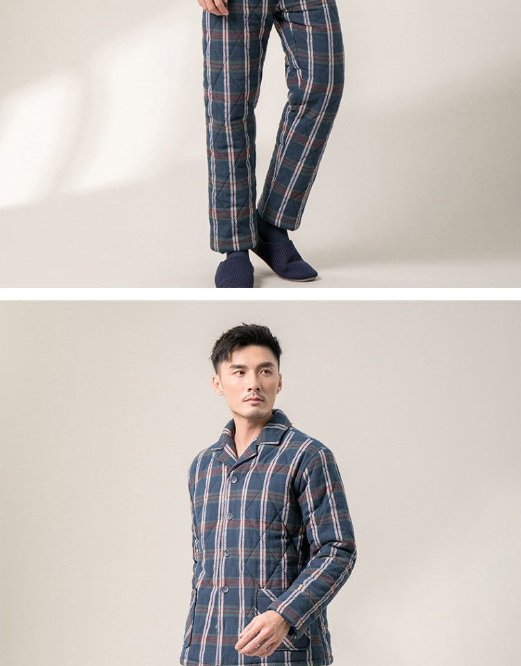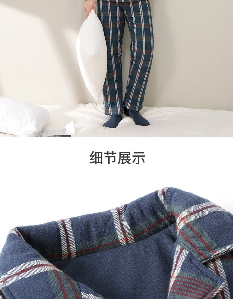 康妮雅睡衣家居服 男式长袖长裤开襟套装*蓝格 厚款
