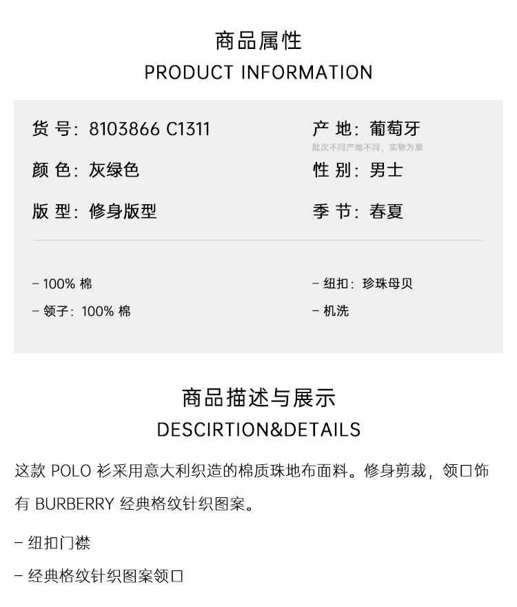 BURBERRY 巴宝莉 男士棉质珠地网眼布面料短袖Polo 衫 灰绿色 8103866 C1311