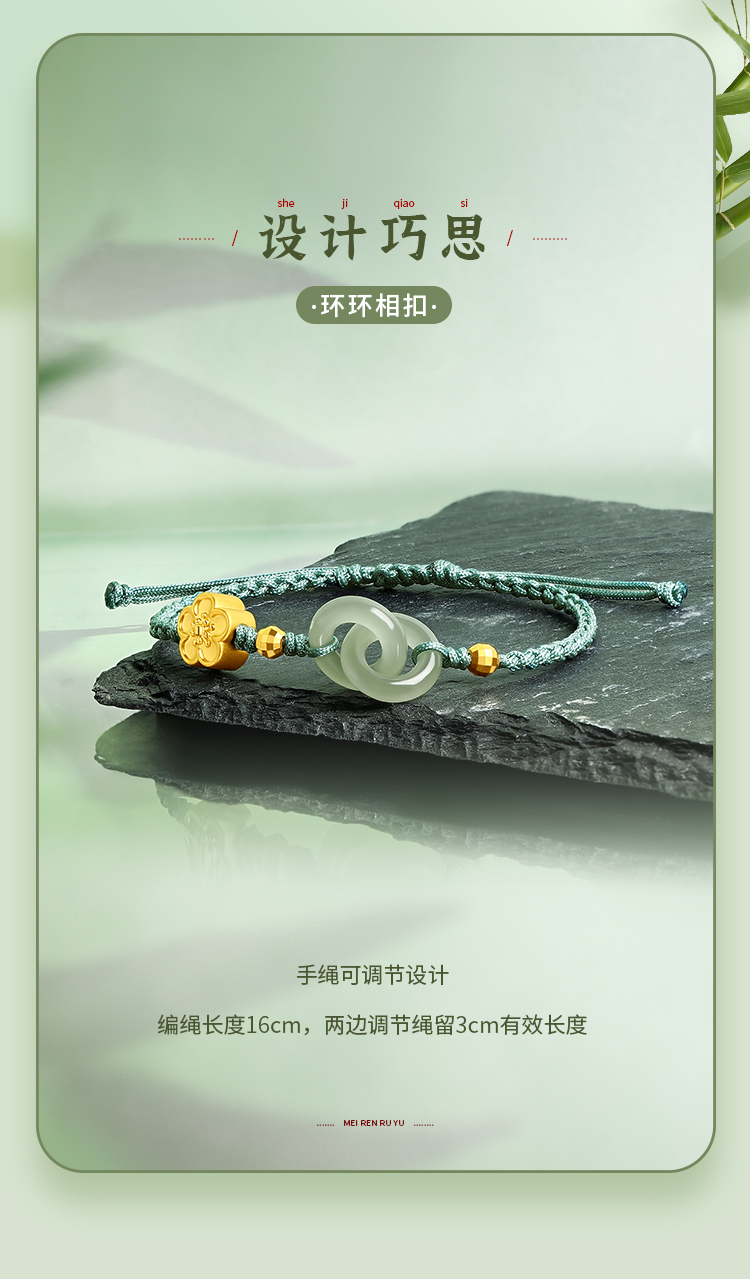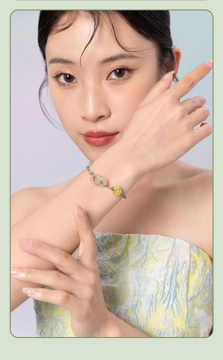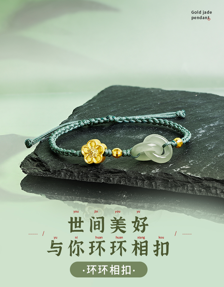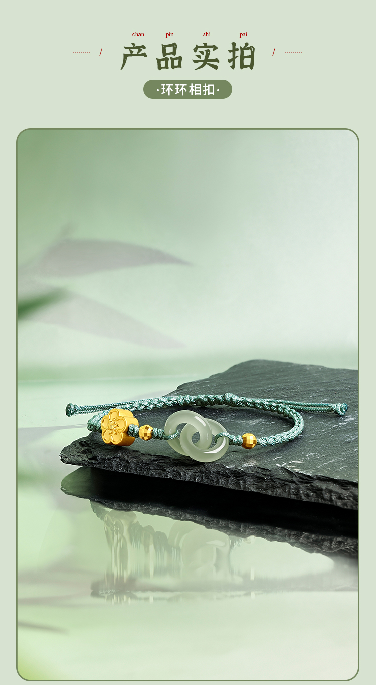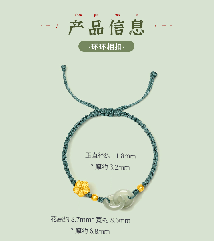 周六福和田玉手绳女黄金玉石桃花环环相扣编绳手链手饰节日礼物