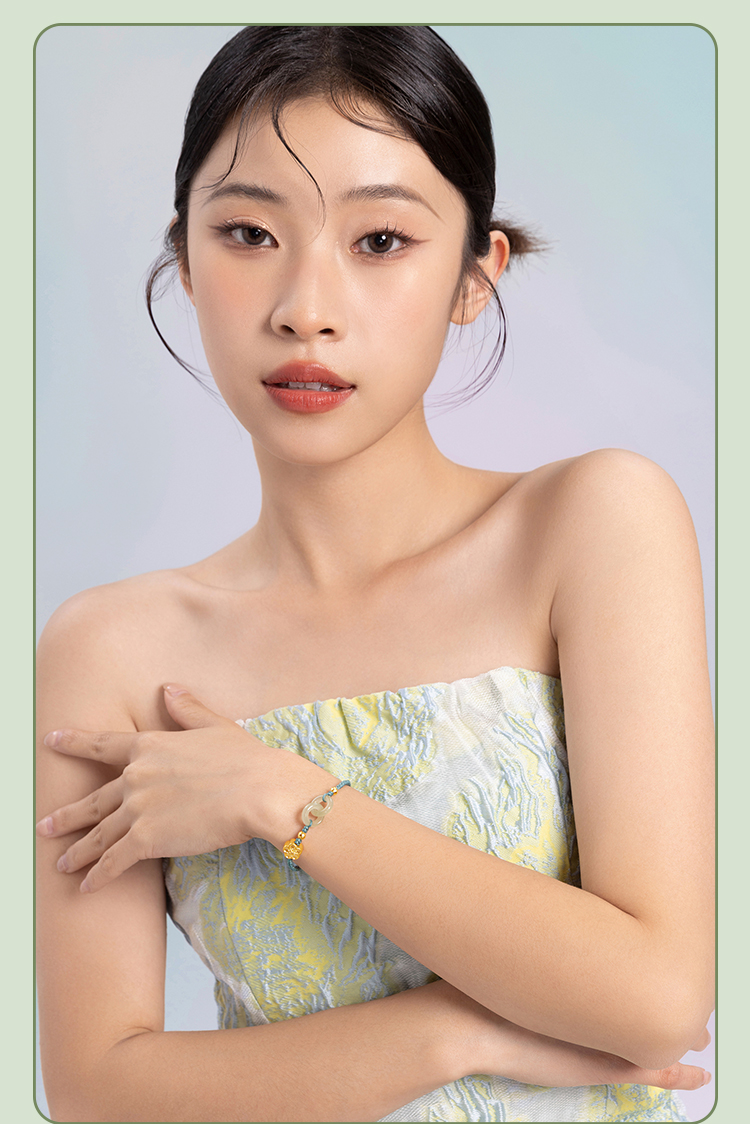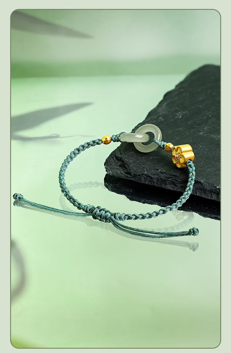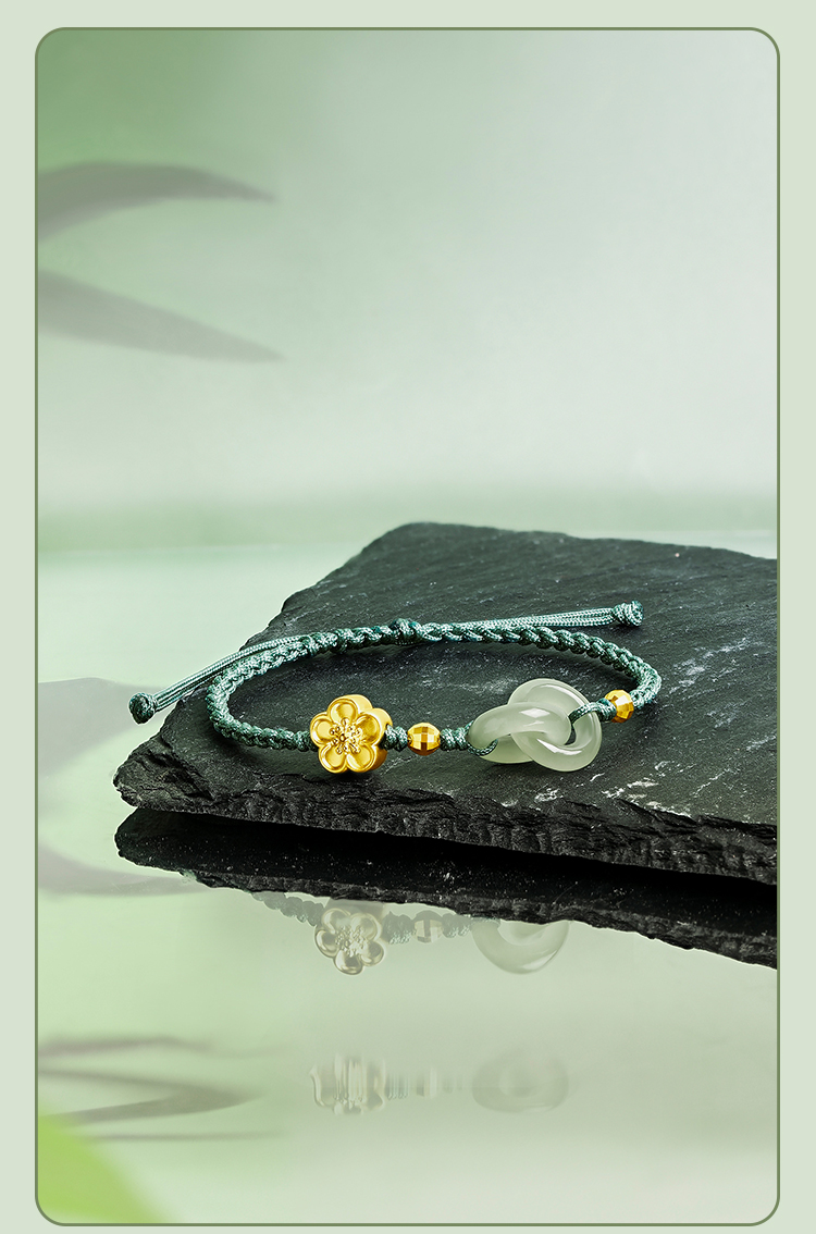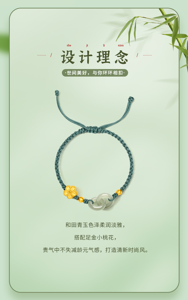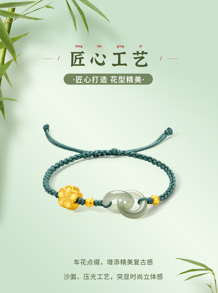 周六福和田玉手绳女黄金玉石桃花环环相扣编绳手链手饰节日礼物