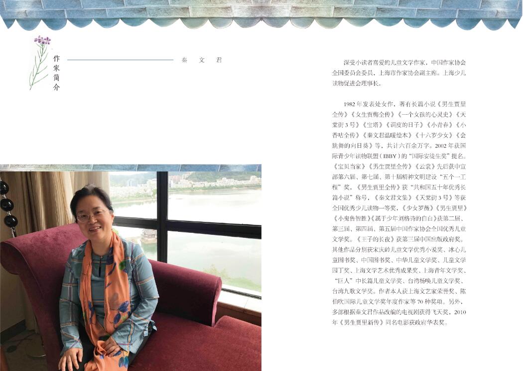 1982 年发表处女作,著有长篇小说《男生贾里 全传》《女生贾梅全传》《一个女孩的心灵史》《天 棠街 3 号》《宝塔》《调皮的日子》《小青春》《小 香咕全传》《秦文君温暖绘本》《十六岁少女》《会 跳舞的向日葵》等,共计六百余万字。2002年获国际儿童读物联盟(IBBY)的“国际安徒生奖”提名。 《宝贝当家》《男生贾里全传》《云裳》先后获中宣 部第六届、第七届、第十届精神文明建设“五个一工 程”奖,《男生贾里全传》获“共和国五十年优秀长 篇小说”称号,《秦文君文集》《天棠街 3 号》等获 全国优秀少儿读物一等奖,《少女罗薇》《男生贾里》 《小鬼鲁智胜》《属于少年刘格诗的自白》获第二届、 第三届、第四届、第五届中国作家协会全国优秀儿童 文学奖。《王子的长夜》获第三届中国出版政府奖。 其他作品分别获宋庆龄儿童文学优秀小说奖、冰心儿 童图书奖、中国图书奖、中华儿童文学奖、儿童文学 园丁奖、上海文学艺术优秀成果奖、上海青年文学奖、 “巨人”中长篇儿童文学奖、台湾杨唤儿童文学奖、 台湾九歌文学奖。作者本人获得上海文艺家荣誉奖, 陈伯吹国际儿童文学奖年度作家等70种奖项。另外, 多部根据秦文君作品改编的电视剧获得飞天奖,2010 年《男生贾里新传》同名电影获政府华表奖。