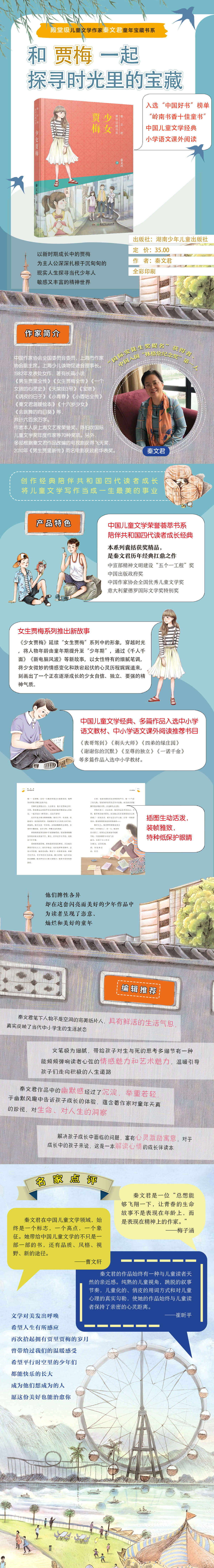 《少女贾梅》是秦文君的*原创作品,一个看似平凡普通的初中女生,和她的伙伴们一起,演绎出一段段丰富多彩又让人感慨万分的成长故事,并因此勾勒出一幅幅当代中学生五彩缤纷的生活画面,富有强烈的艺术感染力。