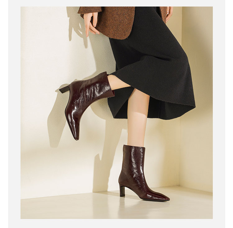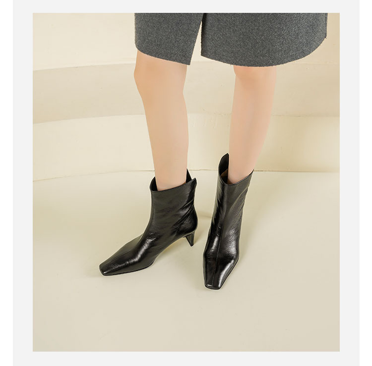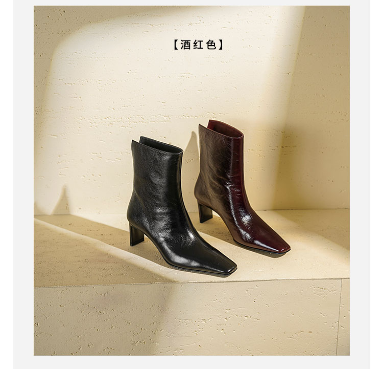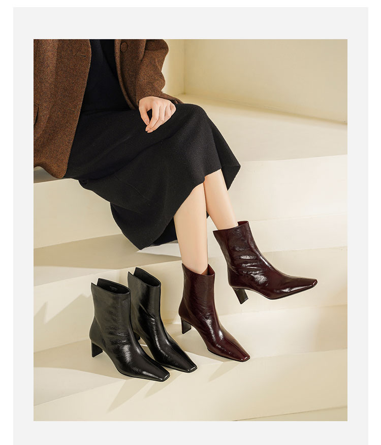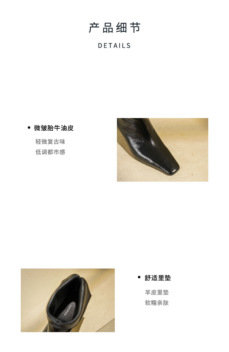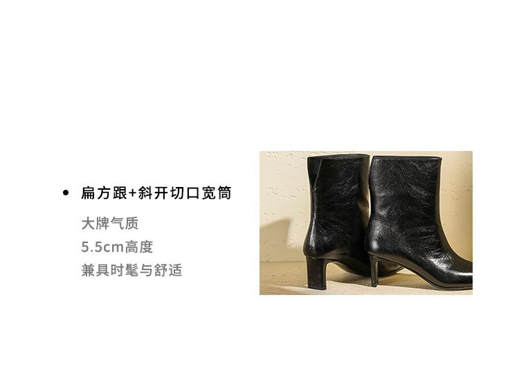Westory2025年冬季小方头中跟抓邹牛油皮一脚蹬极简宽筒气质短靴W25DS85501