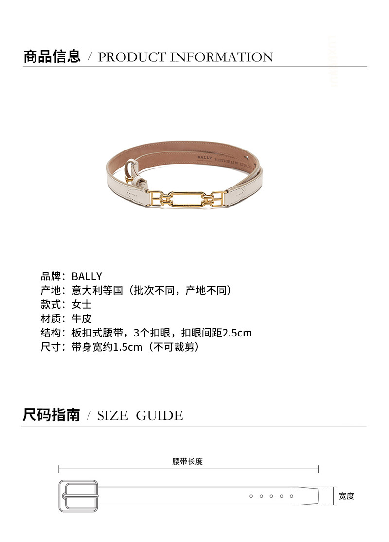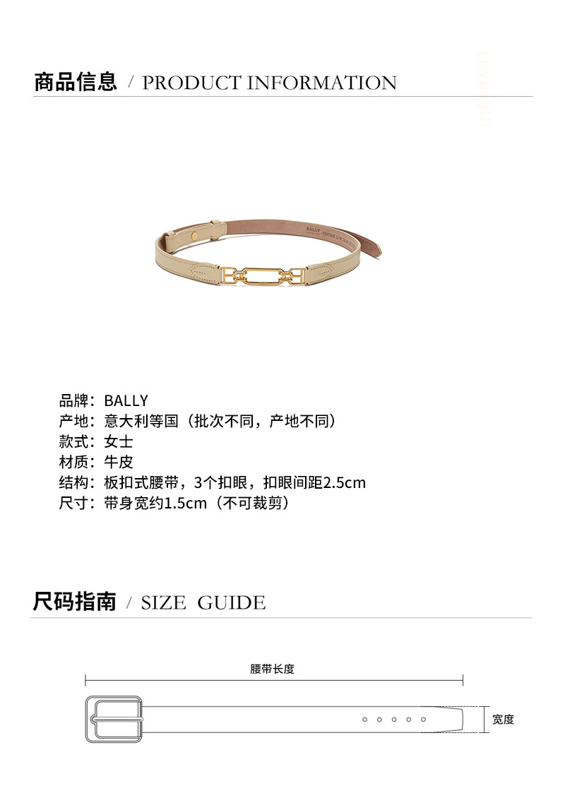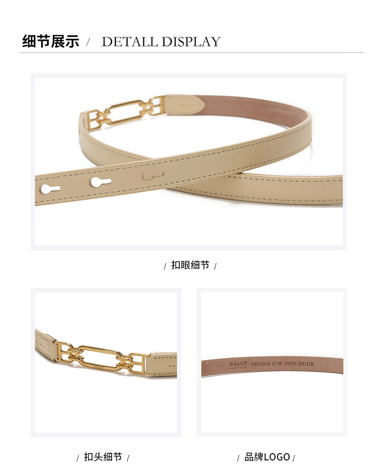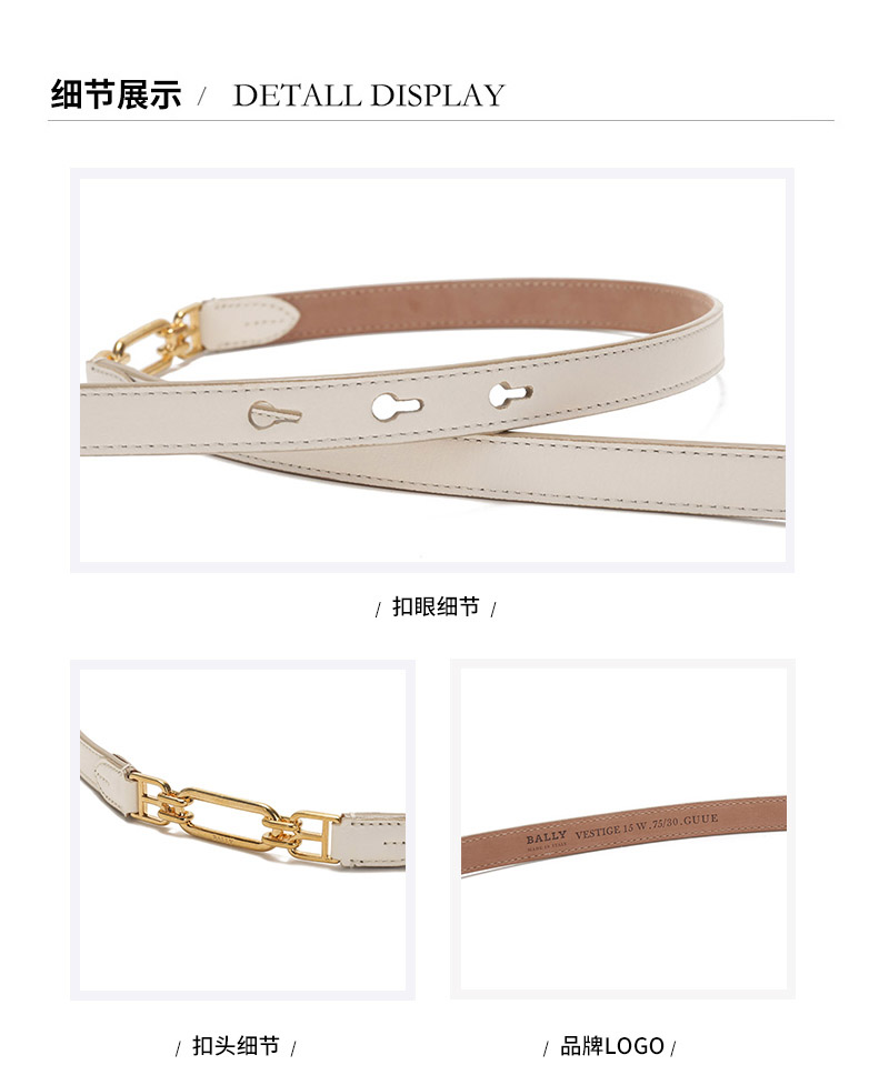 ![]() | 品牌:BALLY/巴利 产地:意大利等国(批次不同,产地不同) 款式:女士 颜色:黑色 材质:牛皮 结构:3个扣眼,长度不可裁剪 尺寸:带身宽约1.5cm,扣眼间距约2.5cm