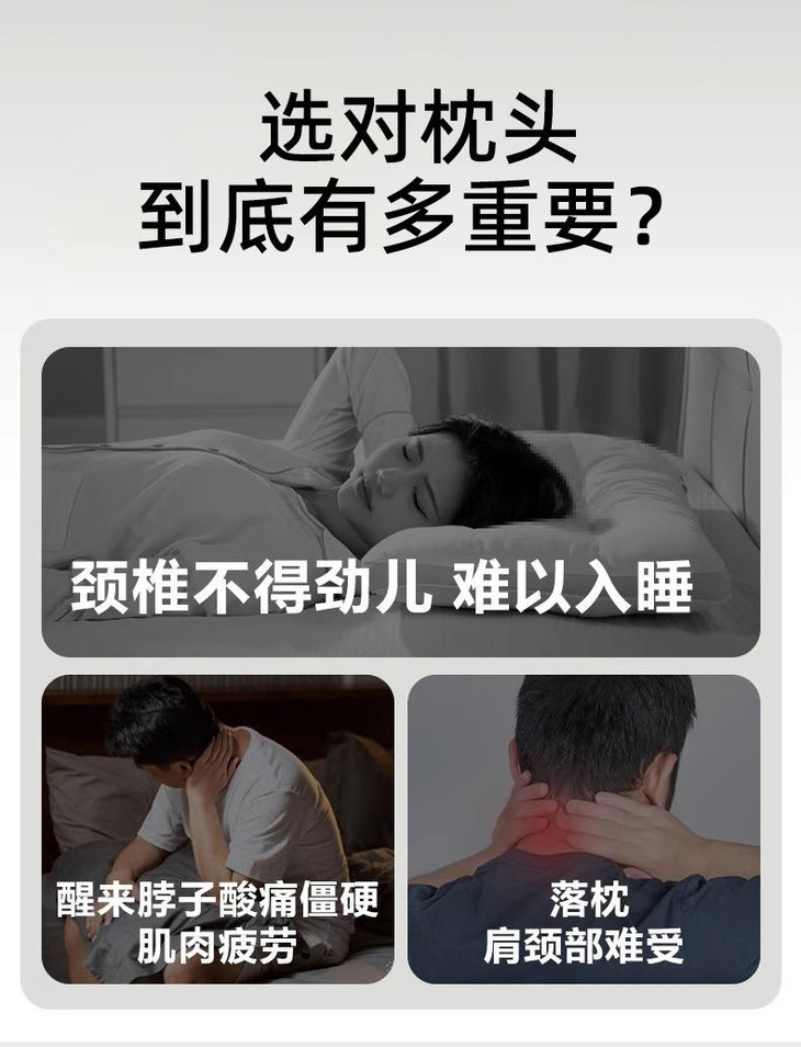 好睡眠是优质生活的起点😴。可现实很扎心,超一半人入睡困难,超七成白天疲乏,80% 的人焦虑,12% 严重打鼾 睡不好,还可能早衰、肥胖 普通枕头设计欠佳,易致血循环不畅,压迫脊椎动脉,局部酸麻,让睡眠质量更差,简直噩梦😭